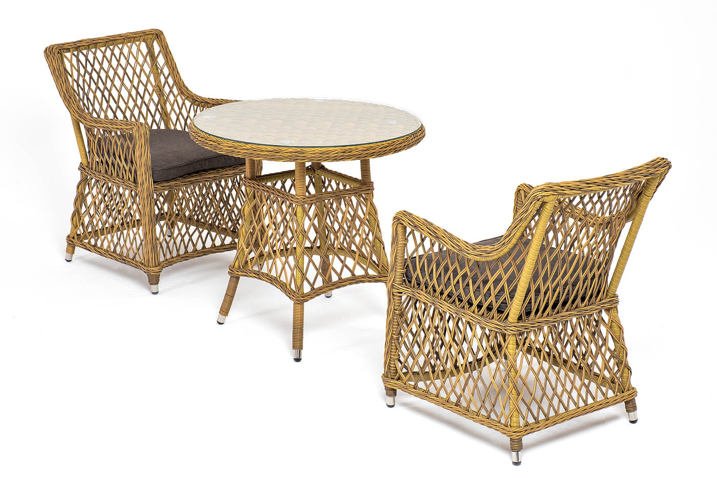 Комплект «Эспрессо–80 L» можно использовать в качестве обеденной группы на 2 персоны или как кофейный комплект на балконе или террасе. В плетеный комплект входит круглый стол «Эспрессо» диаметром 80 см с ударопрочной стеклянной столешницей и 2 кресла коллекции «Латте» 550×660×850 мм. Набор представлен в натуральном соломенном цвете. "Латте" плетеное кресло из искусственного ротанга, цвет соломенный 2шт. 550Х660Х850, "Эспрессо" плетеный круглый стол, диаметр 80 см, цвет соломенный 1шт. 800Х800Х750,Бренд | 4SIS |