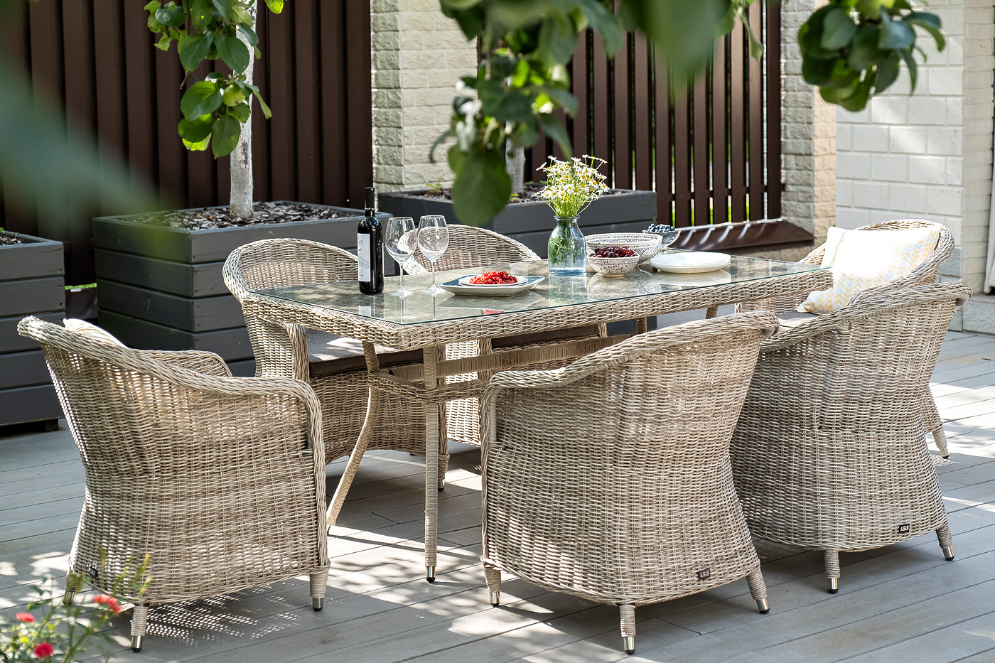 Премиальная обеденная группа «Эспрессо» для большой компании. В набор входит большой прямоугольный стол «Латте», размером - 1600×900×750 мм и 6 кресел «Равенна», размер - 570×680×810 мм, в бежевом оттенке. Каркас всех предметов мебели изготовлен из легкого и прочного алюминия, оплетенного вручную искусственным ротангом. Стол для удобства использования накрыт прочным стеклом, кресла укомплектованы подушками со съёмными чехлами серого цвета. Вы можете заказать любое количество элементов из данного набора. "Латте" плетеный стол из искусственного ротанга 160х90см, цвет бежевый 1шт. 1 600Х900Х750, "Равенна" плетеное кресло из искусственного ротанга, цвет бежевый 6шт. 570Х680Х810,Бренд | 4SIS |