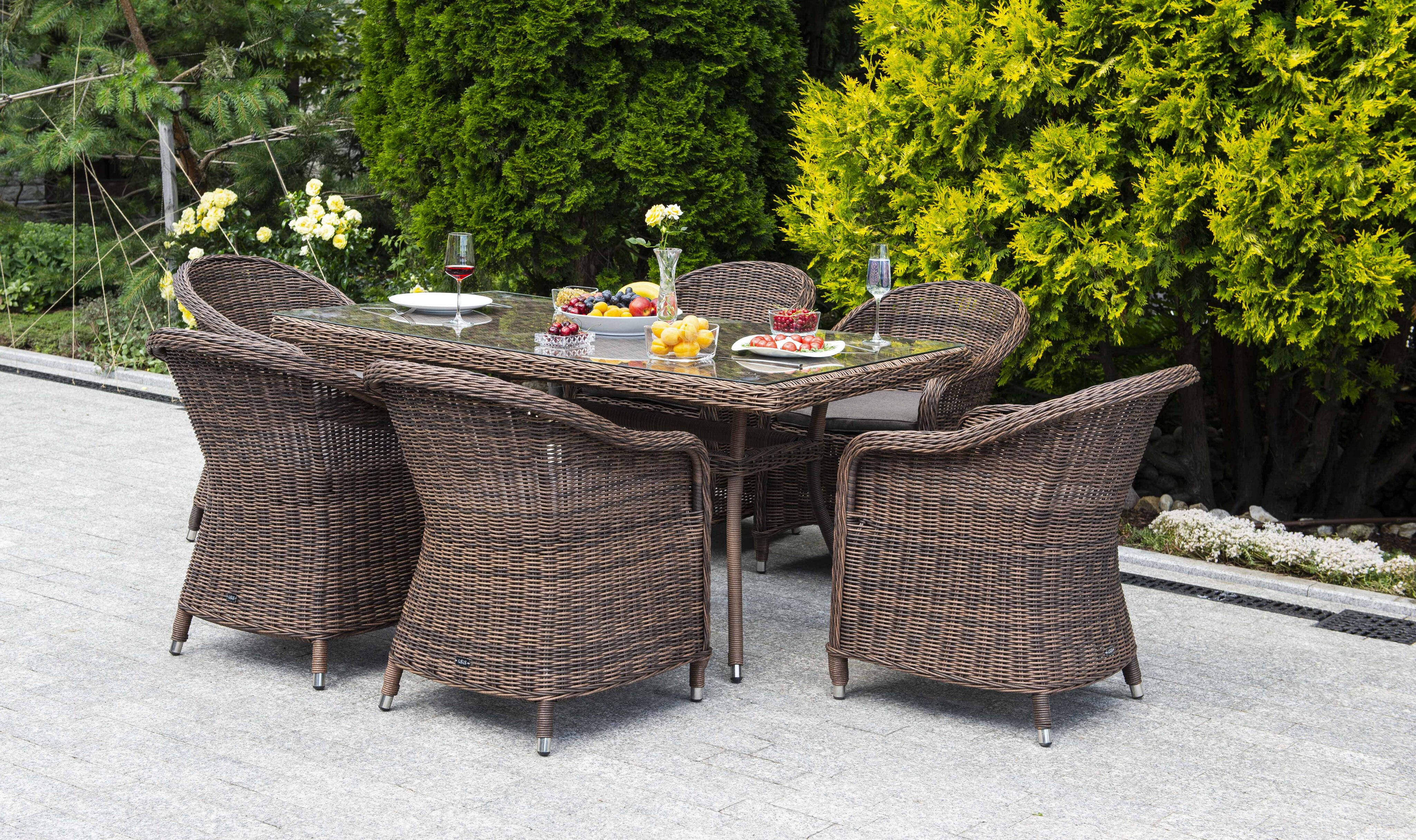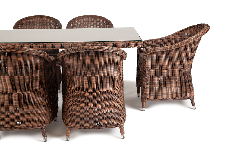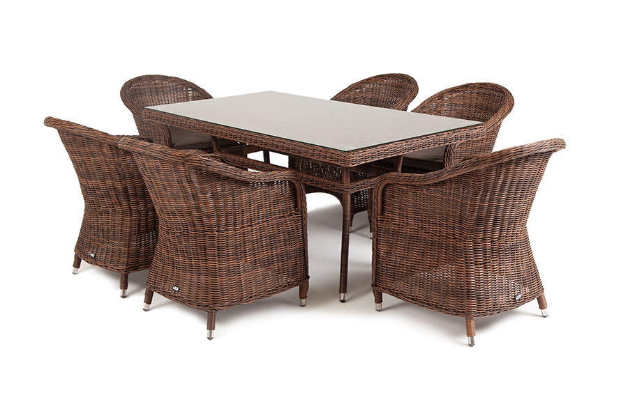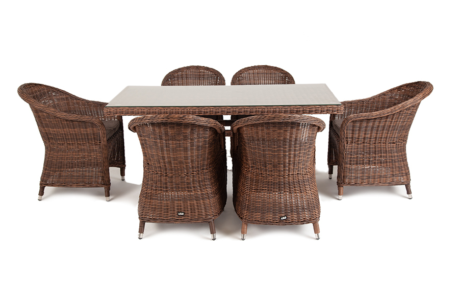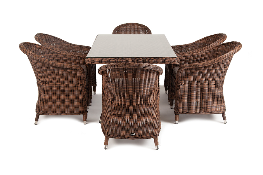 Премиальная обеденная группа для сада, веранды ресторана «Эспрессо» для большой компании. В набор входит большой прямоугольный стол «Латте», размером - 1600×900×750 мм и 6 кресел «Равенна», размер - 570×680×810 мм, в насыщенном коричневом оттенке. Каркас всех предметов мебели изготовлен из легкого и прочного алюминия, оплетенного вручную долговечным искусственным ротангом. Стол для удобства использования накрыт прочным стеклом, кресла укомплектованы подушками со съёмными чехлами серого цвета. Вы можете заказать любое количество элементов из данного набора. Свяжитесь с нами для подбора индивидуальной комплектации. "Латте" плетеный стол из искусственного ротанга 160х90см, цвет коричневый 1шт. 1 600Х900Х750, "Равенна" плетеное кресло из искусственного ротанга, цвет коричневый 6шт. 570Х680Х810,Бренд | 4SIS |