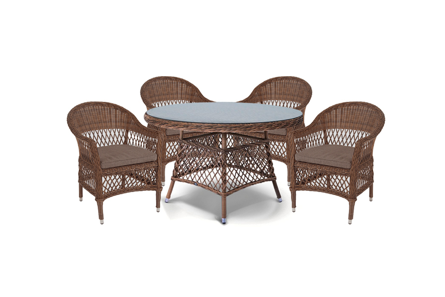 Обеденная группа из коллекции «Эспрессо» коричневого цвета состоит из: - круглого стола, диаметром 1200 мм. - 4 кресел «Сицилия» - 590×640×820 мм. Вся мебель изготовлена из алюминия, поэтому ее очень легко перемещать. Декоративное покрытие выполнено из долговечного искусственного ротанга, устойчивого к перепадам температур и переменам погоды. Столешница изготовлена из прочного закаленного стекла 5 мм, кресла укомплектованы подушками серого цвета со съёмными чехлами. "Эспрессо" плетеный круглый стол, диаметр 118 см, цвет коричневый 1шт. 1 180Х1 180Х750, "Сицилия" плетеный стул из искусственного ротанга, цвет коричневый 4шт. 590Х640Х820,Бренд | 4SIS |