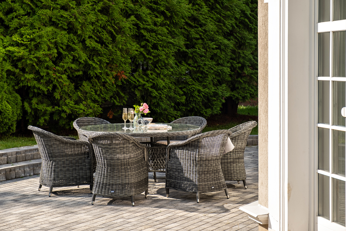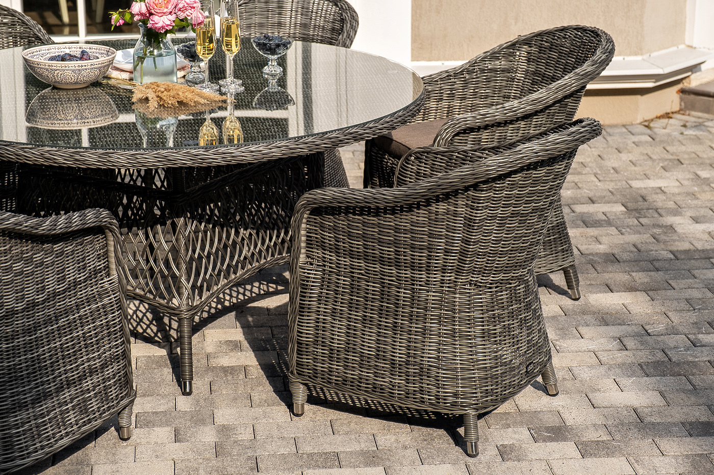 В комплект входит: - круглый обеденный стол «Эспрессо» (1500×1500×750 мм) с ударопрочной стеклянной столешницей; - 6 кресел коллекции «Равенна» (570×680×810 мм). Вся мебель изготовлена из долговечного и легкого алюминия, обтянутого синтетическим ротангом. На столе для удобства эксплуатации предусмотрена столешница из ударопрочного закаленного стекла 5 мм. Стулья укомплектованы подушками на сидениях. "Равенна" плетеное кресло из искусственного ротанга, цвет графит 6шт. 570Х680Х810, "Эспрессо" плетеный круглый стол, диаметр 150 см, цвет графит 1шт. 1 500Х1 500Х750,Бренд | 4SIS |