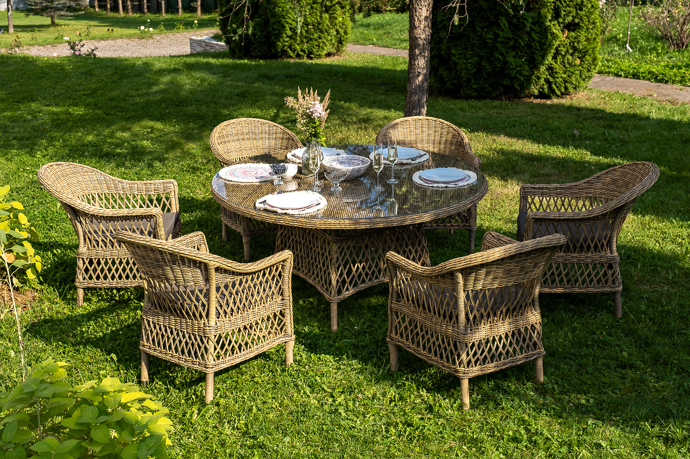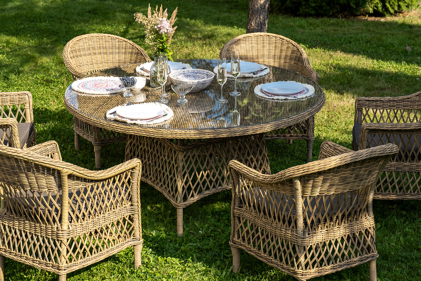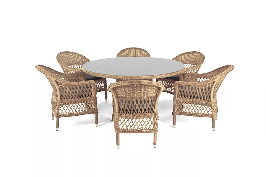 В комплект входит круглый обеденный стол «Эспрессо» (1500×1500×750 мм) с ударопрочной стеклянной столешницей и 6 кресел коллекции «Сицилия» (590×640×820 мм). Цвет - соломенный. Вся мебель изготовлена из долговечного и легкого алюминия, обтянутого синтетическим ротангом. На столе для удобства эксплуатации предусмотрена столешница из ударопрочного закаленного стекла 5 мм. Стулья укомплектованы подушками на сидениях. "Эспрессо" плетеный круглый стол, диаметр 150 см, цвет соломенный 1шт. 1 500Х1 500Х750, "Сицилия" плетеный стул из искусственного ротанга, цвет соломенный 6шт. 590Х640Х820,Бренд | 4SIS |