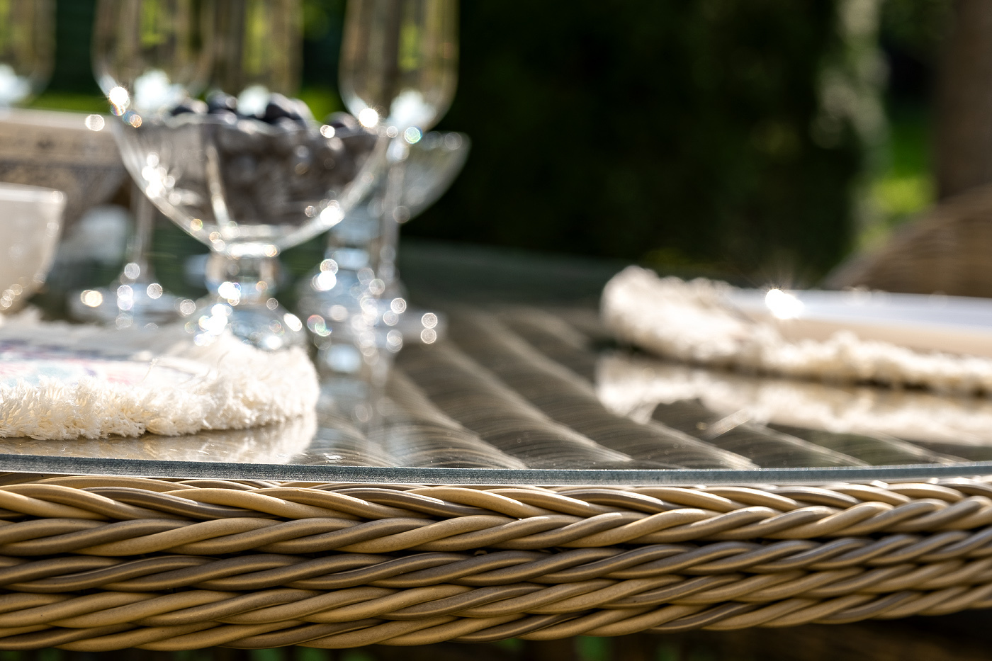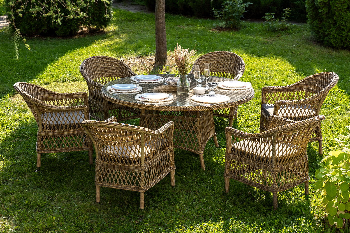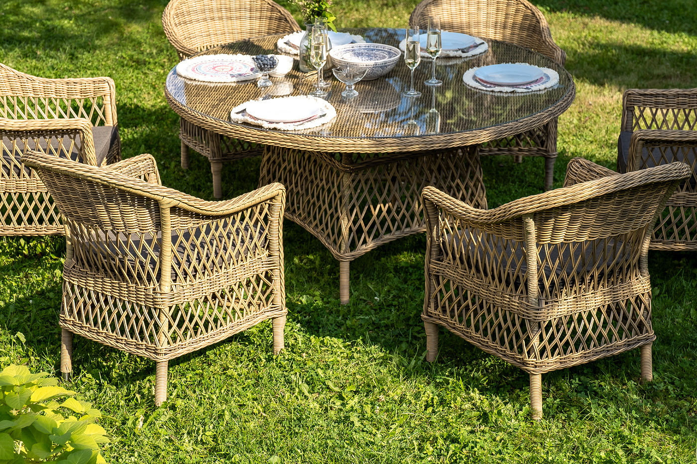 В комплект входит круглый обеденный стол «Эспрессо» (1500×1500×750 мм) с ударопрочной стеклянной столешницей и 6 кресел коллекции «Сицилия» (590×640×820 мм). Цвет - соломенный. Вся мебель изготовлена из долговечного и легкого алюминия, обтянутого синтетическим ротангом. На столе для удобства эксплуатации предусмотрена столешница из ударопрочного закаленного стекла 5 мм. Стулья укомплектованы подушками на сидениях. "Эспрессо" плетеный круглый стол, диаметр 150 см, цвет соломенный 1шт. 1 500Х1 500Х750, "Сицилия" плетеный стул из искусственного ротанга, цвет соломенный 6шт. 590Х640Х820,Бренд | 4SIS |