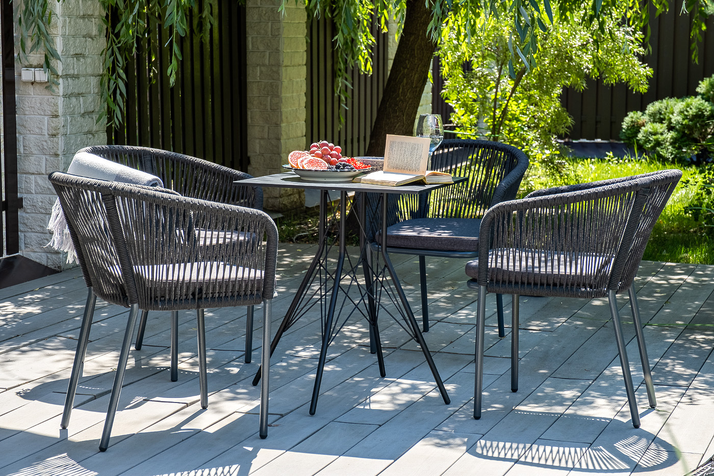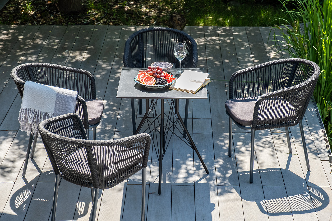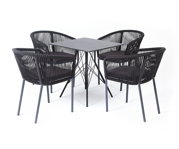 Обеденная группа «Форли» для интерьерных решений. Состоит из квадратного обеденного стола «Конте» со столешницей, размером 70×70 см. Материал столешницы выполнен из высококачественного монолитного компакт-пластика HPL в цвете «серый гранит». Подстолье - нержавеющая сталь черного цвета. 4 кресла из коллекции «Марсель», выполненных из алюминиевого каркаса и ручной оплетки роупом. Это эластичные синтетические ленты из высокопрочных полиэфирных волокон, представлены в темно-сером цвете. В комплект также входят подушки с влагоотталкивающими съёмными чехлами, цвет аналогичный темно-серый. Возможно изготовление стола любого размера и формы по индивидуальному заказу. "Конте" интерьерный стол из HPL 70x70см, цвет "серый гранит" 1шт. 700Х700Х750, "Марсель" стул плетеный из роупа, каркас алюминий темно-серый (RAL7024) муар, роуп темно-серый круглый, ткань темно-серая 027 4шт. 570Х620Х775,Бренд | 4SIS |