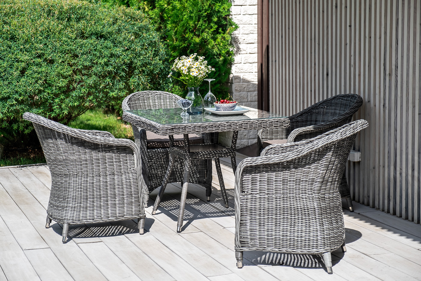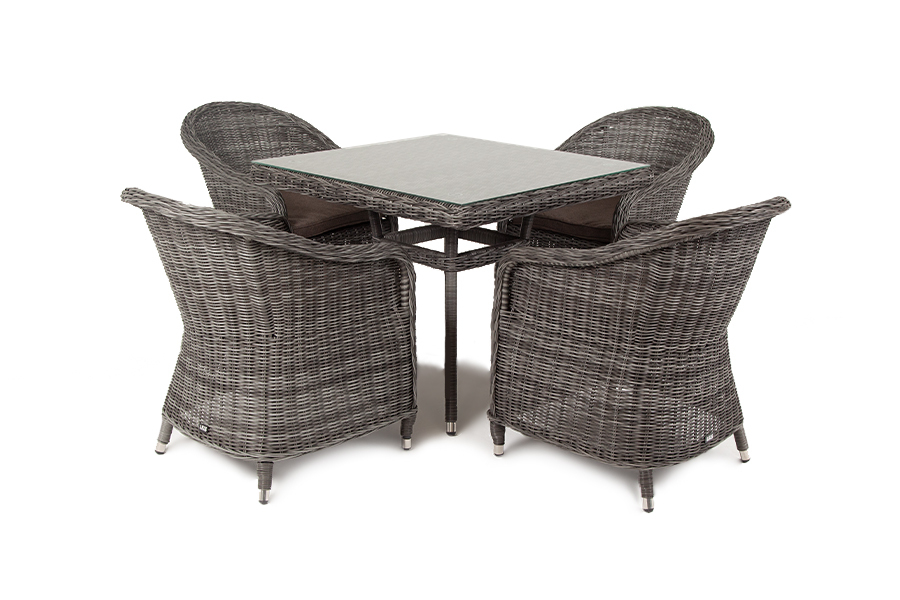 Уличная обеденная группа «Фредо» для обустройства зоны отдыха. Комплект состоит из: квадратного обеденного стола «Айриш» - 900×900×750 мм и 4 кресел «Равенна» - 570×680×810 мм в графитовом цвете. Вся мебель изготовлена из алюминия, поэтому ее очень легко перемещать. Декоративное покрытие выполнено из долговечного искусственного ротанга, устойчивого к перепадам температур и переменам погоды. Столешница изготовлена из прочного закаленного стекла 5 мм, кресла укомплектованы подушками серого цвета со съёмными чехлами. Эта обеденная группа доступна также в других оттенках. "Айриш" стол плетеный из искусственного ротанга, цвет графит 1шт. 900Х900Х750, "Равенна" плетеное кресло из искусственного ротанга, цвет графит 4шт. 570Х680Х810,Бренд | 4SIS |