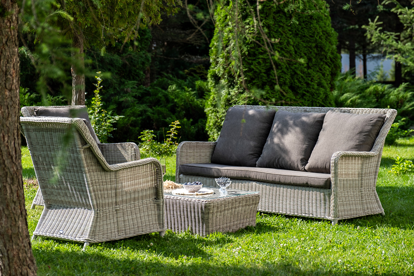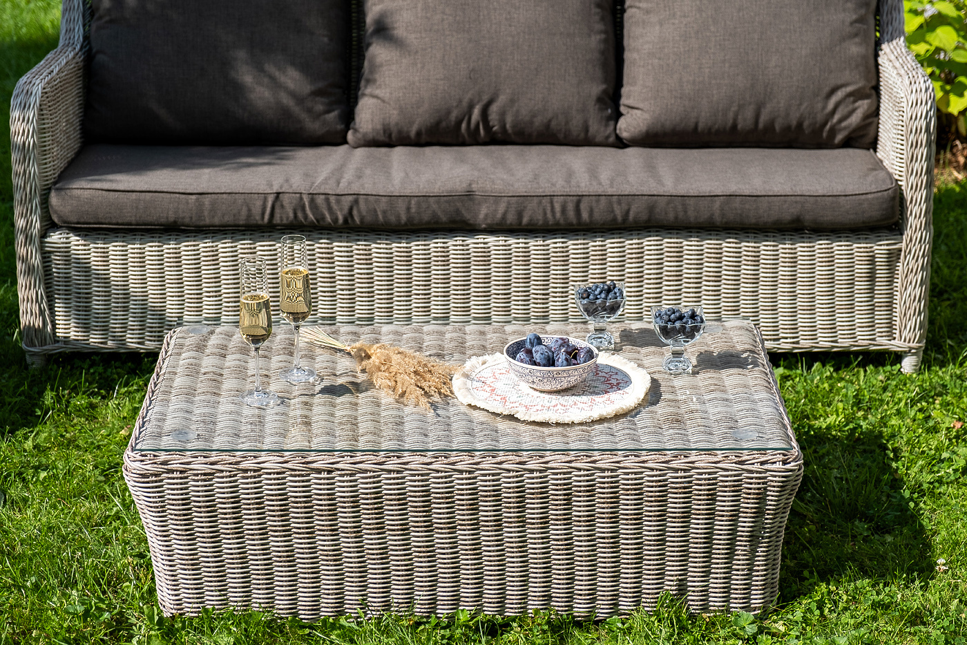 Вместительная лаунж-зона «Гляссе» состоит из: - трехместного дивана – 1900×880×990 мм. - двух кресел – 730×880×990 мм. - журнального столика – 1100×660×340 мм. Модели имеют алюминиевый каркас, который оплетен вручную искусственным ротангом бежевого цвета. Плетеная мебель дополнена удобными подушками в серых чехлах. При их изготовлении используют полиэстер, плотность – 300гр/м2. Он обрабатывается влагоотталкивающей пропиткой для повышения защитных свойств материала. Журнальный столик оснащен столешницей из закаленного стекла толщиной 5 мм. На ножках закриплены пластиковые загрушки, предотвращающие царапины на поверхности пола. "Гляссе" диван трехместный из искусственного ротанга, цвет бежевый 1шт. 1 900Х880Х990, "Гляссе" кресло плетеное из искусственного ротанга, цвет бежевый 2шт. 730Х880Х990, "Капучино" журнальный столик из искусственного ротанга, цвет бежевый 1шт. 1 100Х660Х340,Бренд | 4SIS |