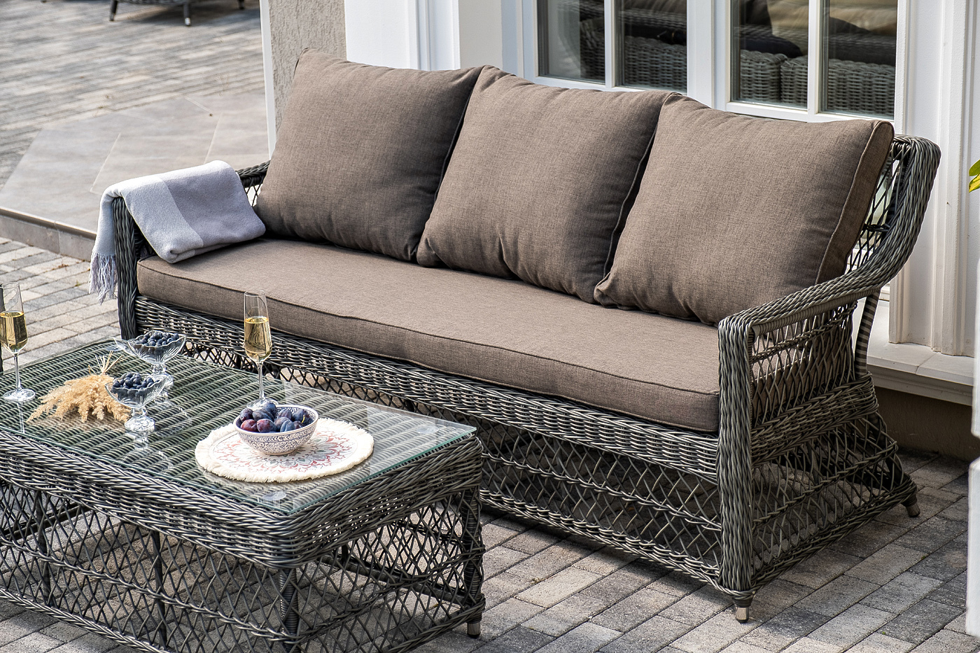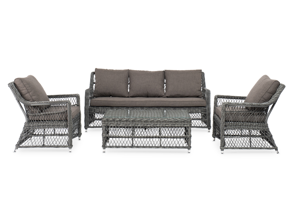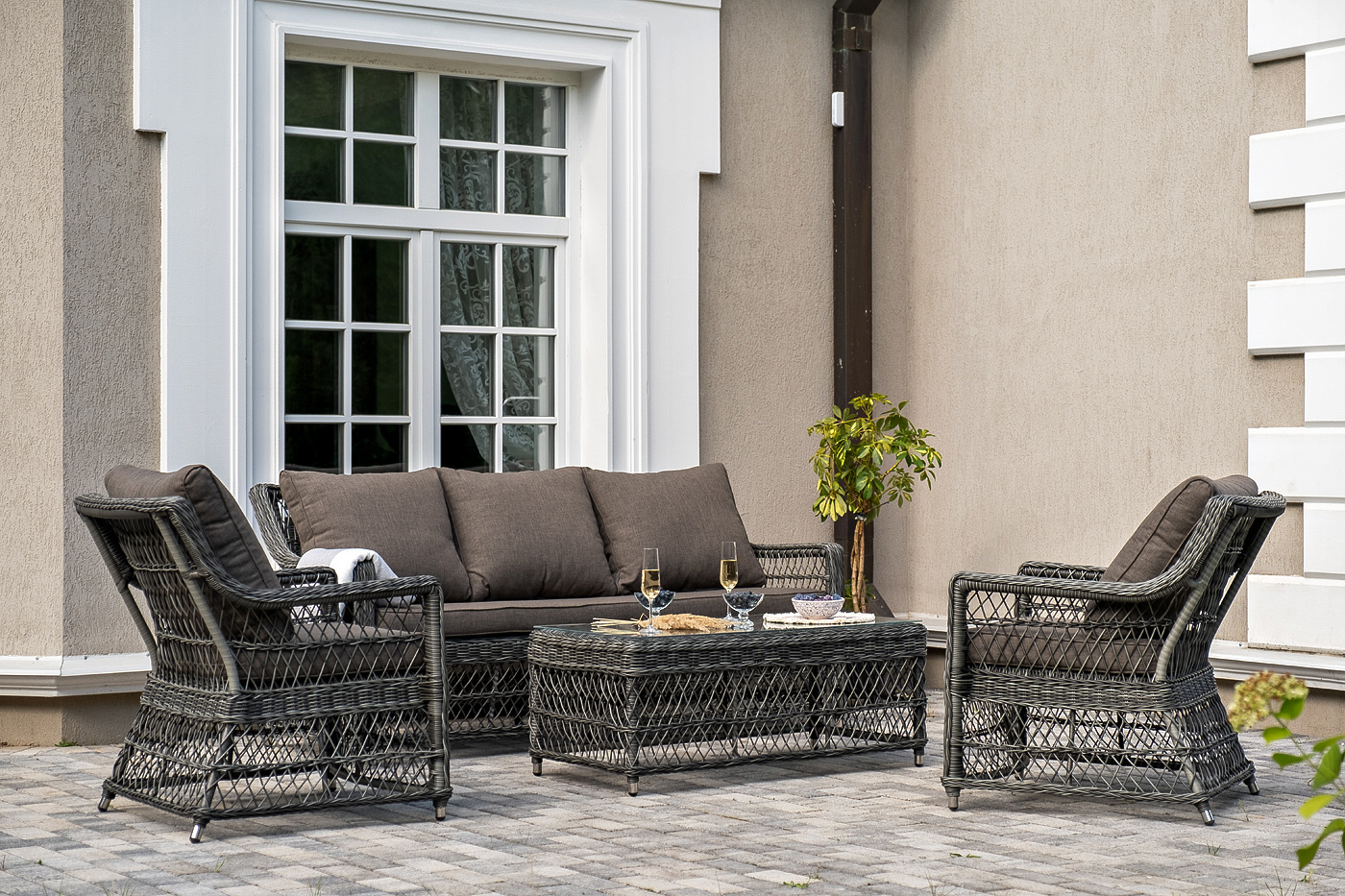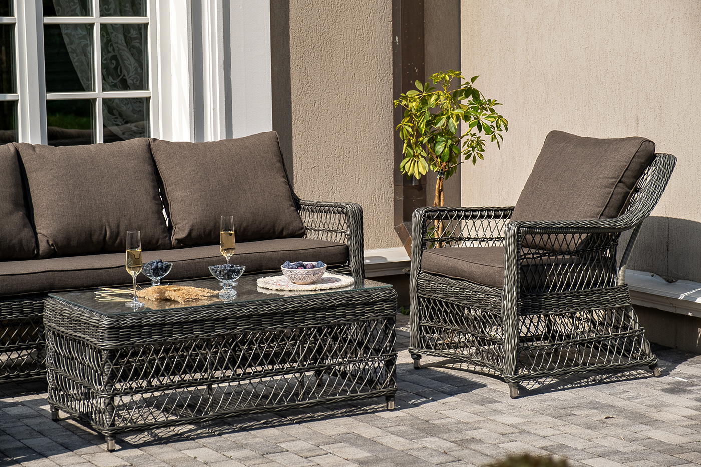 Лаунж-зона «Гранд Латте» включает в себя все необходимое для полноценного отдыха и рассчитана на одновременное размещение пяти персон. Плетеный комплект состоит из: - трехместного дивана, размер – 1875×830×850 мм. - двух кресел, размер – 720×830×850 мм. - журнального столика, размер – 1120×570×450 мм. Уличная мебель имеет алюминиевый каркас с ручным плетением из искусственного ротанга в цвете "графит". Предусмотрены мягкие подушки из полиэстера серого цвета с плотностью 300гр/м2. Они имеет влагоотталкивающую пропитку. Рабочая поверхность столика изготовлена из закаленного стекла толщиной 5 мм. "Гранд Латте" диван трехместный из искусственного ротанга, цвет графит 1шт. 1 875Х830Х850, "Гранд Латте" кресло из искусственного ротанга, цвет графит 2шт. 720Х830Х850, "Гранд Латте" стол журнальный из искусственного ротанга, цвет графит 1шт. 1 120Х570Х450,Бренд | 4SIS |