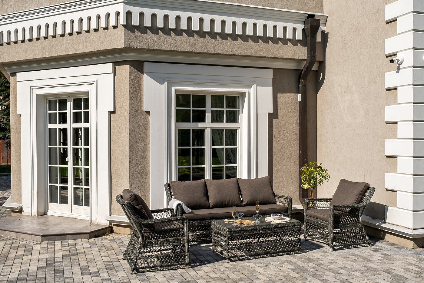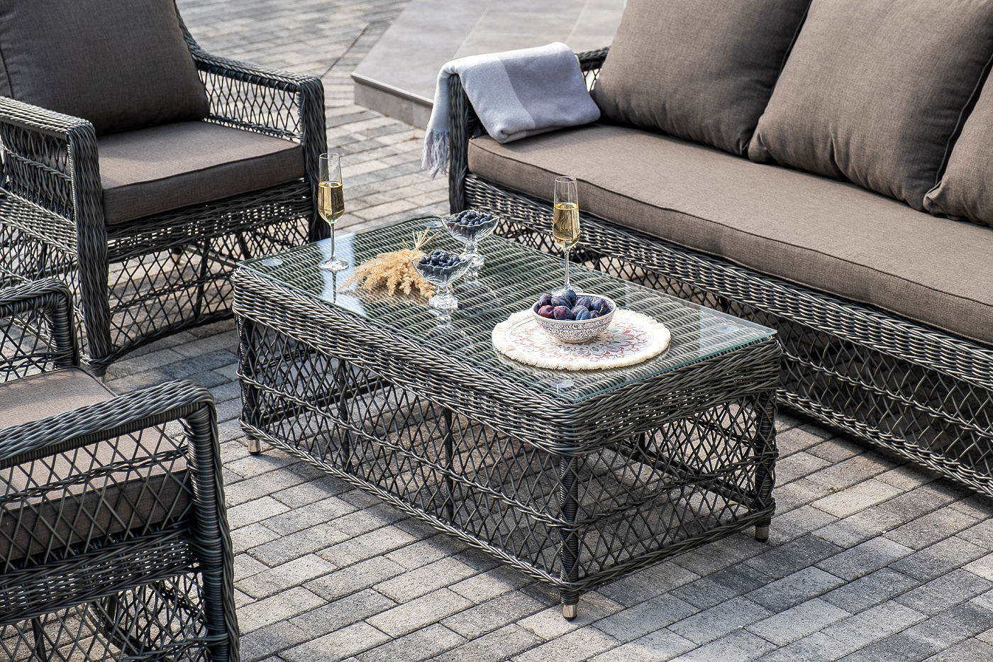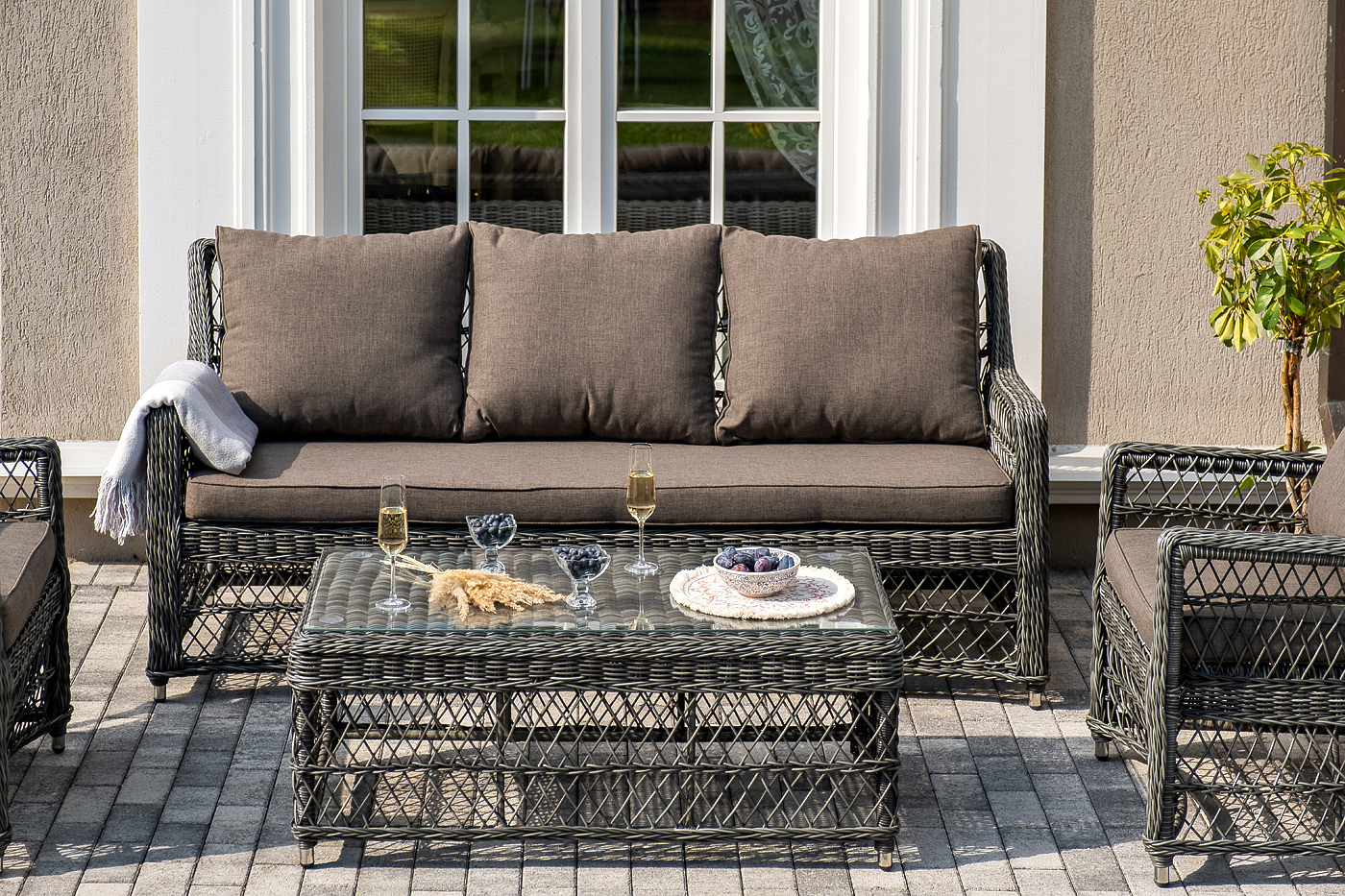 Лаунж-зона «Гранд Латте» включает в себя все необходимое для полноценного отдыха и рассчитана на одновременное размещение пяти персон. Плетеный комплект состоит из: - трехместного дивана, размер – 1875×830×850 мм. - двух кресел, размер – 720×830×850 мм. - журнального столика, размер – 1120×570×450 мм. Уличная мебель имеет алюминиевый каркас с ручным плетением из искусственного ротанга в цвете "графит". Предусмотрены мягкие подушки из полиэстера серого цвета с плотностью 300гр/м2. Они имеет влагоотталкивающую пропитку. Рабочая поверхность столика изготовлена из закаленного стекла толщиной 5 мм. "Гранд Латте" диван трехместный из искусственного ротанга, цвет графит 1шт. 1 875Х830Х850, "Гранд Латте" кресло из искусственного ротанга, цвет графит 2шт. 720Х830Х850, "Гранд Латте" стол журнальный из искусственного ротанга, цвет графит 1шт. 1 120Х570Х450,Бренд | 4SIS |