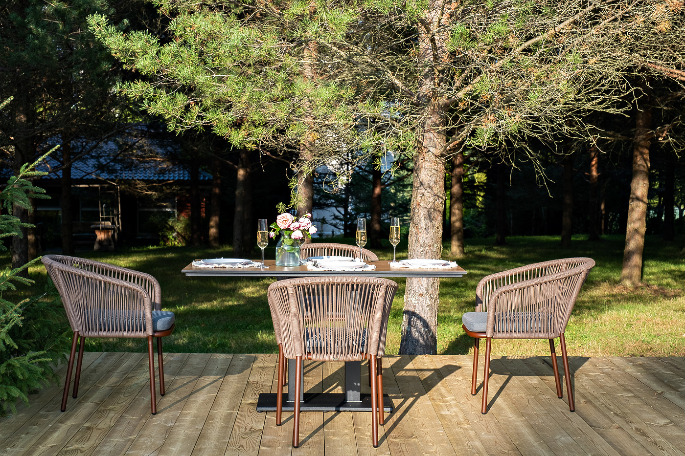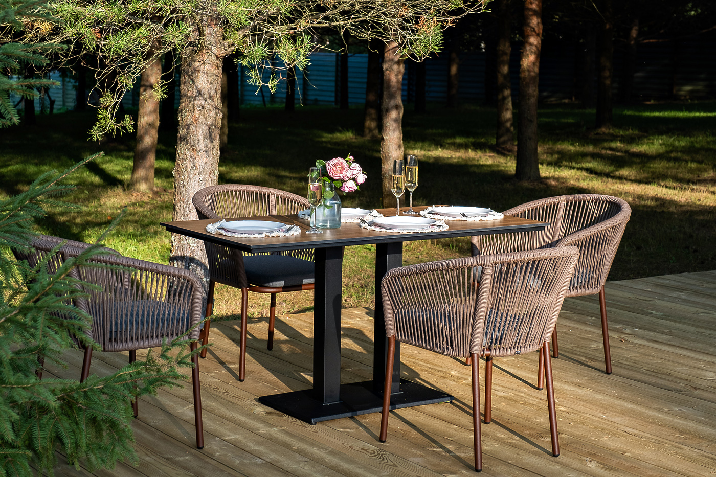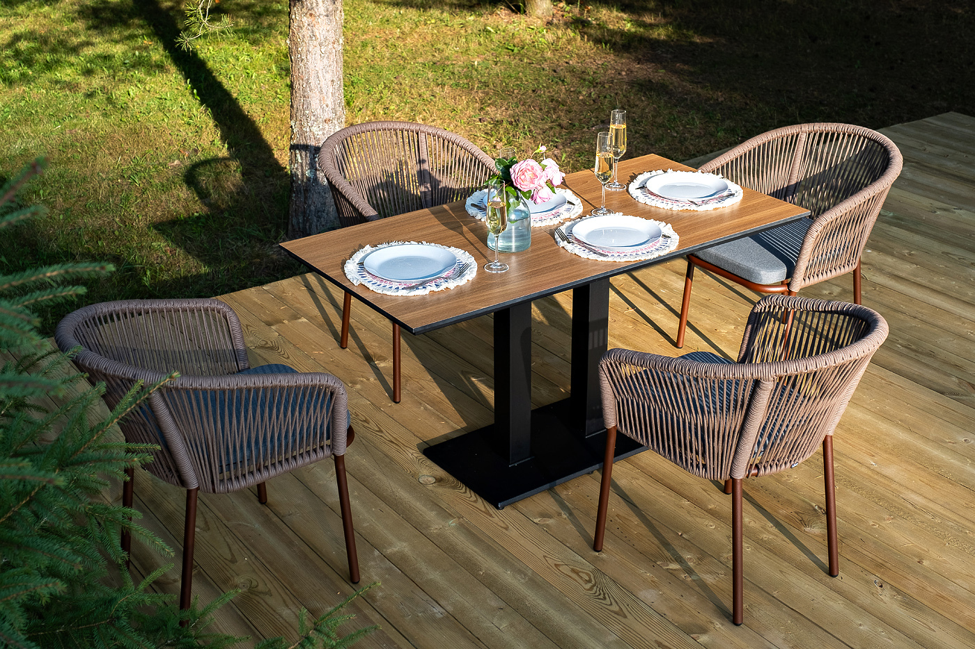 Обеденная группа «Каффе Дабл» рассчитана на 4 персоны. В состав комплекта входит: - Стол «Каффе» из HPL, размер столешницы - 140×70 см, цвет «дуб», подстолье двойное черное металл. - 4 плетеных стула «Марсель» из круглого роупа, размером - 570×620×775 мм, цвет каркас и роупа - коричневый. "Каффе" обеденный стол из HPL 140х70см, цвет "дуб", подстолье двойное черное 1шт. 1 400Х700Х750, "Марсель" стул плетеный из роупа, каркас алюминий коричневый (RAL8016) муар, роуп коричневый круглый, ткань темно-серая 027 4шт. 570Х620Х775,Бренд | 4SIS |