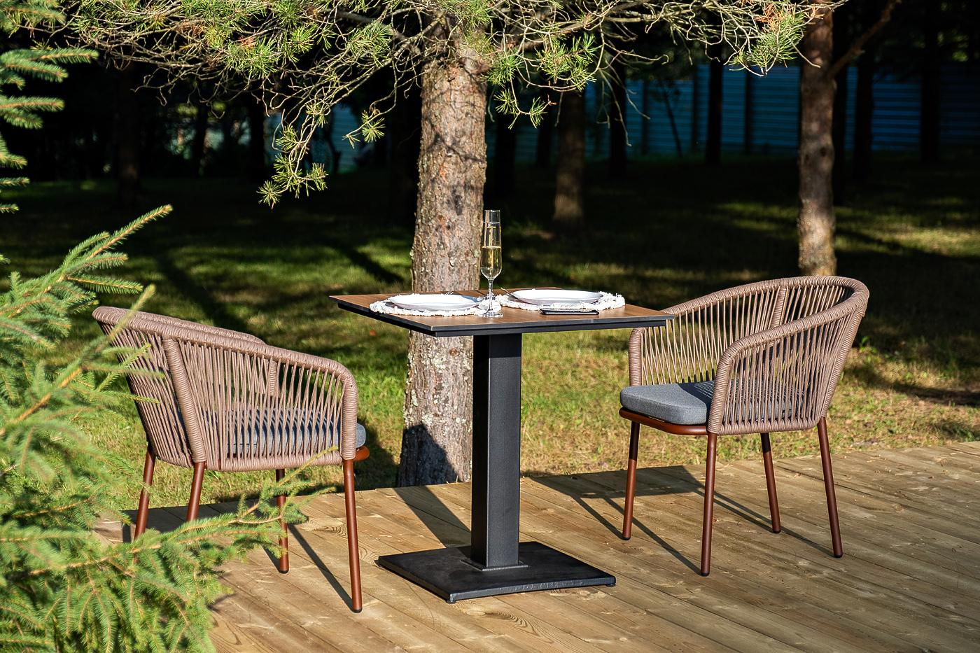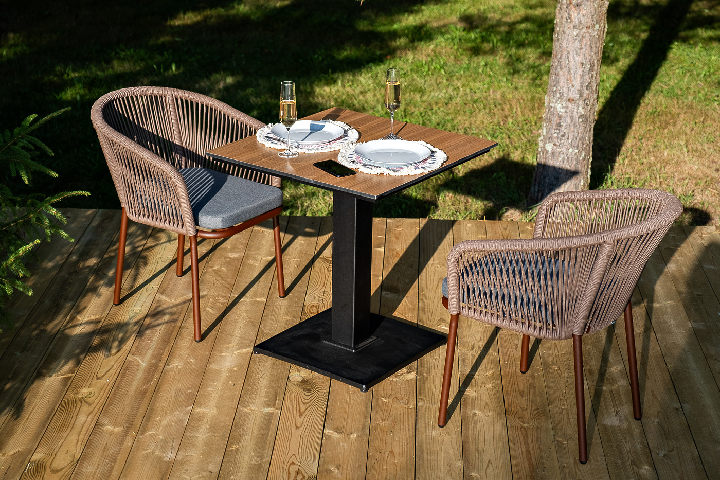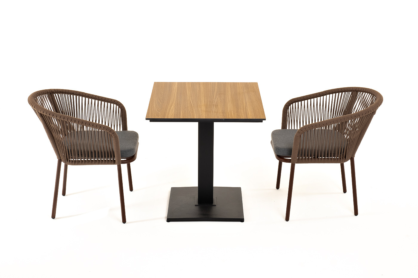 Обеденная группа «Каффе» рассчитана на 2 персоны. В состав комплекта входят: - стол со столешницей из HPL-пластика - 640×640×750 мм. - двух стульев «Марсель» - 570×620×775 мм. Интерьерный стол изготовлен из металлического подстолья, окрашенного в черный цвет, и столешницы из компактного пластика HPL в цвете «дуб». Благодаря массивному основанию столик устойчив на любых поверхностях. Стулья оснащены алюминиевым каркасом, которые вручную оплетены плоским роупом коричневого цвета. "Каффе" стол из HPL квадратный 70х70см, цвет "дуб" 1шт. 700Х700Х750, "Марсель" стул плетеный из роупа, каркас алюминий коричневый (RAL8016) муар, роуп коричневый круглый, ткань темно-серая 027 2шт. 570Х620Х775,Бренд | 4SIS |