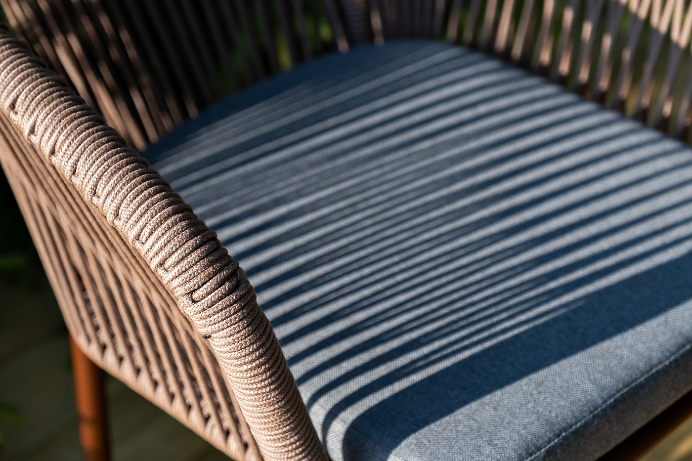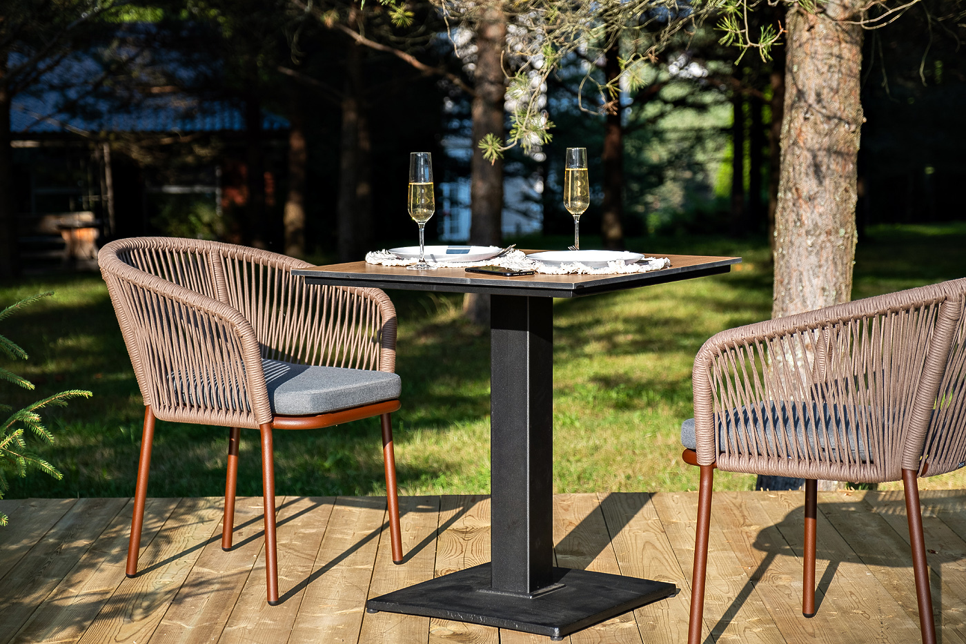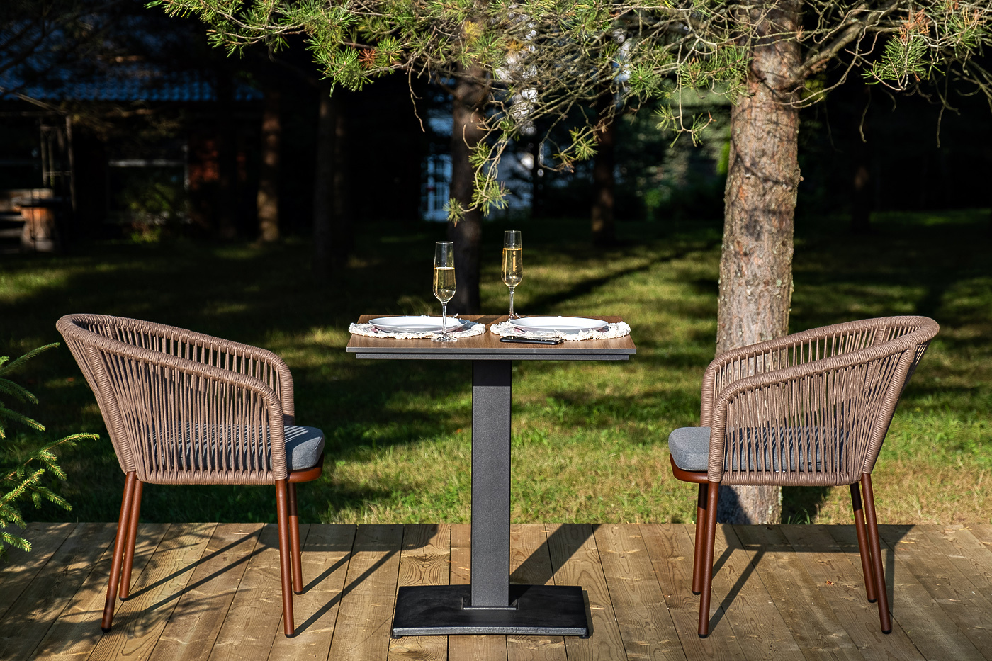 Обеденная группа «Каффе» рассчитана на 2 персоны. В состав комплекта входят: - стол со столешницей из HPL-пластика - 640×640×750 мм. - двух стульев «Марсель» - 570×620×775 мм. Интерьерный стол изготовлен из металлического подстолья, окрашенного в черный цвет, и столешницы из компактного пластика HPL в цвете «дуб». Благодаря массивному основанию столик устойчив на любых поверхностях. Стулья оснащены алюминиевым каркасом, которые вручную оплетены плоским роупом коричневого цвета. "Каффе" стол из HPL квадратный 70х70см, цвет "дуб" 1шт. 700Х700Х750, "Марсель" стул плетеный из роупа, каркас алюминий коричневый (RAL8016) муар, роуп коричневый круглый, ткань темно-серая 027 2шт. 570Х620Х775,Бренд | 4SIS |