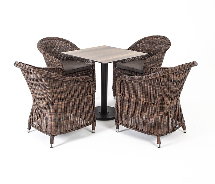 Обеденная группа «Каффе» рассчитана на 4 персоны. В состав комплекта входит: - стол «Каффе» из HPL, размер столешницы - 70х70 см, цвет «дуб». - 4 плетеных кресла «Равенна» из искусственного ротанга, размером - 570×680×810 мм, цвет - коричневый. "Каффе" стол из HPL квадратный 70х70см, цвет "дуб" 1шт. 700Х700Х750, "Равенна" плетеное кресло из искусственного ротанга, цвет коричневый 4шт. 570Х680Х810,Бренд | 4SIS |