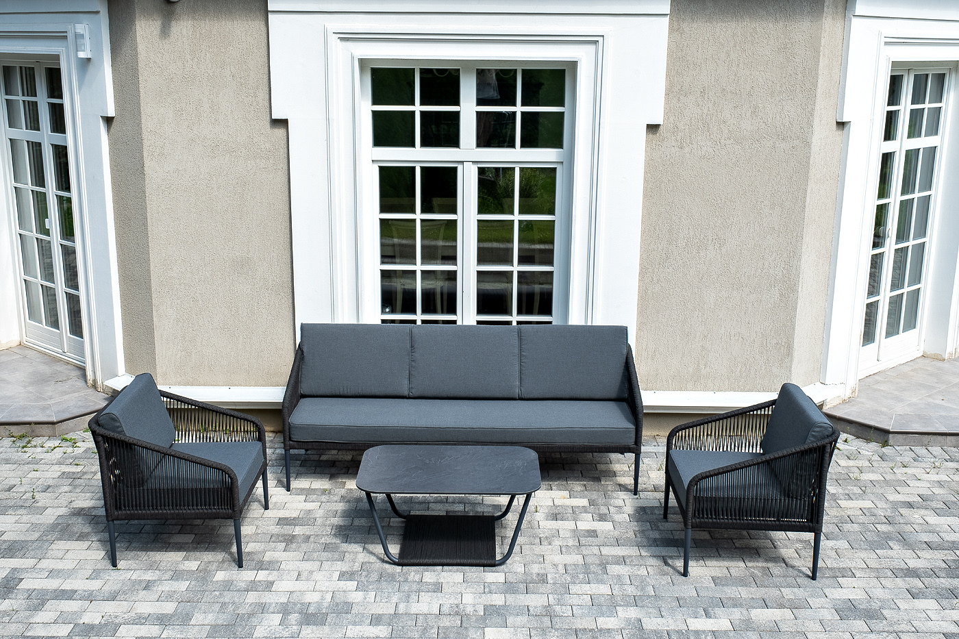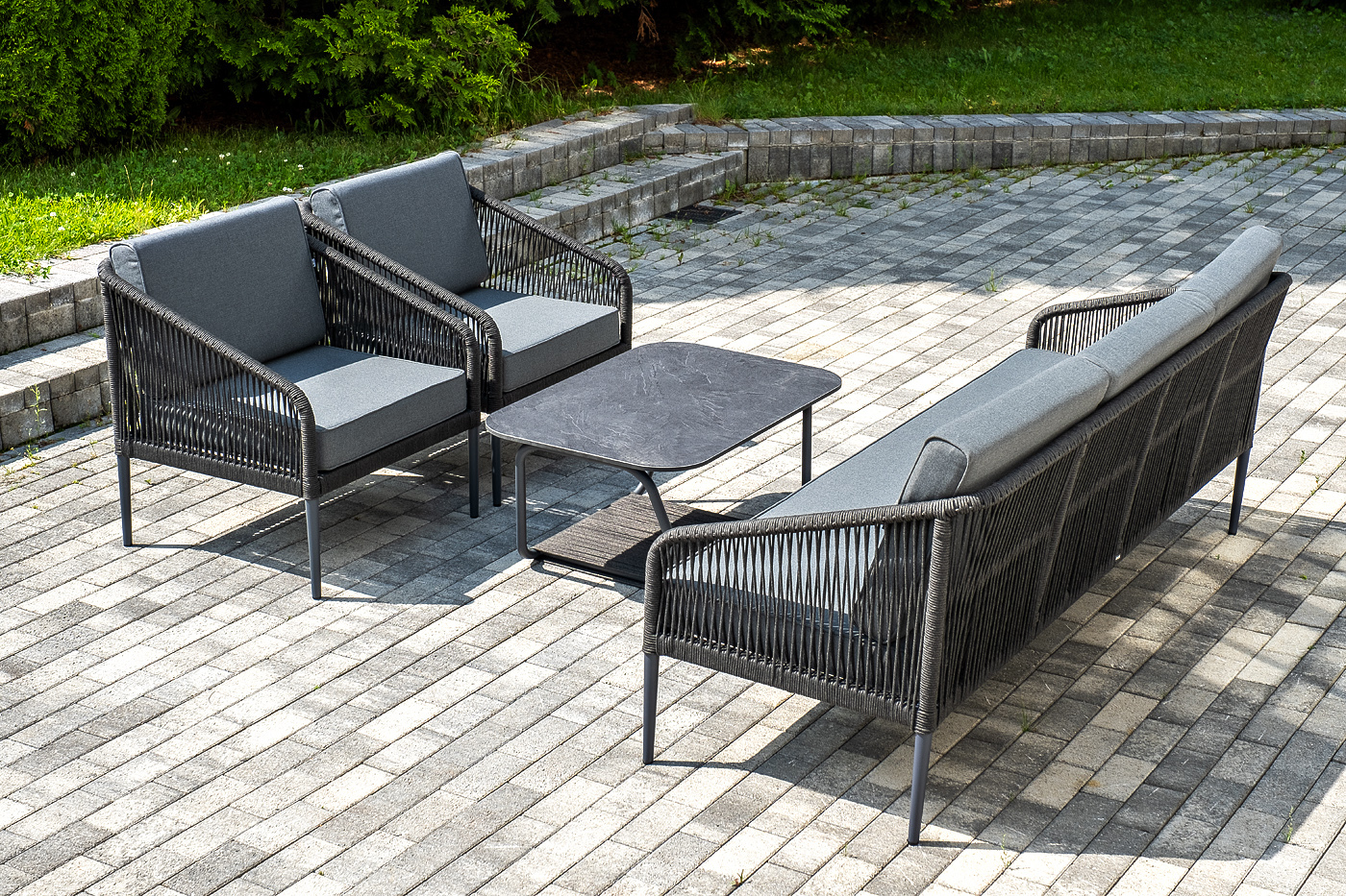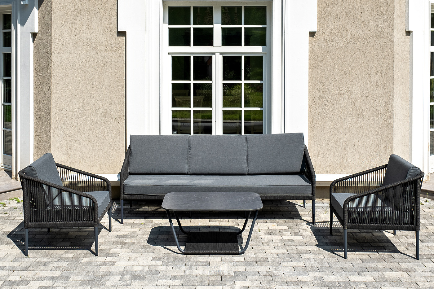 Лаунж-зона «Канны» на пять персон состоит из: - два плетеных кресла (размер – 700×700×750 мм). - трехместный диван (размер – 2030×700×750 мм). - журнальный столик (размер – 900×600×420 мм). Каркас уличной мебели выполнен из износостойкого алюминия. Его дополняет темно-серая ручная оплетка, изготовленная на основе эластичных синтетических лент из полиэфирных волокон высокой прочности. Кресла и диван идут в комплекте с мягкими подушками в чехлах серого цвета. "Канны" диван 3-местный плетеный из роупа, каркас алюминий темно-серый (RAL7024) муар, роуп темно-серый круглый, ткань темно-серая 027 1шт. 2 030Х700Х750, "Канны" кресло плетеное из роупа, каркас алюминий темно-серый (RAL7024) муар, роуп темно-серый круглый, ткань темно-серая 027 2шт. 700Х700Х750, "Гранада" журнальный стол 90х60см из HPL, цвет "серый гранит", каркас темно-серый (RAL7024) муар, роуп темно-серый круглый 1шт. 900Х600Х420,Бренд | 4SIS |