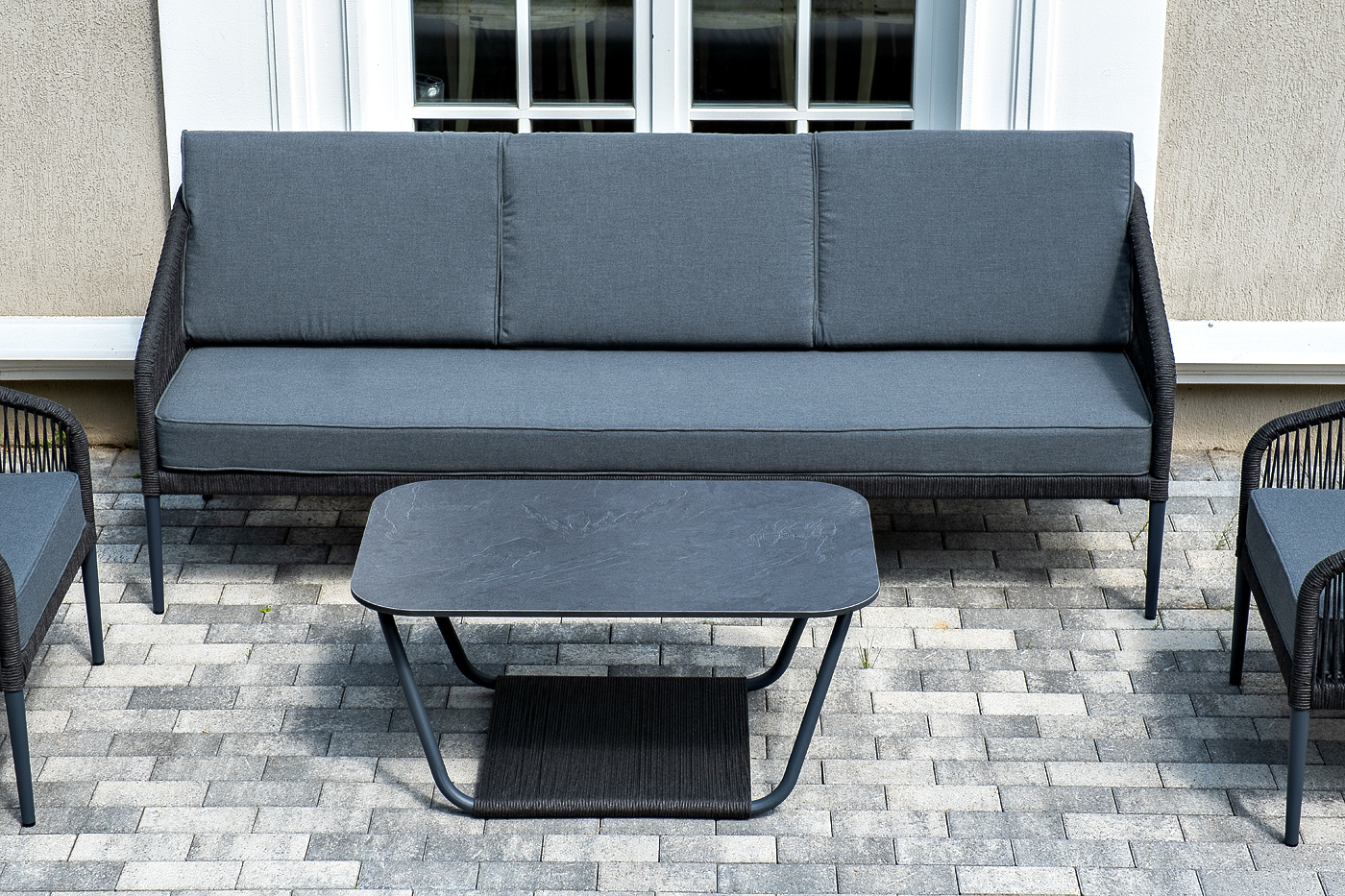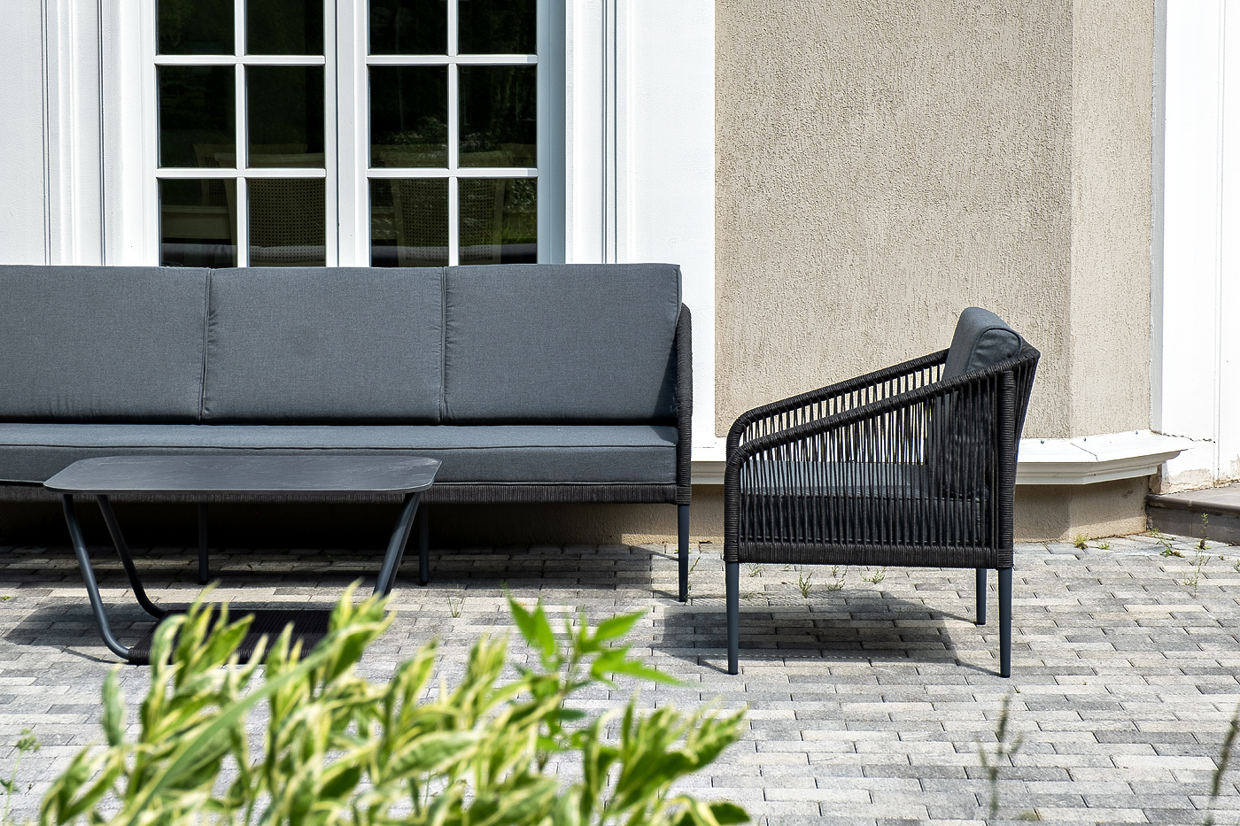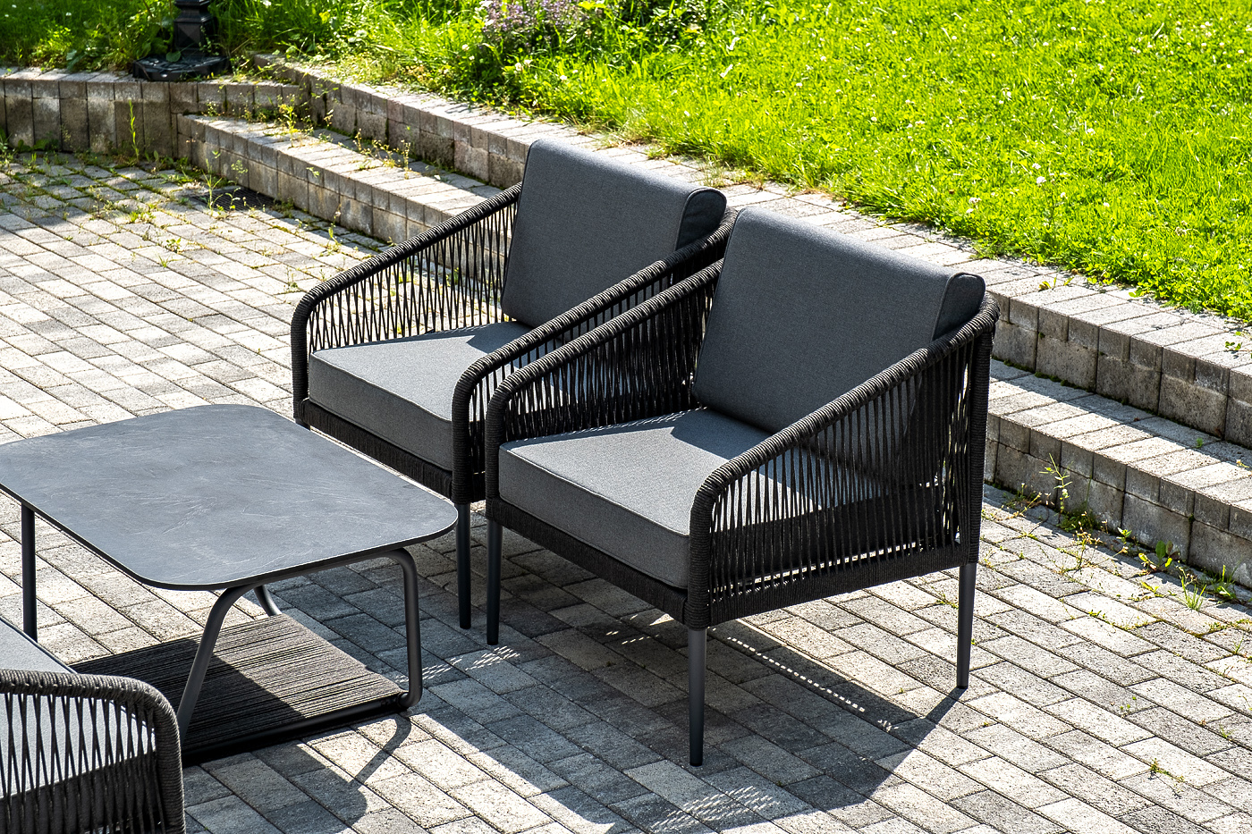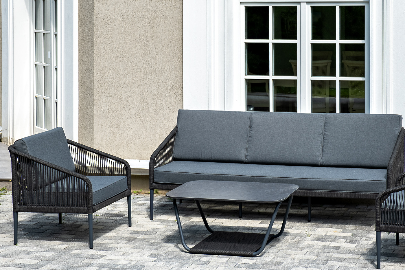 Лаунж-зона «Канны» на пять персон состоит из: - два плетеных кресла (размер – 700×700×750 мм). - трехместный диван (размер – 2030×700×750 мм). - журнальный столик (размер – 900×600×420 мм). Каркас уличной мебели выполнен из износостойкого алюминия. Его дополняет темно-серая ручная оплетка, изготовленная на основе эластичных синтетических лент из полиэфирных волокон высокой прочности. Кресла и диван идут в комплекте с мягкими подушками в чехлах серого цвета. "Канны" диван 3-местный плетеный из роупа, каркас алюминий темно-серый (RAL7024) муар, роуп темно-серый круглый, ткань темно-серая 027 1шт. 2 030Х700Х750, "Канны" кресло плетеное из роупа, каркас алюминий темно-серый (RAL7024) муар, роуп темно-серый круглый, ткань темно-серая 027 2шт. 700Х700Х750, "Гранада" журнальный стол 90х60см из HPL, цвет "серый гранит", каркас темно-серый (RAL7024) муар, роуп темно-серый круглый 1шт. 900Х600Х420,Бренд | 4SIS |
