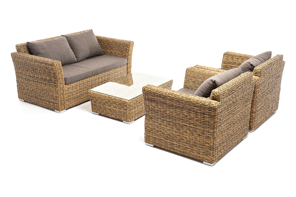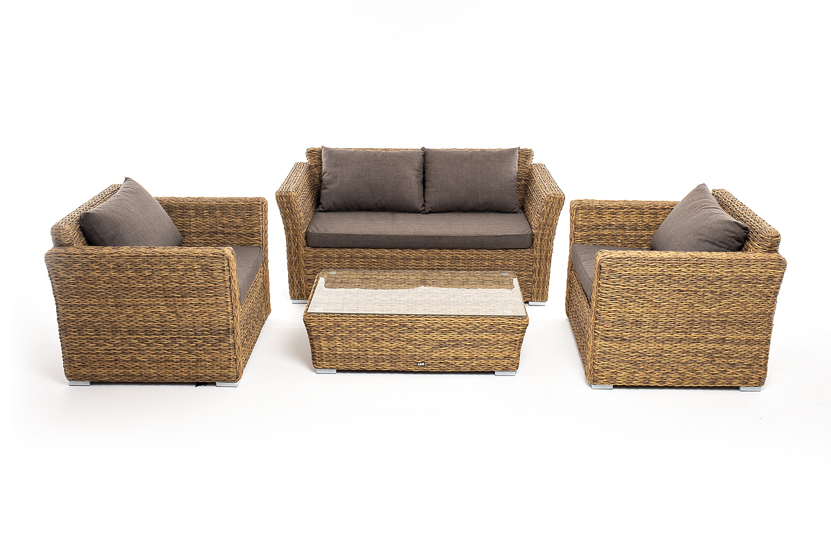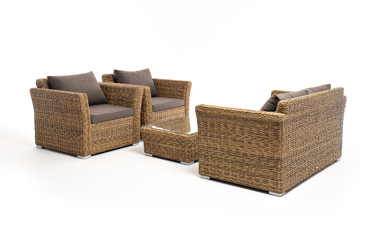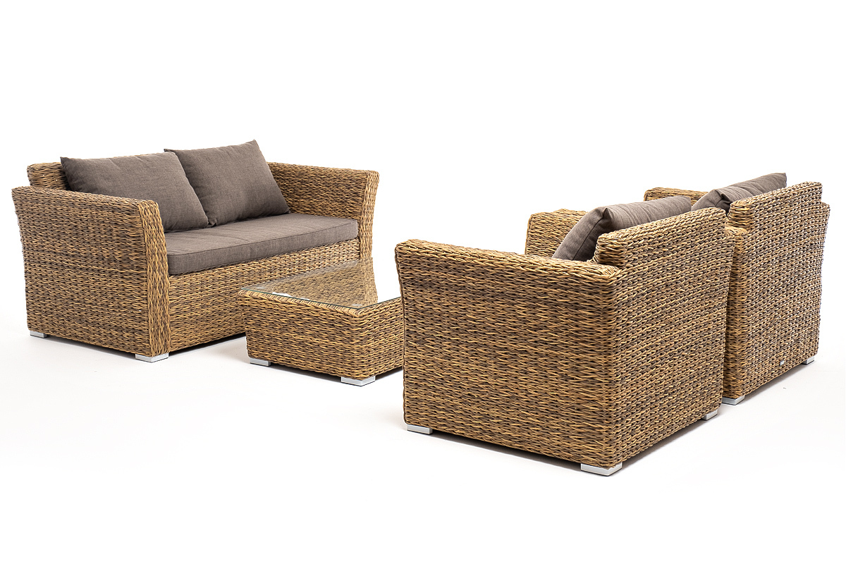 Лаунж-зона «Капучино Сингл» на 4 персоны. Она включает в свой состав: - двухместный диван (размер – 1700×865×815 мм). - два кресла (размер – 1040×865×815 мм). - плетеный журнальный столик (размер – 1100×660×340 мм). Прочный алюминиевый каркас усиливает устойчивость мебели. Его дополняет соломенная оплетка, которая представлена из искусственного ротанга вида "гиацинт". Более комфортной лаунж-зону делают мягкие подушки с чехлами из серого полиэстера, плотностью 300гр/м2. Ткань предварительно обрабатывается влагоотталкивающими составами. Столешница журнального столика также входит в комплект и поставляется в собранном виде с самим столиком. Она изготовлена из закаленного стекла – 5 мм. "Капучино" диван из искусственного ротанга (гиацинт) двухместный, цвет соломенный 1шт. 1 700Х865Х815, "Капучино" журнальный столик из искусственного ротанга (гиацинт), цвет соломенный 1шт. 1 100Х660Х340, "Капучино" кресло из искусственного ротанга (гиацинт), цвет соломенный 2шт. 1 040Х865Х815,Бренд | 4SIS |