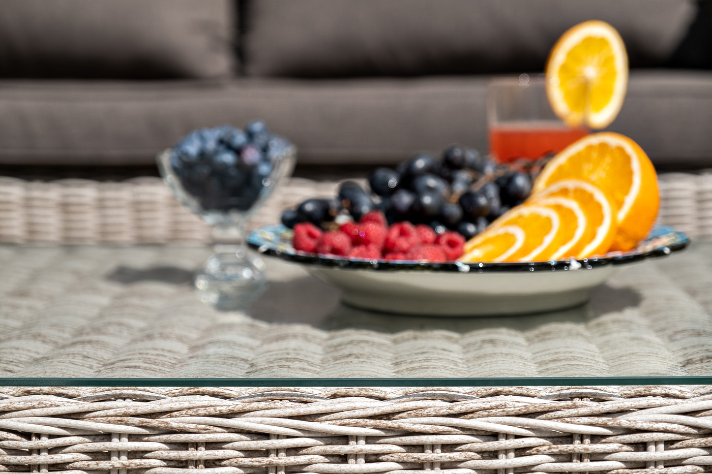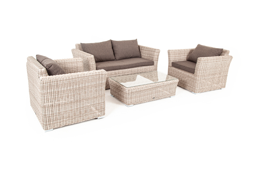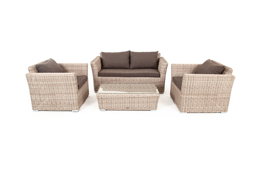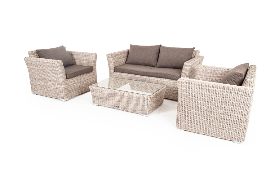 Лаунж-зона «Капучино Сингл» на 4 персоны. Она включает в свой состав: - двухместный диван (размер – 1700×865×815 мм). - два кресла (размер – 1040×865×815 мм). - плетеный журнальный столик (размер – 1100×660×340 мм). Прочный алюминиевый каркас усиливает устойчивость мебели. Его дополняет бежевая оплетка, которая представлена из круглого искусственного ротанга. Более комфортной лаунж-зону делают мягкие подушки с чехлами из серого полиэстера. Его плотность находится в рамках 300гр/м2. Ткань предварительно обрабатывается влагоотталкивающими составами. Столешница журнального столика также входит в комплект и поставляется в собранном виде с самим столиком. Она изготовлена из закаленного стекла – 5 мм. "Капучино" диван из искусственного ротанга двухместный, цвет бежевый 1шт. 1 700Х865Х815, "Капучино" кресло из искусственного ротанга, цвет бежевый 2шт. 1 040Х865Х815, "Капучино" журнальный столик из искусственного ротанга, цвет бежевый 1шт. 1 100Х660Х340,Бренд | 4SIS |
