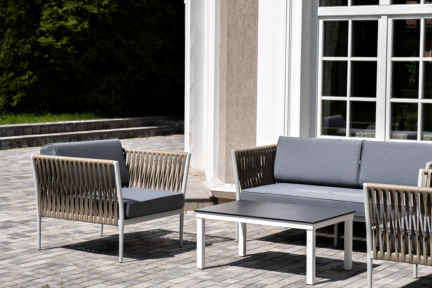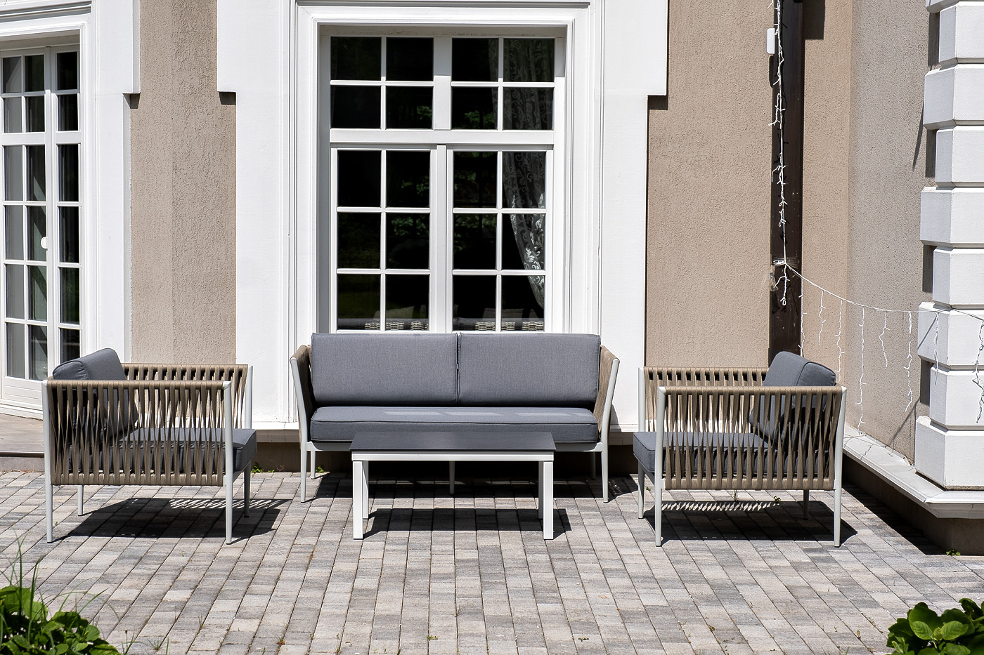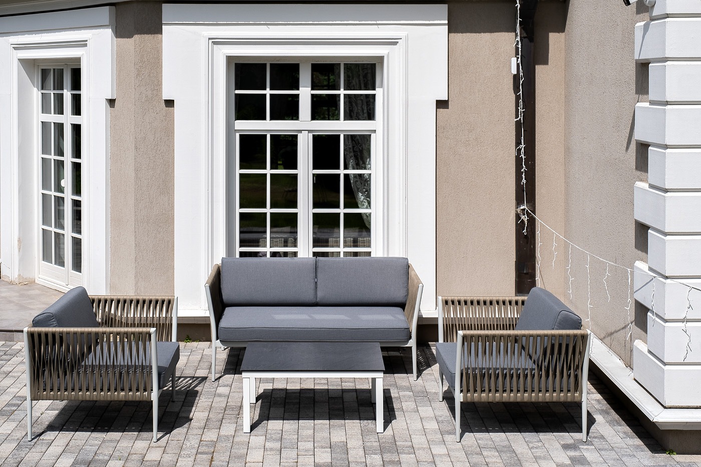 Лаунж-зона «Касабланка» расчитана на размещение 4-х персон. Состоит из: - двухместного дивана - 1600×800×695 мм. - двух кресел - 900×800×695 мм каждое. - журнального столика - 900×600×400 мм. Диван и кресла изготовлены их алюминиевого прочного каркаса, оплетенного ручным способом роупом серо-коричневого цвета. Это эластичные ленты из полиэфирных волокон высокого качества. Каркас окрашен в светло-серый (RAL7035) цвет износостойкой порошковой краской. Журнальный столик также имеет алюминиевый каркас белого цвета. Столешница выполнена из монолитного компакт-пластика HPL цвета "серый гранит". "Касабланка" диван 2-местный плетеный из роупа, каркас алюминий светло-серый (RAL7035) муар, роуп серо-коричневый 23мм, ткань серая 017 1шт. 1 600Х800Х695, "Касабланка" кресло плетеное из роупа, каркас алюминий светло-серый (RAL7035) муар, роуп серо-коричневый 23мм, ткань серая 017 2шт. 900Х800Х695, "Канны" журнальный столик из HPL 90х60, H40, каркас белый, цвет столешницы "серый гранит" 1шт. 900Х600Х400,Бренд | 4SIS |