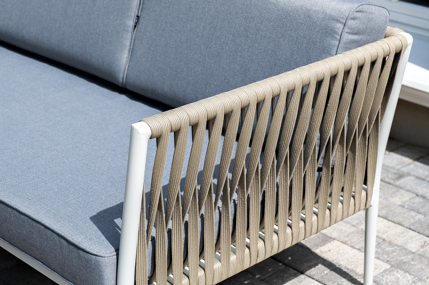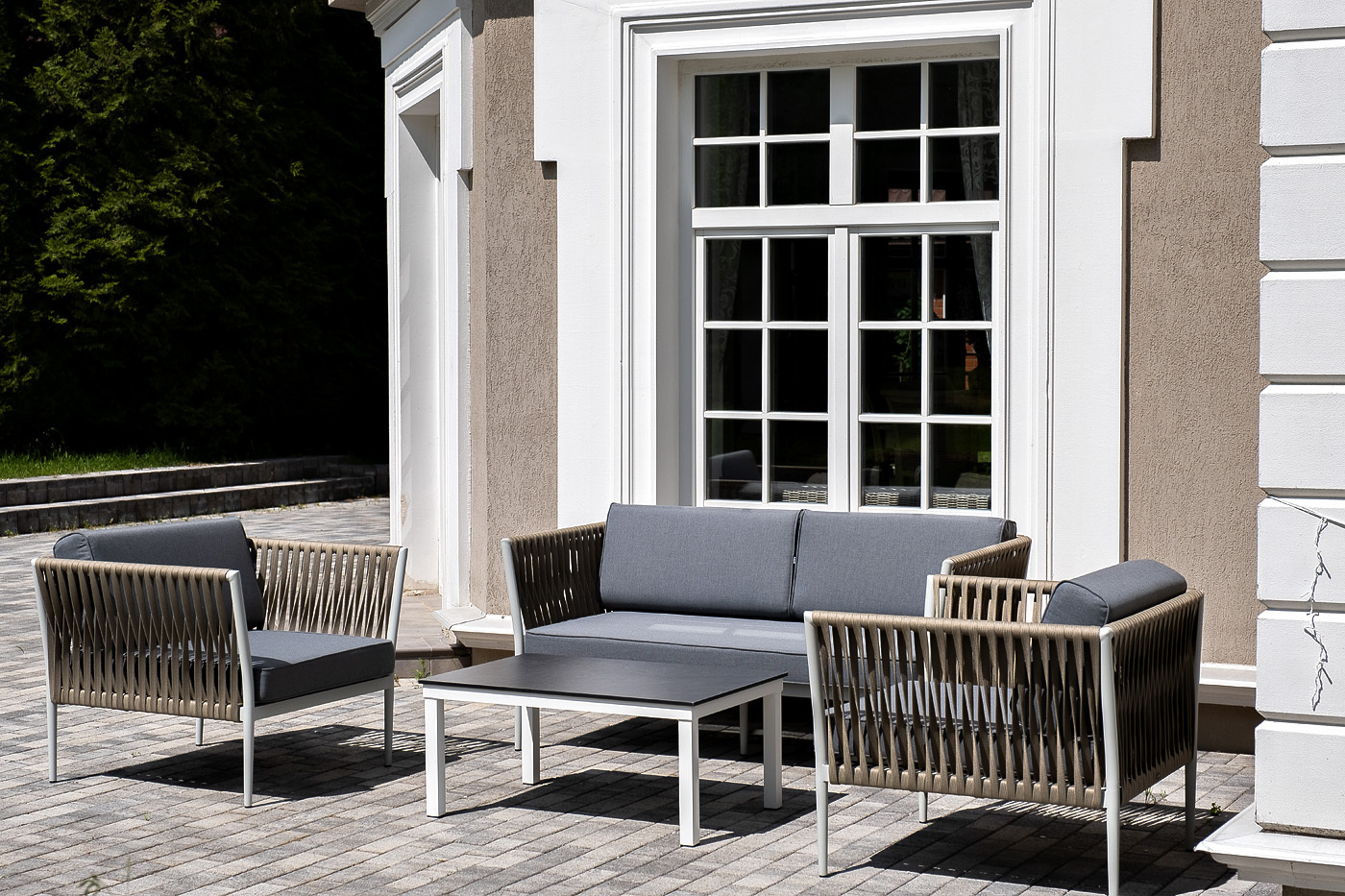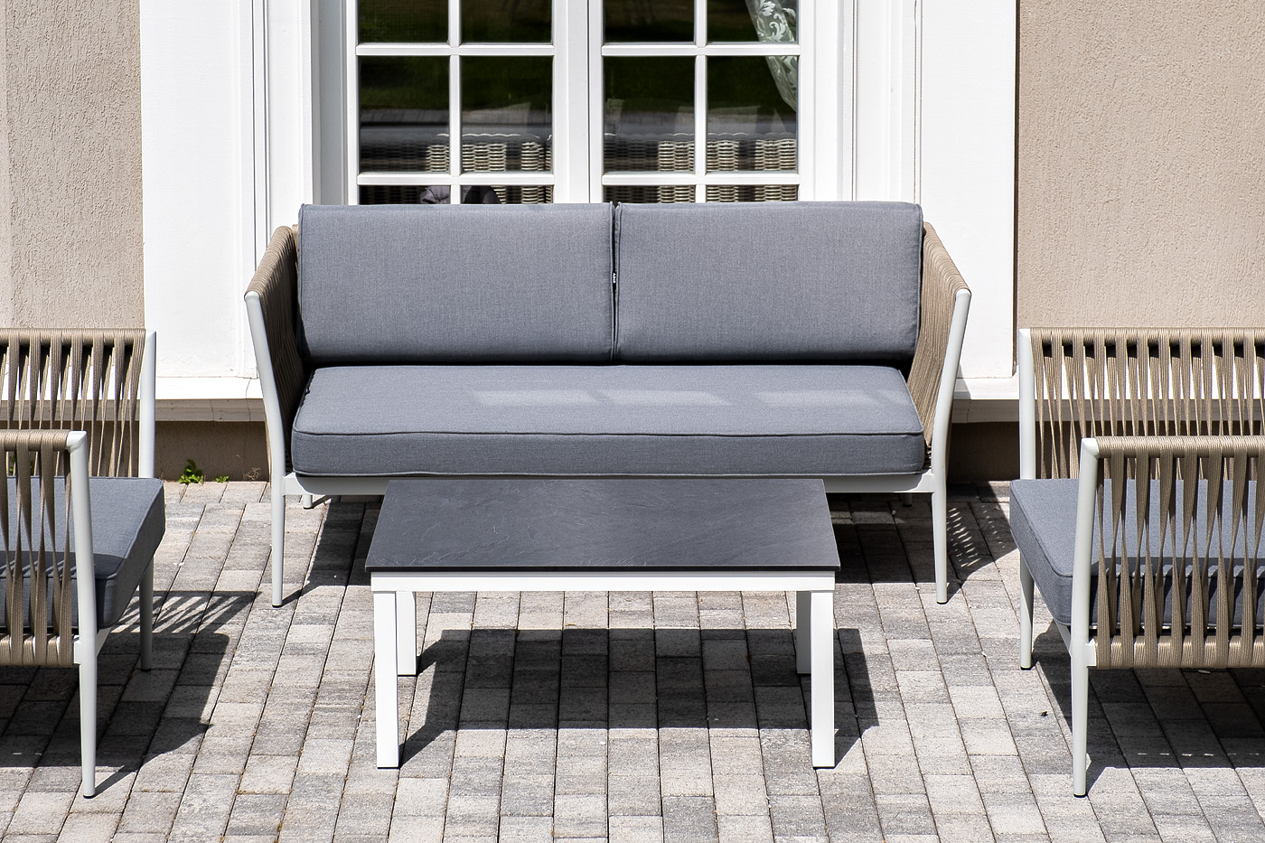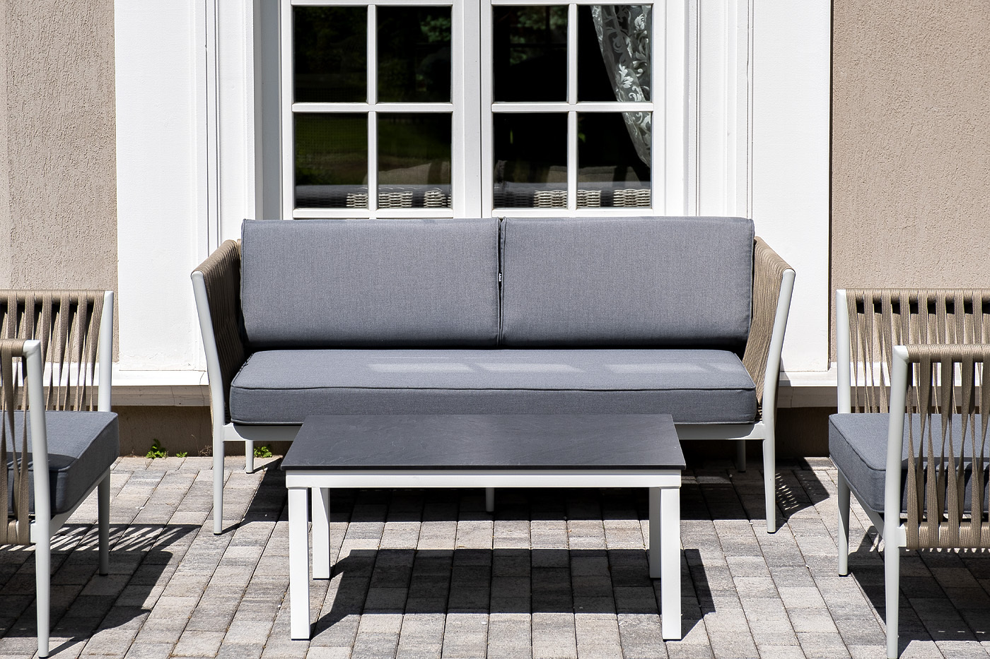 Лаунж-зона «Касабланка» расчитана на размещение 4-х персон. Состоит из: - двухместного дивана - 1600×800×695 мм. - двух кресел - 900×800×695 мм каждое. - журнального столика - 900×600×400 мм. Диван и кресла изготовлены их алюминиевого прочного каркаса, оплетенного ручным способом роупом серо-коричневого цвета. Это эластичные ленты из полиэфирных волокон высокого качества. Каркас окрашен в светло-серый (RAL7035) цвет износостойкой порошковой краской. Журнальный столик также имеет алюминиевый каркас белого цвета. Столешница выполнена из монолитного компакт-пластика HPL цвета "серый гранит". "Касабланка" диван 2-местный плетеный из роупа, каркас алюминий светло-серый (RAL7035) муар, роуп серо-коричневый 23мм, ткань серая 017 1шт. 1 600Х800Х695, "Касабланка" кресло плетеное из роупа, каркас алюминий светло-серый (RAL7035) муар, роуп серо-коричневый 23мм, ткань серая 017 2шт. 900Х800Х695, "Канны" журнальный столик из HPL 90х60, H40, каркас белый, цвет столешницы "серый гранит" 1шт. 900Х600Х400,Бренд | 4SIS |