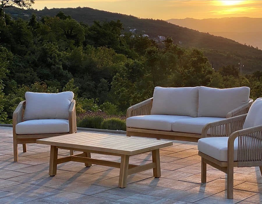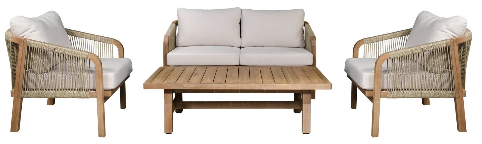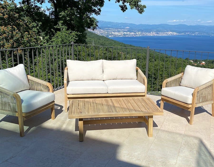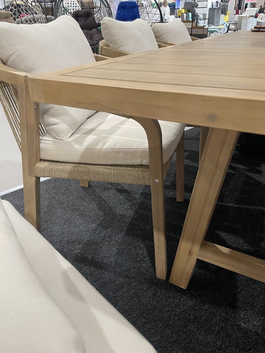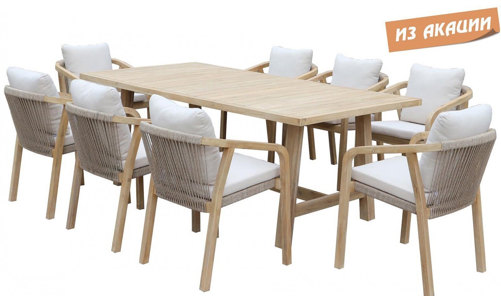Обеденная группа Ravona, рассчитанная на 6 персон, - это садовая мебель из АКАЦИИ в современном стиле. Дизайнерские формы мебели из этой коллекции создадут стильный и узнаваемый облик зоны отдыха на вашей веранде. Ravona - это современная коллекция садовой мебели из акации, выполненная в комбинации натурального веревочного плетения роуп, акации и бежевых подушек. Цвет натуральной твердой древесины представляет собой натуральный цвет с мелкой текстурой, придающий древесине приятный теплый вид. Ravona - это стиль и элегантность на Вашей веранде.