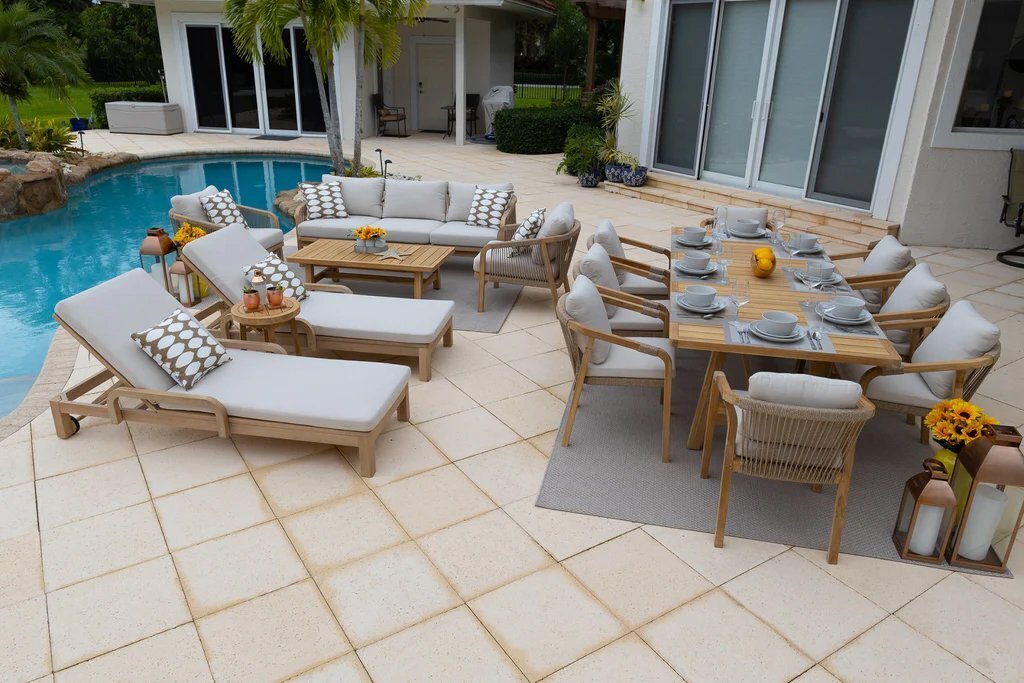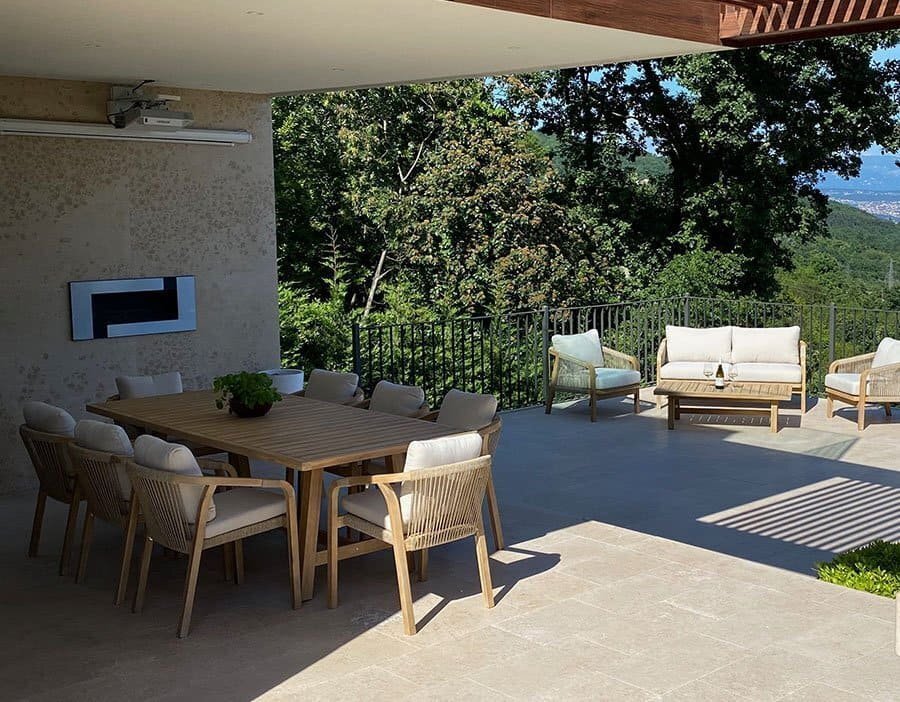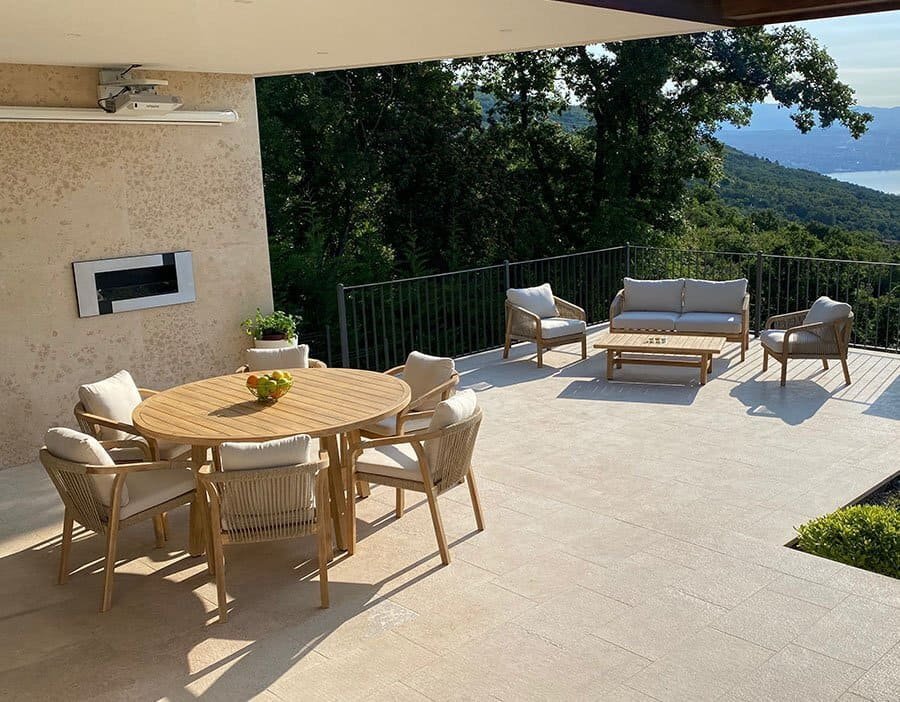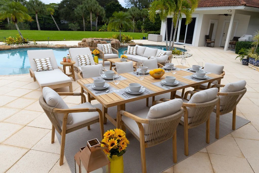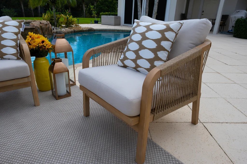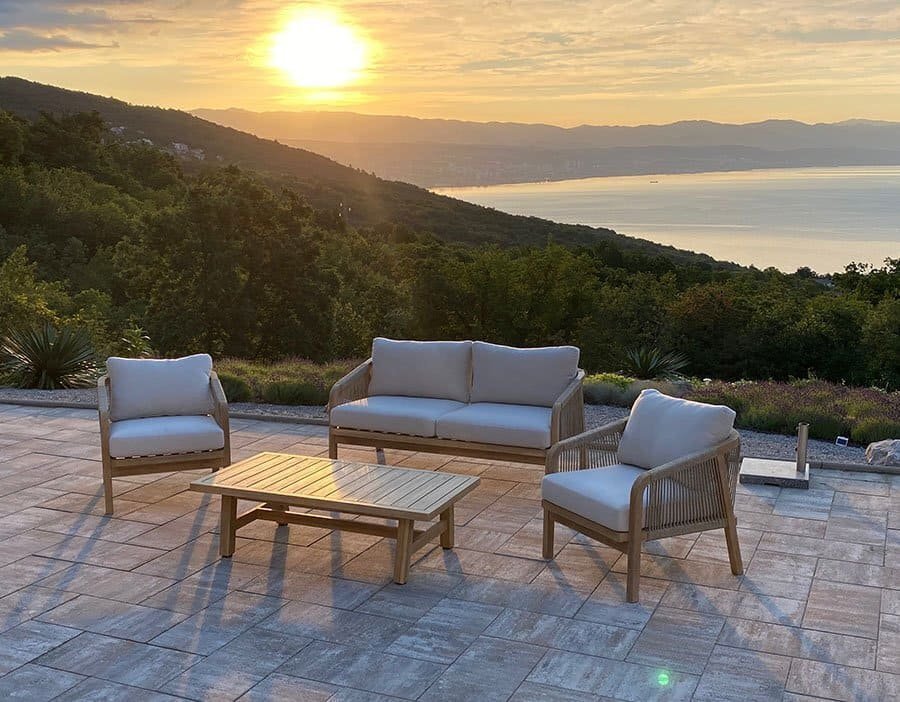 Обеденная группа Ravona, рассчитанная на 6 персон, - это садовая мебель из АКАЦИИ в современном стиле. Дизайнерские формы мебели из этой коллекции создадут стильный и узнаваемый облик зоны отдыха на вашей веранде. Ravona - это современная коллекция садовой мебели из акации, выполненная в комбинации натурального веревочного плетения роуп, акации и бежевых подушек. Цвет натуральной твердой древесины представляет собой натуральный цвет с мелкой текстурой, придающий древесине приятный теплый вид. Ravona - это стиль и элегантность на Вашей веранде.