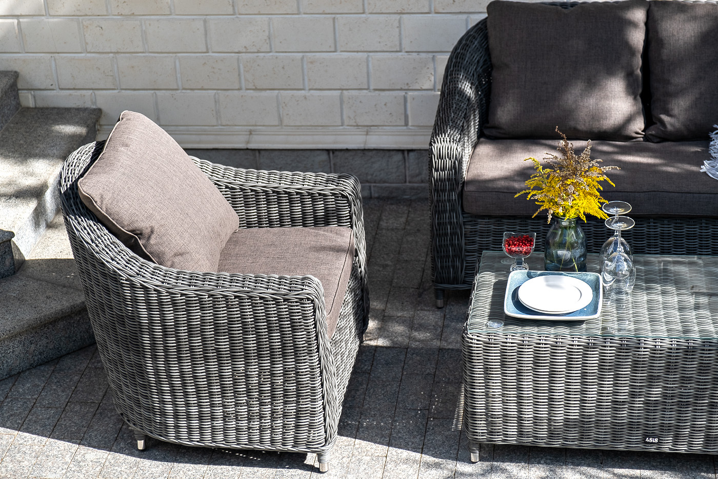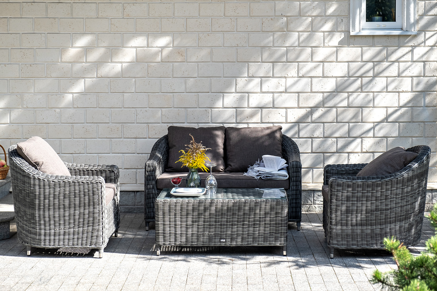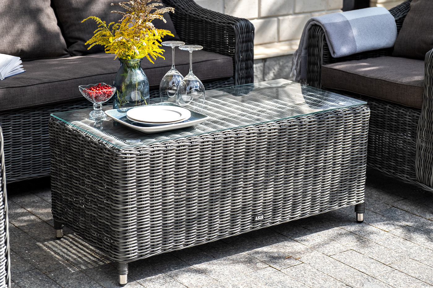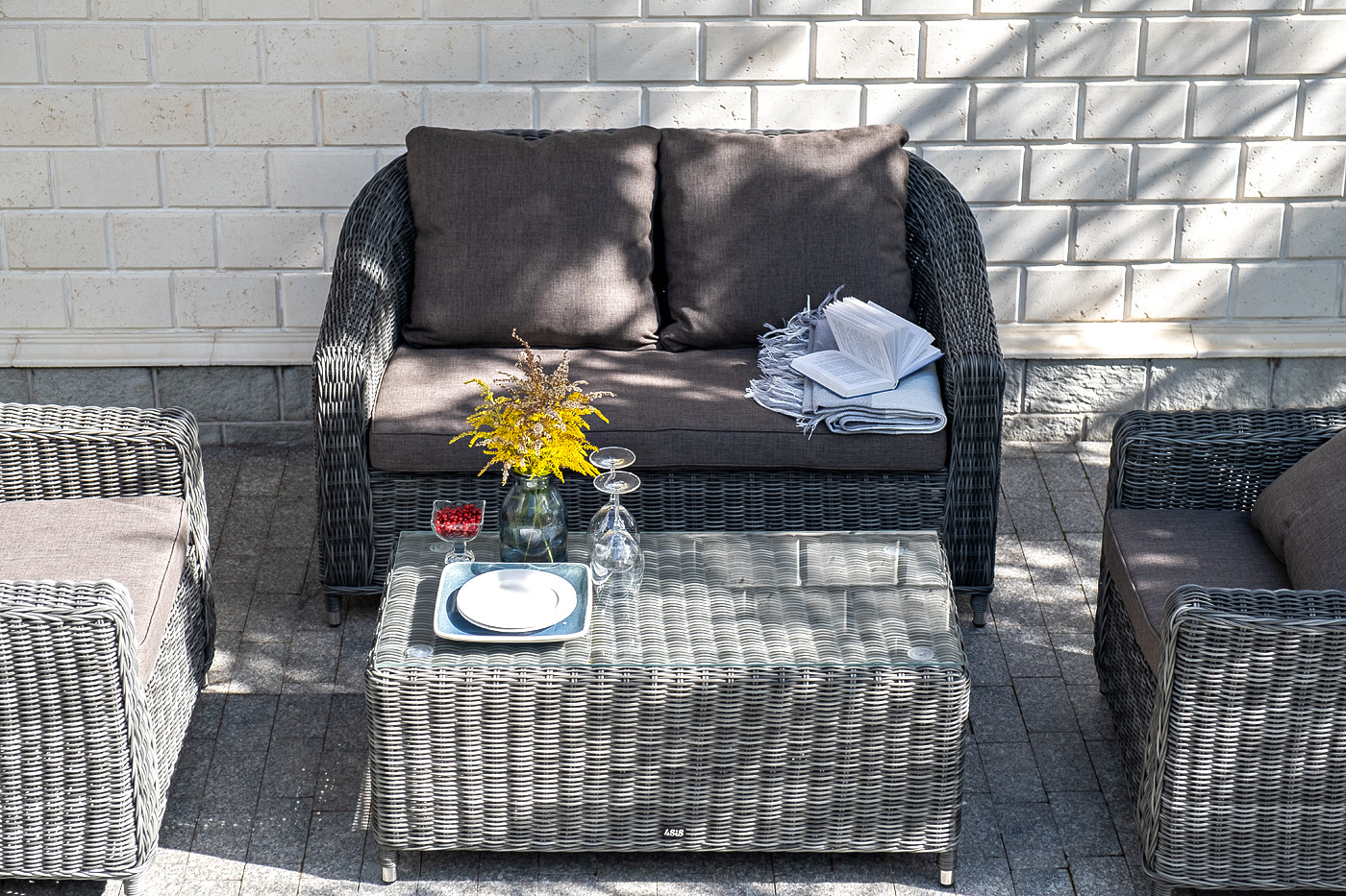 Лаунж-зона «Кон Панна» компактный комплект, рассчитанный на 4 персоны. В ее состав входят: - два плетеных кресла – 800×800×800 мм. - двухместный диван – 1370×800×800 мм. - журнальный столик – 1000×500×420 мм. В основе мебели - алюминиевый каркас и круглый искусственный ротанг. Каркас оплетен с помощью ручного метода и представлен в графитовом цвете. Диван и кресла укомплектованы подушками со съёмными чехлами из полиэстера, плотностью 300гр/м2, с влагоотталкивающей пропиткой. Журнальный столик дополняет рабочая поверхность из прочного закаленного стекла, толщина – 5 мм. "Кон Панна" столик журнальный из искусственного ротанга, цвет графит 1шт. 1 000Х500Х420, "Кон Панна" кресло из искусственного ротанга, цвет графит 2шт. 800Х800Х800, "Кон Панна" диван из искусственного ротанга двухместный, цвет графит 1шт. 1 370Х800Х800,Бренд | 4SIS |