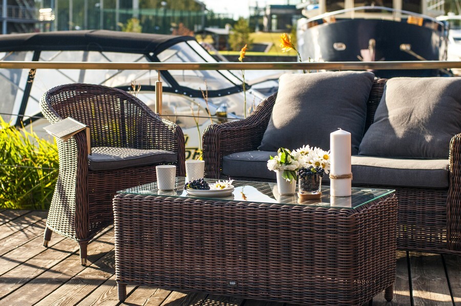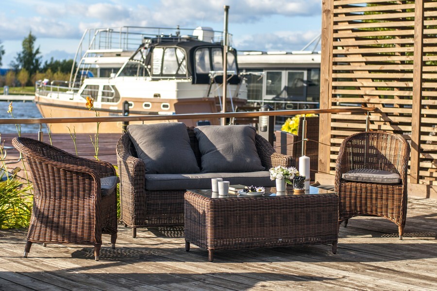 Лаунж-зона «Кон Панна С» из искусственного ротанга состоит из: - двухместного дивана - (1370×800×800 мм). - 2-х кресел "Равенна" - (570×680×810 мм). - журнального столика со стеклянной столешницей (1000×500×420 мм). В основе - алюминиевый каркас, оплетенный круглым искусственным ротангам ручным методом. Диван и кресла оснащены подушками со съёмными чехлами. Цвет комплект - коричневый. "Кон Панна" диван из искусственного ротанга двухместный, цвет коричневый 1шт. 1 370Х800Х800, "Кон Панна" столик журнальный из искусственного ротанга, цвет коричневый 1шт. 1 000Х500Х420, "Равенна" плетеное кресло из искусственного ротанга, цвет коричневый 2шт. 570Х680Х810,Бренд | 4SIS |