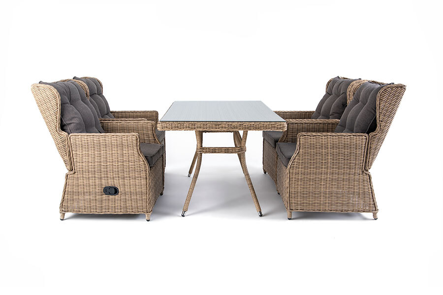 Обеденная группа из искусственного ротанга: 4 раскладывающихся кресла и обеденный стол со стеклянной столешницей. Алюминиевый каркас, круглый искусственный ротанг соломенного цвета, ручное плетение. Кресла оснащены подушками со съёмными чехлами. "Форио" кресло раскладное плетеное, цвет соломенный 4шт. 730Х830Х1 015, "Латте" плетеный стол из искусственного ротанга 160х90см, цвет соломенный 1шт. 1 600Х900Х750,Бренд | 4SIS |