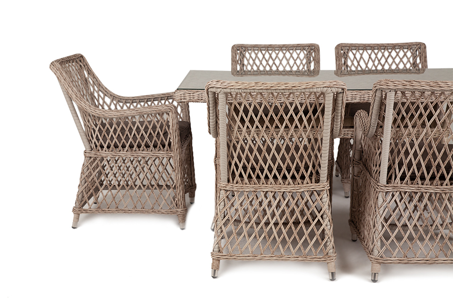 Ротанговая обеденная группа «Латте» для создания зоны отдыха в саду, обустройства веранды отеля или ресторана. Набор состоит из прямоугольного стола со стеклянной столешницей, размером 1600×900×750 мм и 6 кресел, размером - 550×660×850 мм. Комплект гармонично сочетает в себе алюминий, из которого выполнен каркас и декор из искусственного ротанга бежевого оттенка. Прекрасным дополнением мебели стали мягкие подушки из всепогодной ткани со съёмными чехлами. Вы можете приобрести каждый из элементов набора отдельно, чтобы оборудовать лаунж-зону нужного вам размера. "Латте" плетеный стол из искусственного ротанга 160х90см, цвет бежевый 1шт. 1 600Х900Х750, "Латте" плетеное кресло из искусственного ротанга, цвет бежевый 6шт. 550Х660Х850,Бренд | 4SIS |