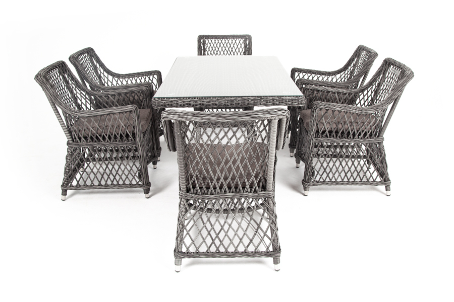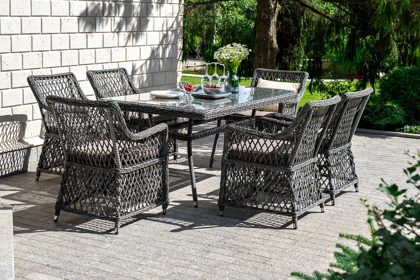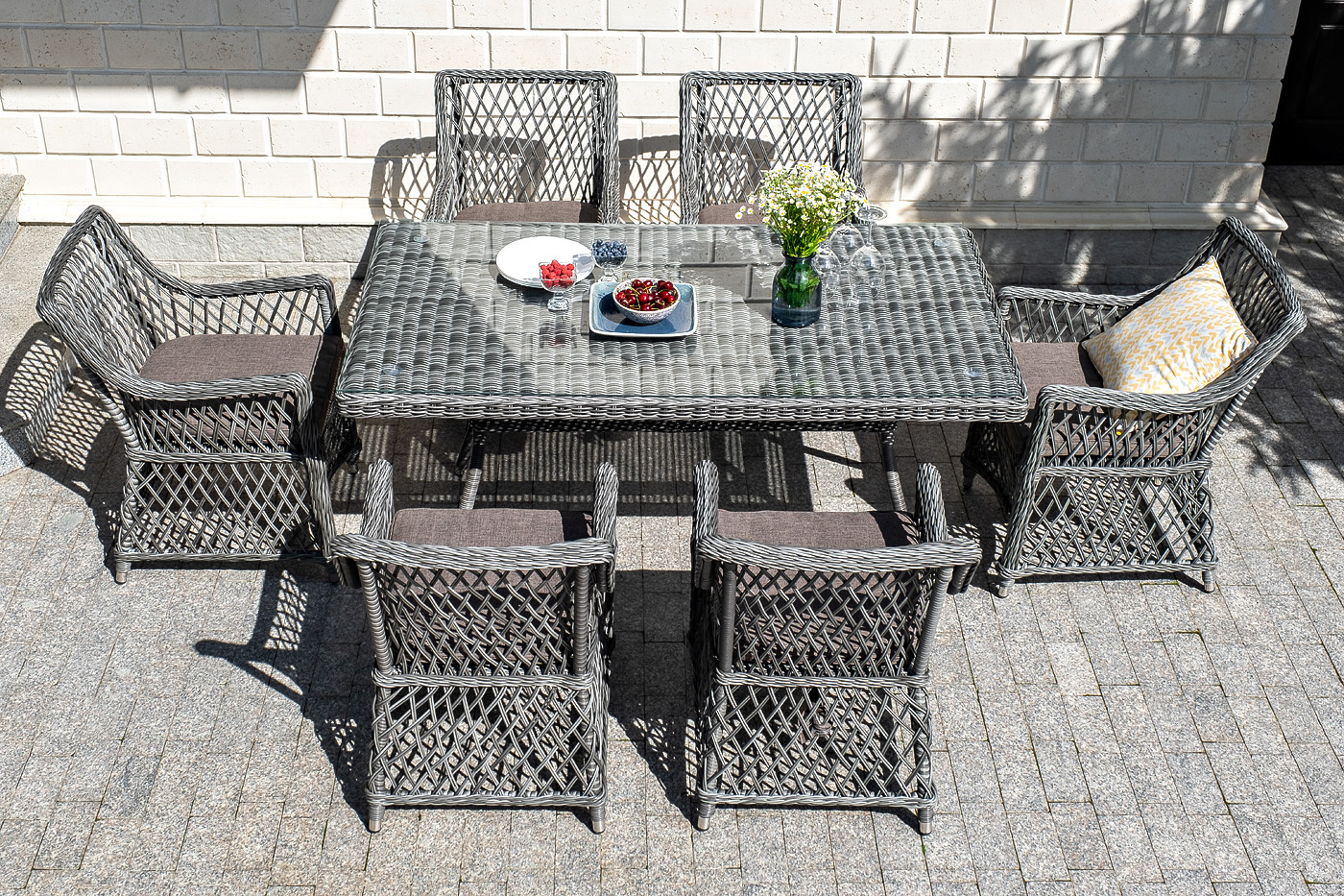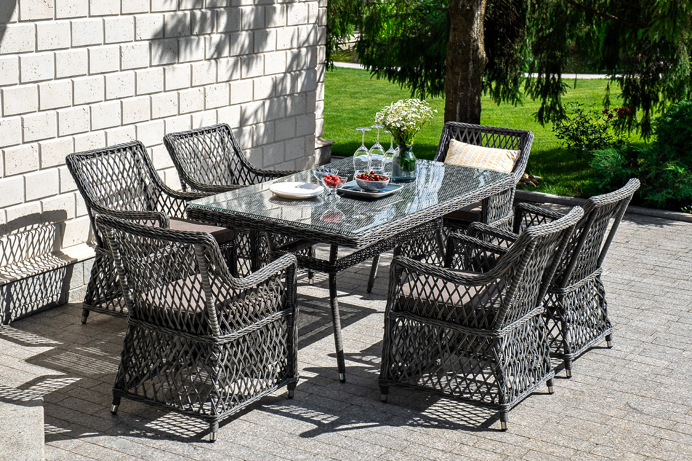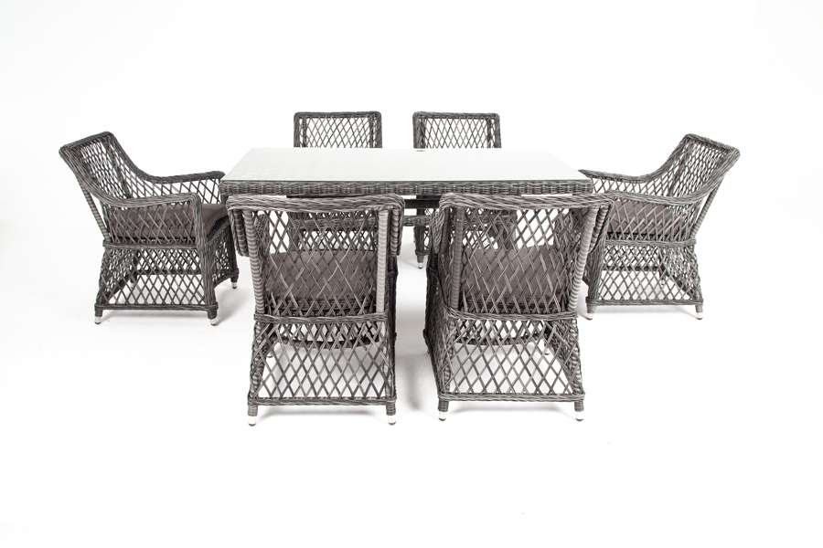 Обеденный комплект «Латте» в графитовом оттенке выполнен из искусственного ротанга и алюминиевого каркаса. Состоит из прямоугольного стола со стеклянной столешницей, размером 1600×900×750 мм и 6 кресел, размером - 550×660×850 мм. Кресла предполагают подушки со съёмными влагоотталкивающими чехлами в комплекте. "Латте" плетеный стол из искусственного ротанга 160х90см, цвет графит 1шт. 1 600Х900Х750, "Латте" плетеное кресло из искусственного ротанга, цвет графит 6шт. 550Х660Х850,Бренд | 4SIS |