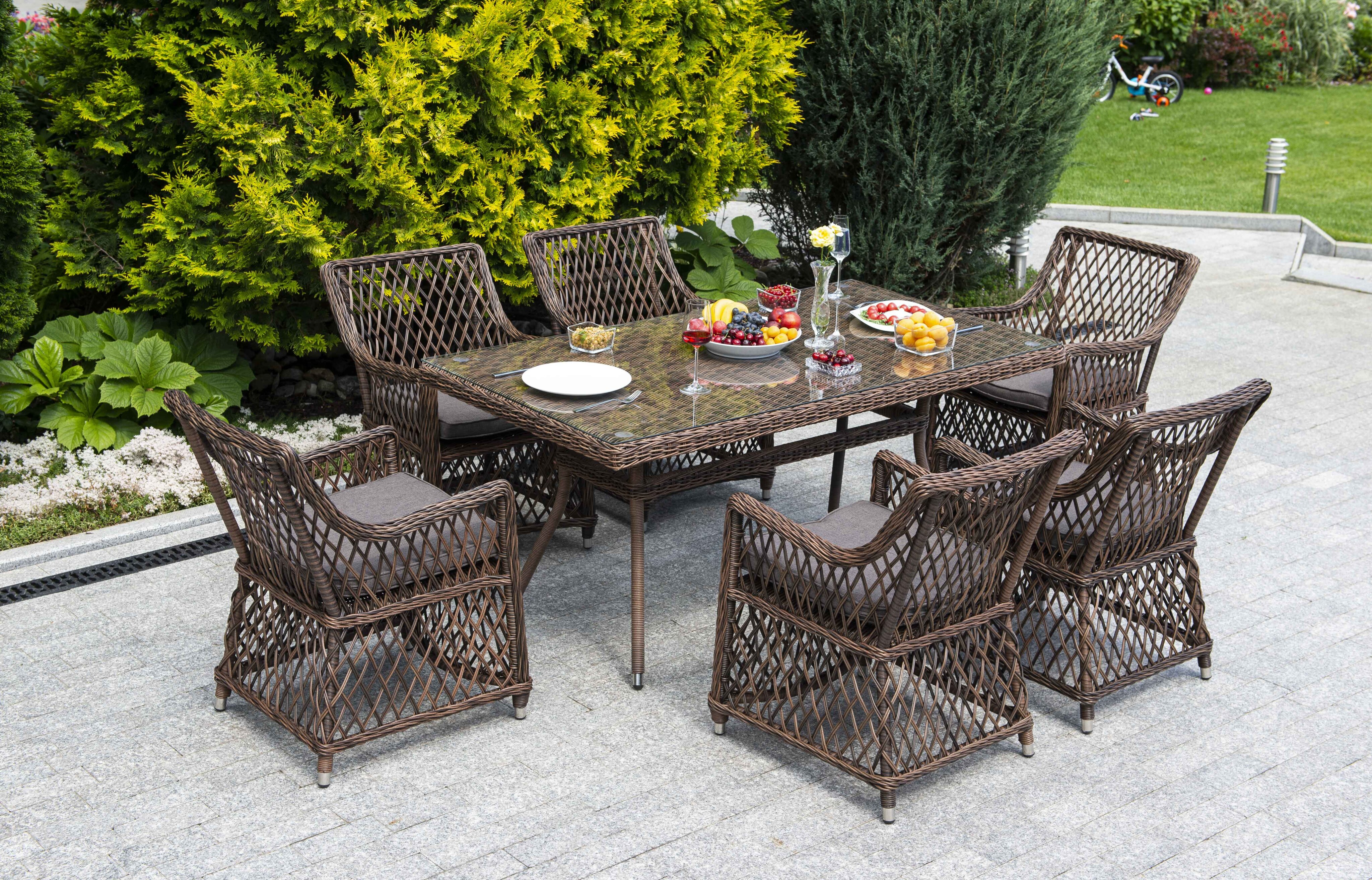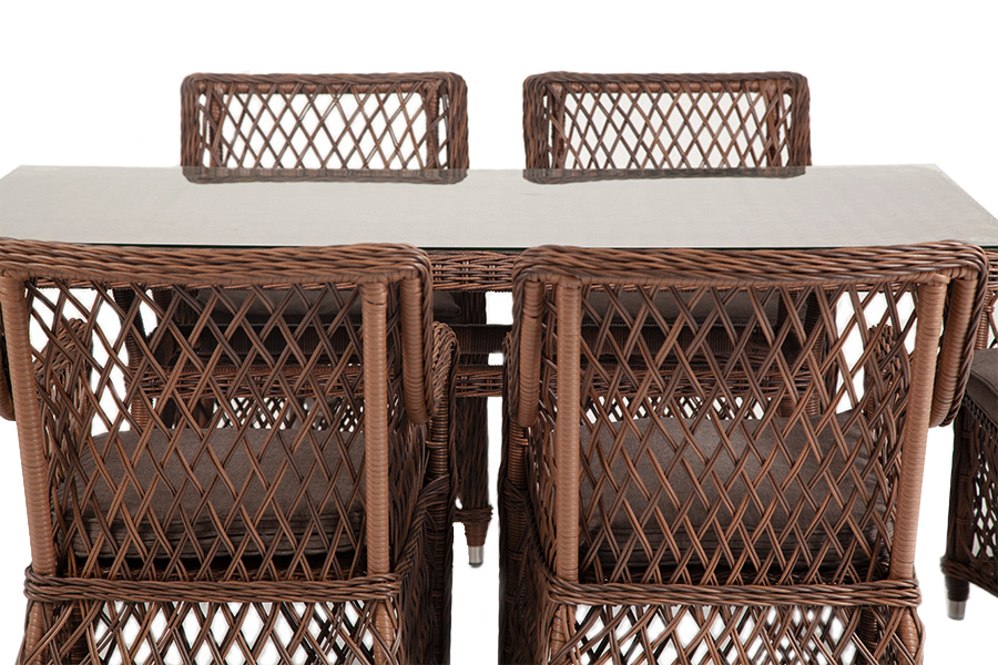 Ротанговая обеденная группа «Латте» для создания зоны отдыха в саду, обустройства веранды отеля или ресторана. Набор состоит из прямоугольного стола со стеклянной столешницей, размером 1600×900×750 мм и 6 кресел, размером - 550×660×850 мм. Комплект гармонично сочетает в себе алюминий, из которого выполнен каркас и декор из искусственного ротанга насыщенного шоколадного оттенка. Прекрасным дополнением мебели стали мягкие подушки из всепогодной ткани со съёмными чехлами. Вы можете приобрести каждый из элементов набора отдельно, чтобы оборудовать лаунж-зону нужного вам размера. "Латте" плетеный стол из искусственного ротанга 160х90см, цвет коричневый 1шт. 1 600Х900Х750, "Латте" плетеное кресло из искусственного ротанга, цвет коричневый 6шт. 550Х660Х850,Бренд | 4SIS |