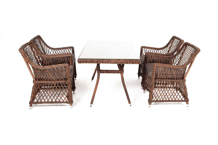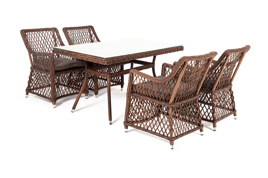 Ротанговая обеденная группа «Латте» для создания зоны отдыха в саду, обустройства веранды отеля или ресторана. Набор состоит из прямоугольного стола со стеклянной столешницей, размером 1400×800×750 мм и 4 кресел, размером - 550×660×850 мм. Комплект гармонично сочетает в себе алюминий, из которого выполнен каркас и декор из искусственного ротанга насыщенного шоколадного оттенка. Прекрасным дополнением мебели стали мягкие подушки из всепогодной ткани со съёмными чехлами. Вы можете приобрести каждый из элементов набора отдельно, чтобы оборудовать лаунж-зону нужного вам размера. "Латте" плетеный стол из искусственного ротанга 140х80см, цвет коричневый 1шт. 1 400Х800Х750, "Латте" плетеное кресло из искусственного ротанга, цвет коричневый 4шт. 550Х660Х850,Бренд | 4SIS |