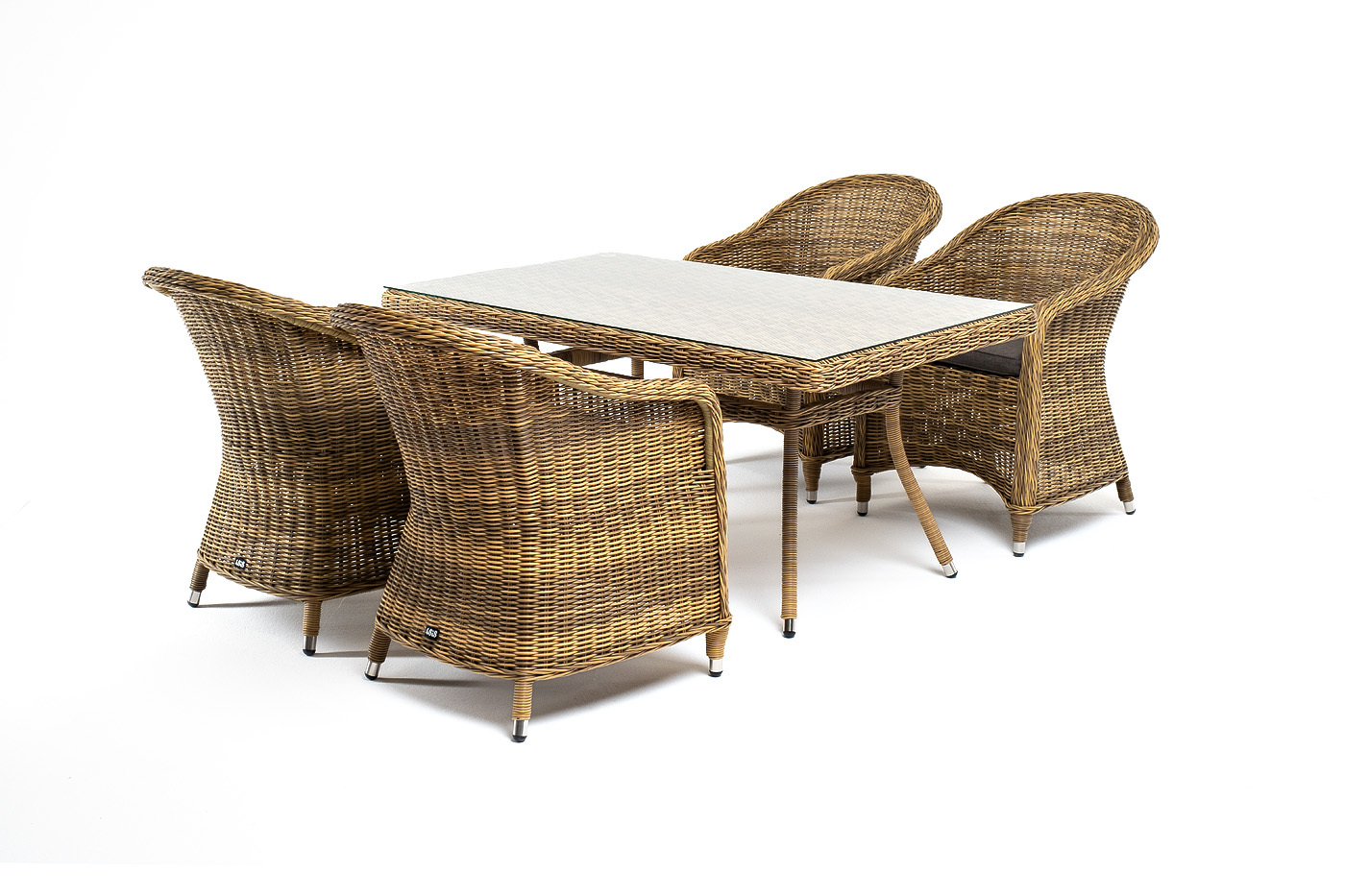 Ротанговая обеденная группа «Латте» со стульями из коллекции «Равенна». Набор состоит из прямоугольного стола со стеклянной столешницей, размером 1400×800×750 мм и 4 кресел, размером - 570×680×810 мм. Комплект гармонично сочетает в себе алюминий, из которого выполнен каркас и декор из искусственного ротанга соломенного цвета. Прекрасным дополнением мебели стали мягкие подушки из всепогодной ткани со съёмными чехлами. Вы можете приобрести каждый из элементов набора отдельно, чтобы оборудовать лаунж-зону нужного вам размера. "Латте" плетеный стол из искусственного ротанга 140х80см, цвет соломенный 1шт. 1 400Х800Х750, "Равенна" плетеное кресло из искусственного ротанга, цвет соломенный 4шт. 570Х680Х810,Бренд | 4SIS |