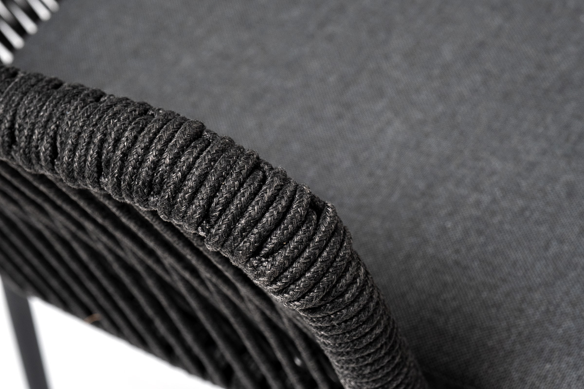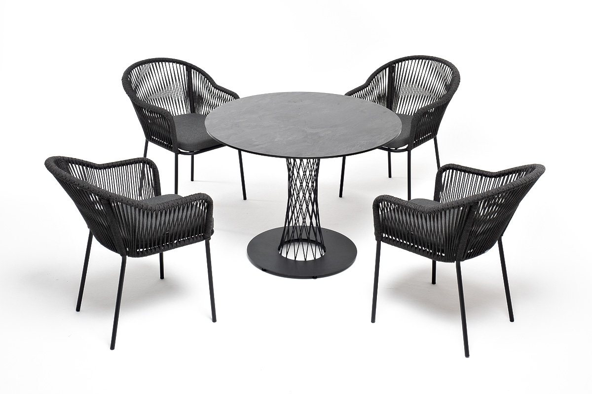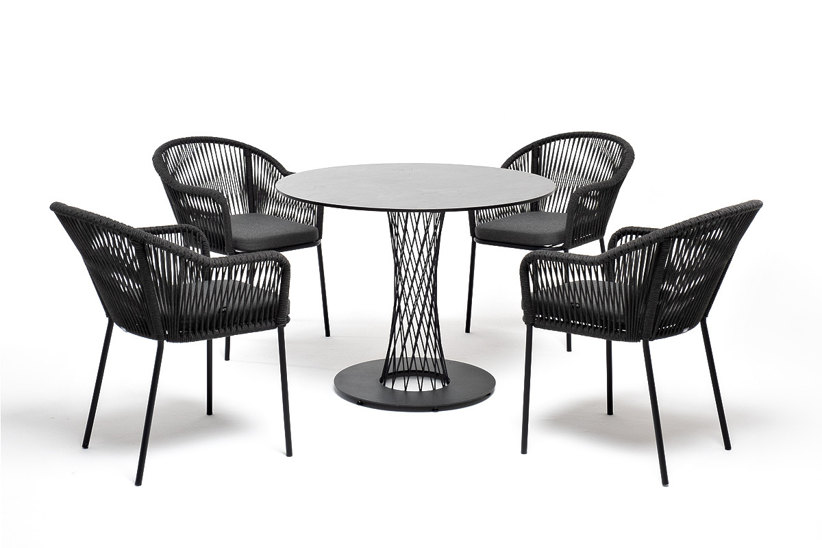 Обеденная группа «Лион» - это стильный и функциональный комплект мебели, предназначенный для комфортного размещения 4 персон. Включает в себя стол «Диего» со столешницей из HPL-пластика и 4 плетеных стула «Лион» с эргономичными подлокотниками. Диаметр столешницы 90 см, что позволяет разместить на ней все необходимые принадлежности и сервировку для 4 персон. Цвет столешницы - «серый гранит», который легко вписывается в интерьер в любом стиле. Высота стола - 750 мм. Каркас стульев выполнен из стали, окрашенной в темно-серый (RAL7024) оттенок. Такой каркас обеспечивает высокую устойчивость стульев к деформации и изгибам при длительной эксплуатации и нагрузке. Плетение стульев выполнено из устойчивого к ультрафиолету роупа, который сохраняет привлекательный внешний вид стульев на протяжении долгого времени. Размер стула - 570×620×820 мм. Цвет роупа - темно-серый, что прекрасно сочетается с цветом столешницы и каркасом стульев, создавая гармоничный и современный образ обеденной группы «Лион». "Лион" стул плетеный из роупа, каркас из стали темно-серый (RAL7024) муар, роуп темно-серый круглый, ткань темно-серая 027 4шт. 570Х620Х820, "Диего" обеденный стол из HPL круглый Ø90см, цвет "серый гранит" 1шт. 900Х900Х750,Бренд | 4SIS |