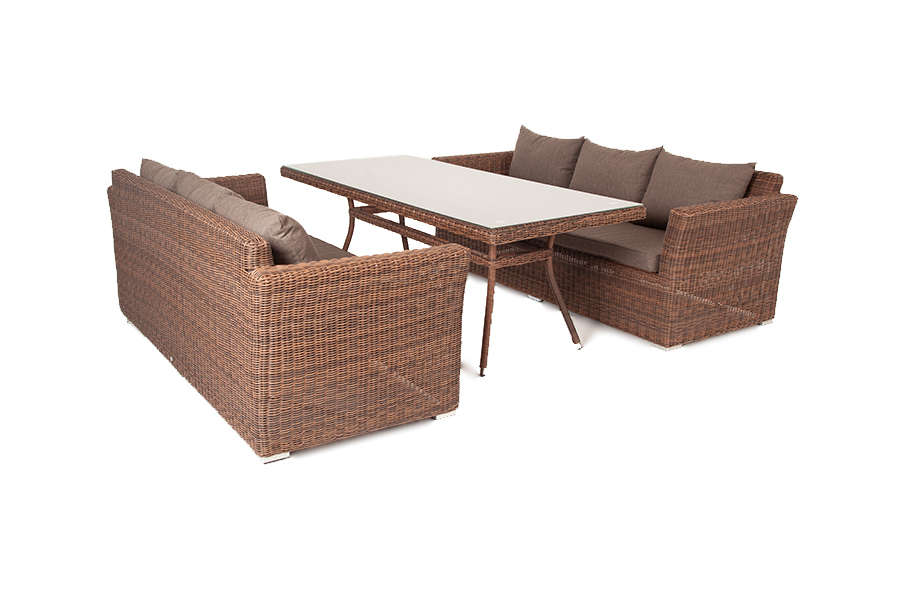 Обеденная группа класса премиум «Мокко Дабл» для большой компании. Комплект включает: - 2 трехместных дивана «Капучино», размер каждого - 2200×865×815 мм. - большой обеденный стол «Латте» со стеклянной столешницей - 2000×900×750 мм. Каркас всех предметов изготовлен из алюминия, поэтому их легко перемещать. В качестве декора использован искусственный ротанг круглого ручного плетения, устойчивый к УФ лучам, сырости, перепадам температуры. На сидениях и спинках диванов предусмотрены мягкие подушки с влагоотталкивающей пропиткой в сером цвете. Обеденная группа выполнена в насыщенном коричневом оттенке. "Капучино" диван из искусственного ротанга трехместный, цвет коричневый 2шт. 2 220Х865Х815, "Латте" плетеный стол из искусственного ротанга 200х90см, цвет коричневый 1шт. 2 000Х900Х750,Бренд | 4SIS |