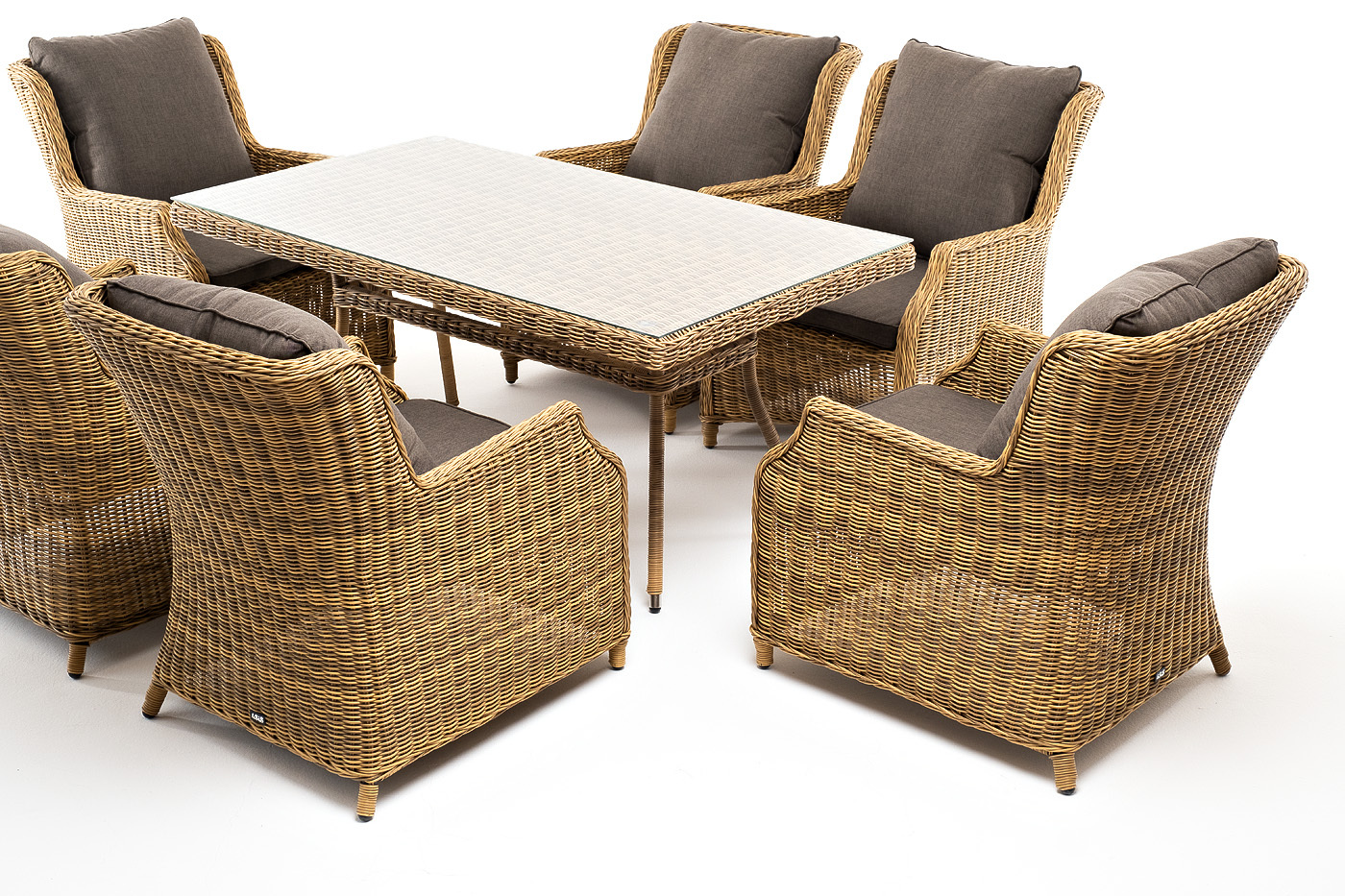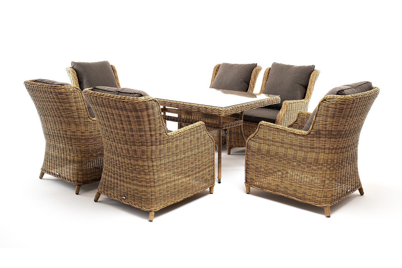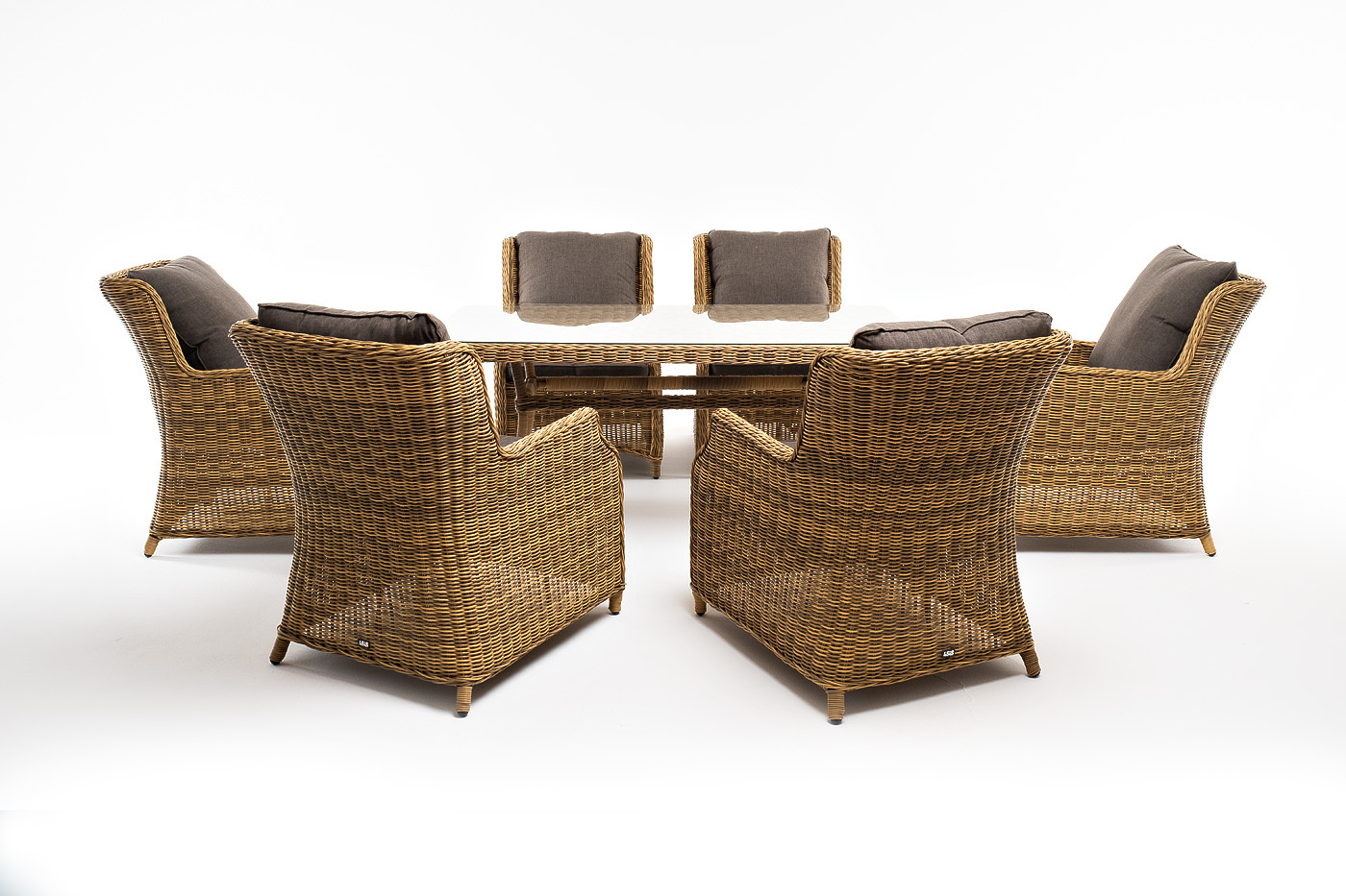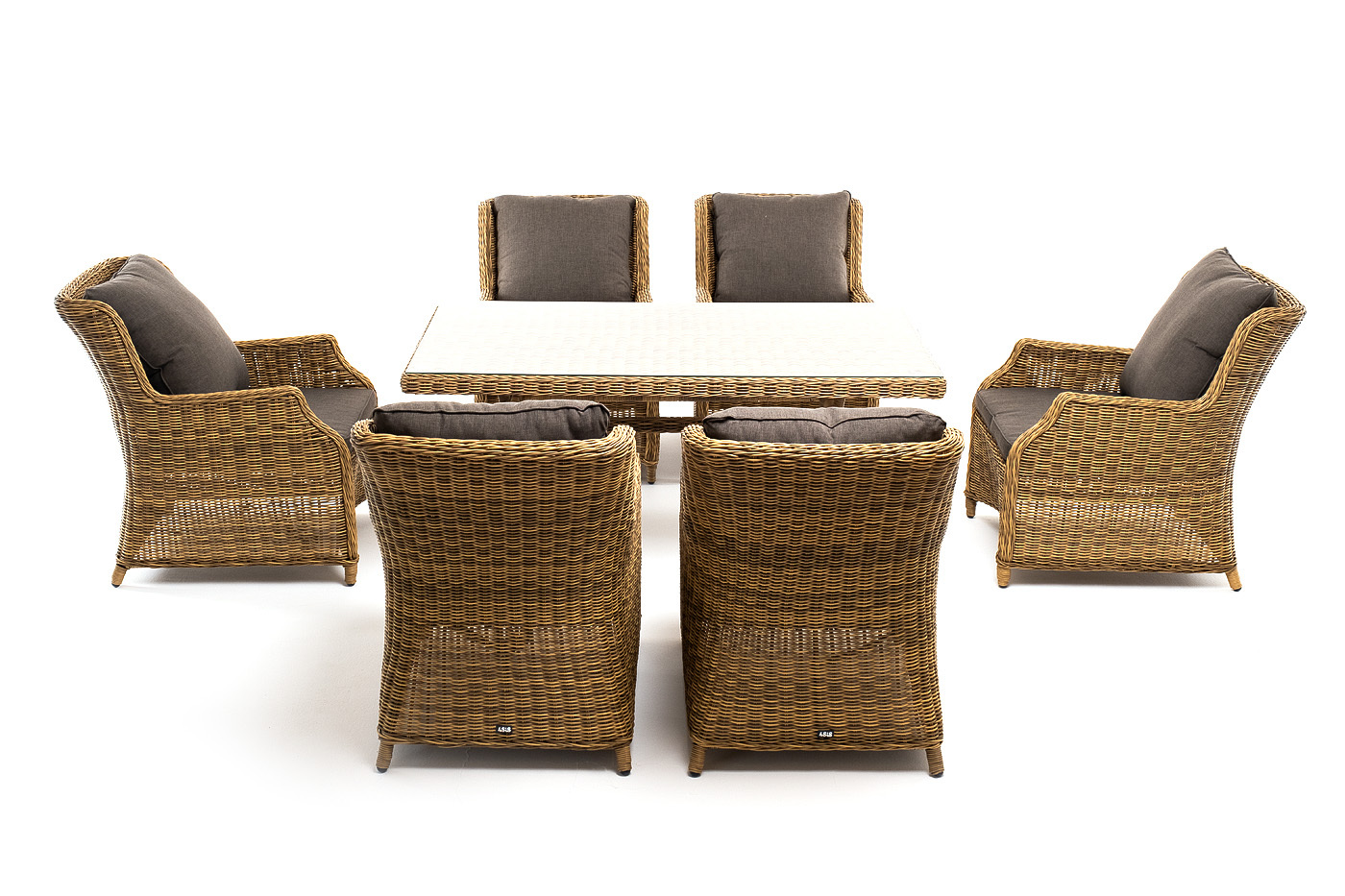Обеденная группа «Неаполь» на 6 персон. В наборе: большой обеденный стол (1600×900×750 мм) и 6 стульев (650×900×920 мм). Каркас всех изделий выполнен из легкого и долговечного алюминия, оплетенного вручную круглым искусственным ротангом натурального соломенного цвета. Столешница укомплектована ударопрочным стеклом, толщиной 5 мм. Данное стекло крепится к столу при помощи четырех вакуумных силиконовых присосок и поставляется в собранном виде. Плетеные стулья для удобства использования оснащены подлокотниками и подушками серого цвета на спинках и сидениях. Ткань обработана влагоотталкивающей пропиткой. "Латте" плетеный стол из искусственного ротанга 160х90см, цвет соломенный 1шт. 1 600Х900Х750, "Неаполь" плетеный стул из искусственного ротанга, цвет соломенный 6шт. 650Х900Х920,Бренд | 4SIS |