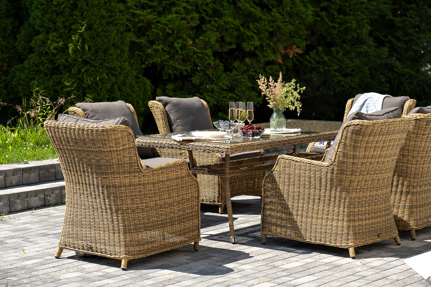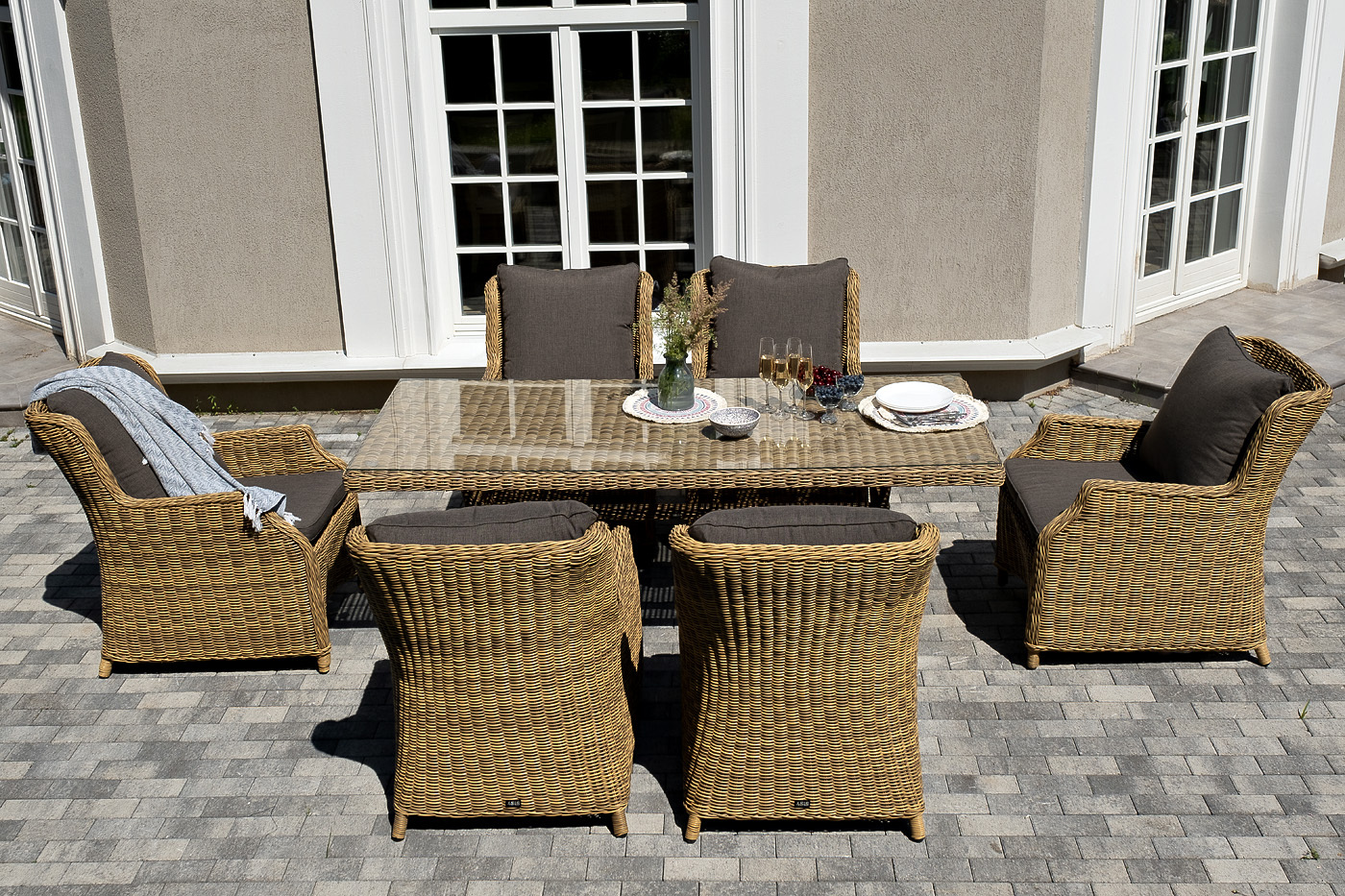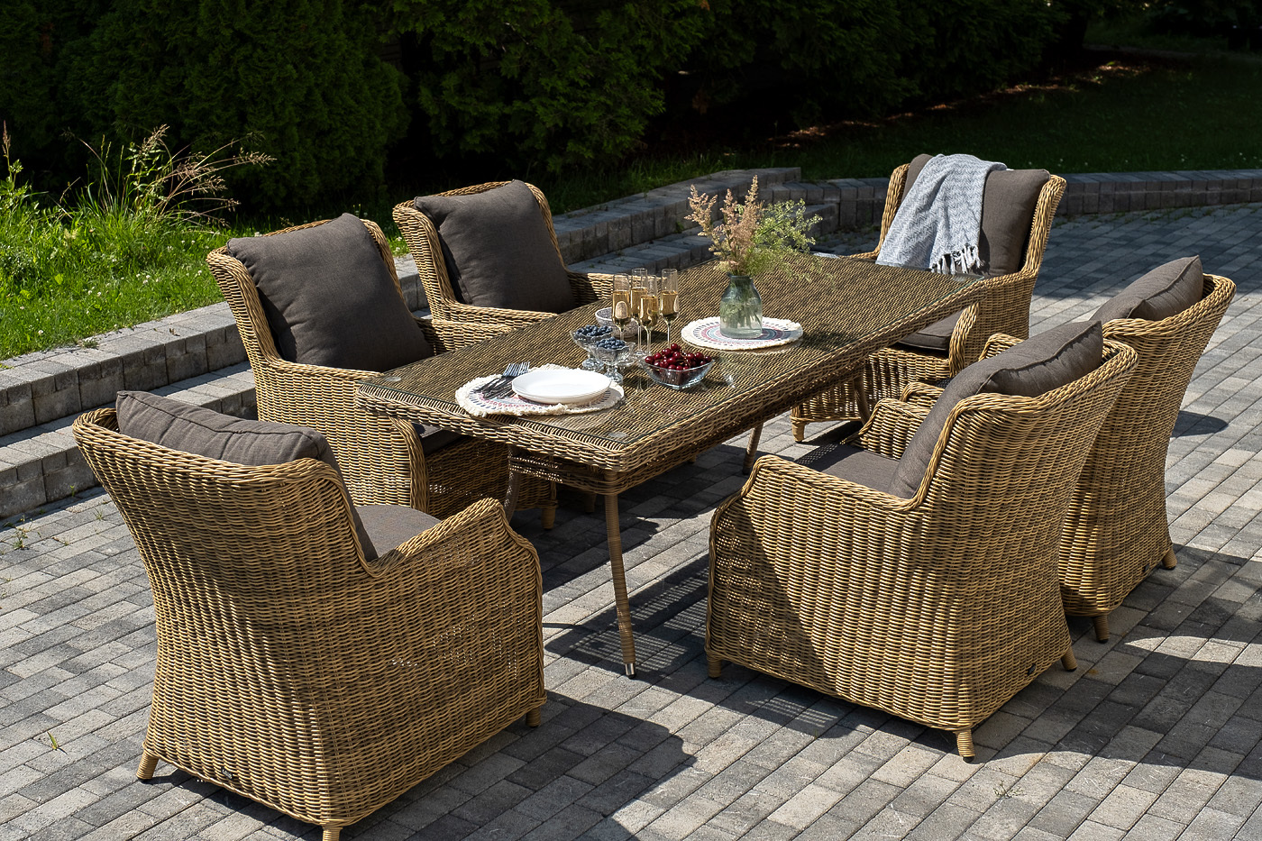 Обеденная группа «Неаполь» на 6 персон. В наборе: большой обеденный стол (1600×900×750 мм) и 6 стульев (650×900×920 мм). Каркас всех изделий выполнен из легкого и долговечного алюминия, оплетенного вручную круглым искусственным ротангом натурального соломенного цвета. Столешница укомплектована ударопрочным стеклом, толщиной 5 мм. Данное стекло крепится к столу при помощи четырех вакуумных силиконовых присосок и поставляется в собранном виде. Плетеные стулья для удобства использования оснащены подлокотниками и подушками серого цвета на спинках и сидениях. Ткань обработана влагоотталкивающей пропиткой. "Латте" плетеный стол из искусственного ротанга 160х90см, цвет соломенный 1шт. 1 600Х900Х750, "Неаполь" плетеный стул из искусственного ротанга, цвет соломенный 6шт. 650Х900Х920,Бренд | 4SIS |