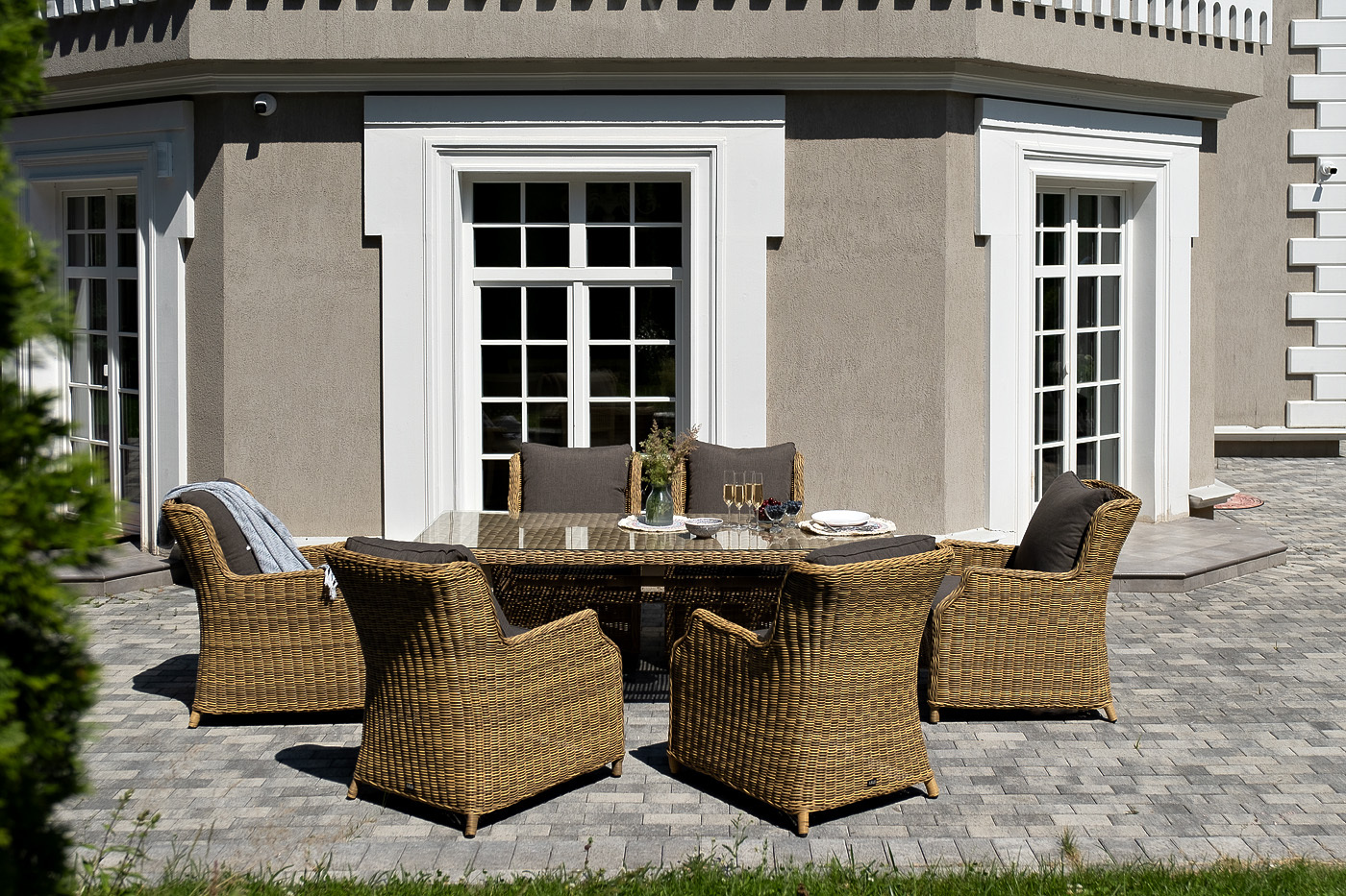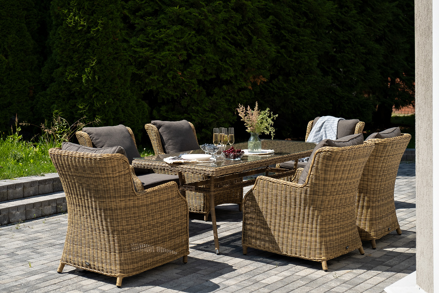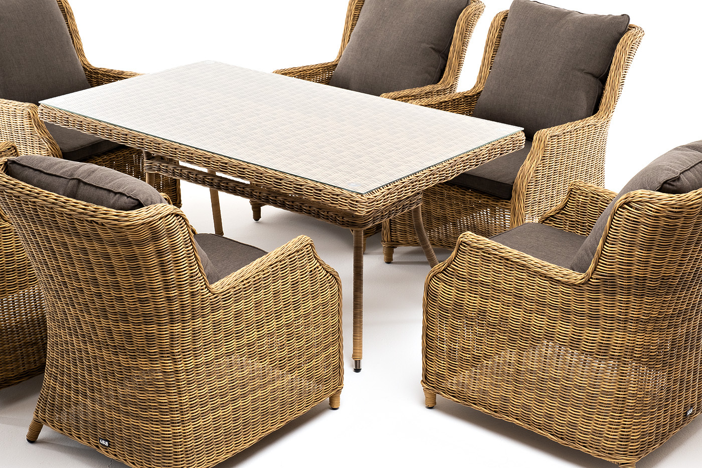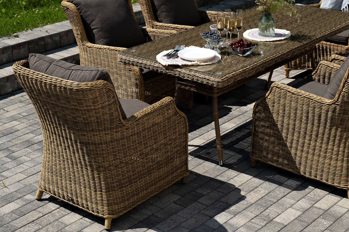 Обеденная группа «Неаполь» на 6 персон. В наборе: большой обеденный стол (1600×900×750 мм) и 6 стульев (650×900×920 мм). Каркас всех изделий выполнен из легкого и долговечного алюминия, оплетенного вручную круглым искусственным ротангом натурального соломенного цвета. Столешница укомплектована ударопрочным стеклом, толщиной 5 мм. Данное стекло крепится к столу при помощи четырех вакуумных силиконовых присосок и поставляется в собранном виде. Плетеные стулья для удобства использования оснащены подлокотниками и подушками серого цвета на спинках и сидениях. Ткань обработана влагоотталкивающей пропиткой. "Латте" плетеный стол из искусственного ротанга 160х90см, цвет соломенный 1шт. 1 600Х900Х750, "Неаполь" плетеный стул из искусственного ротанга, цвет соломенный 6шт. 650Х900Х920,Бренд | 4SIS |