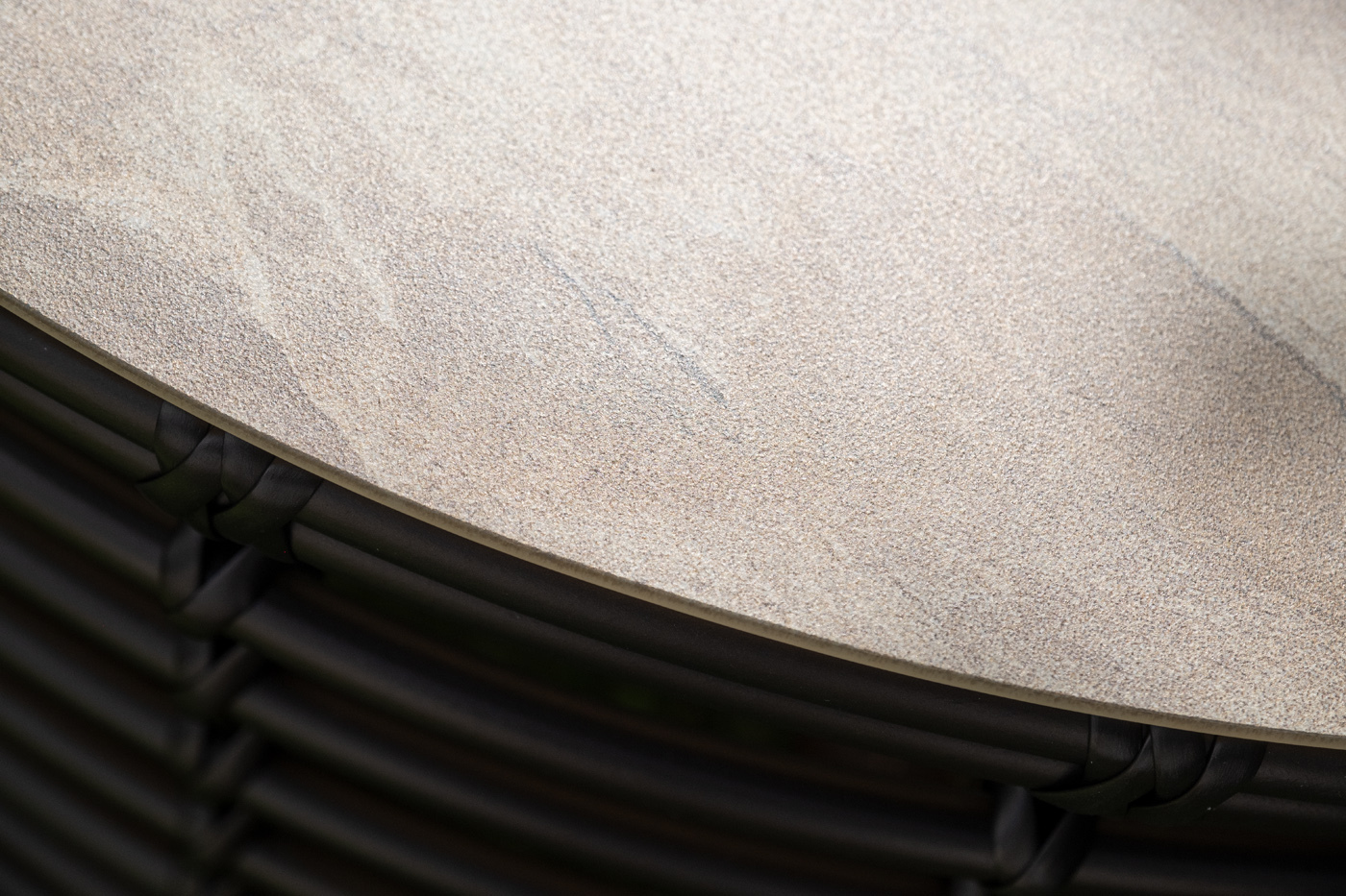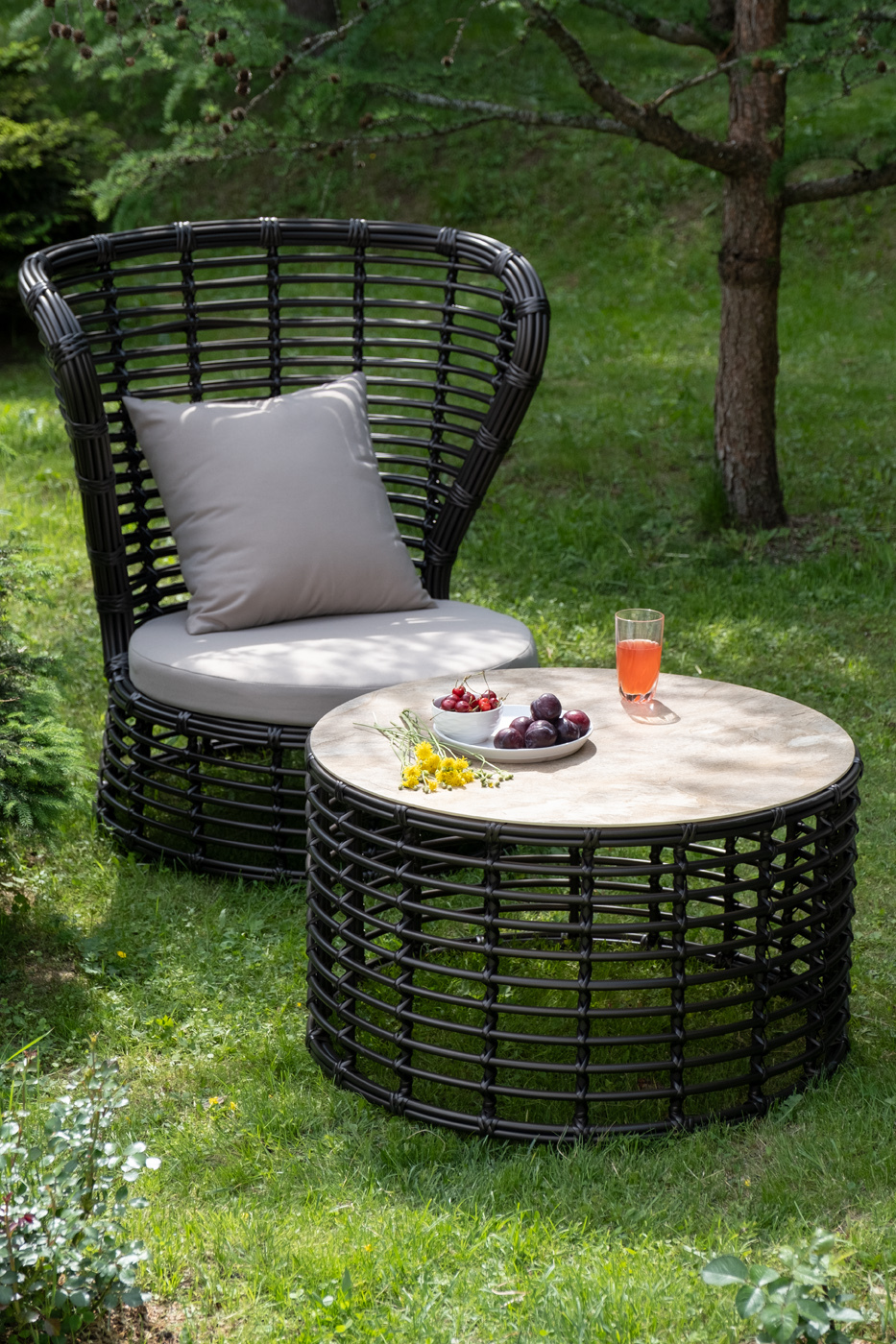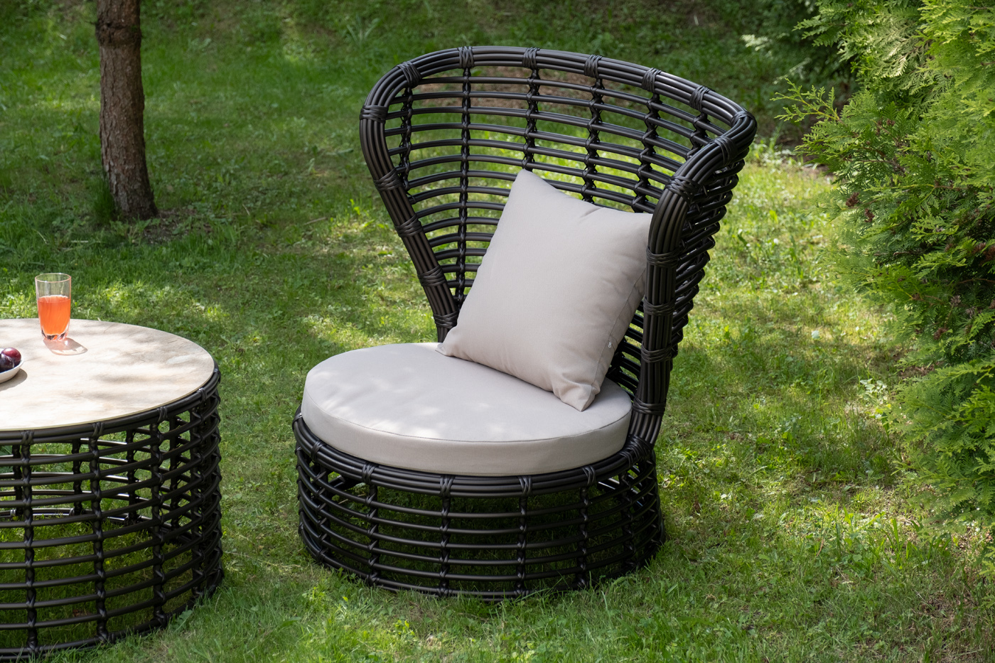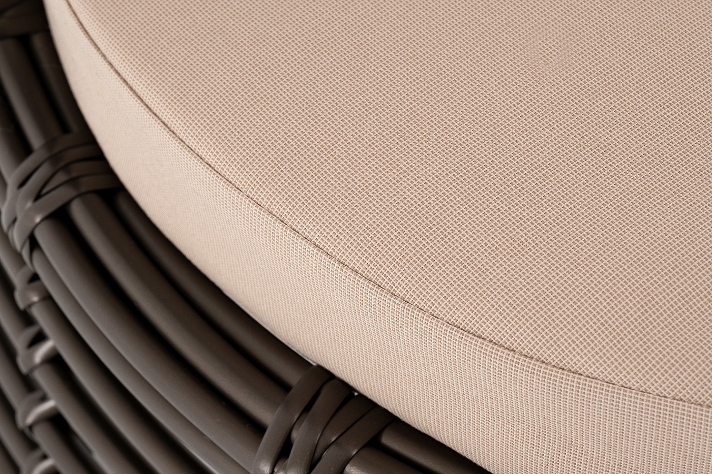 Кофейный комплект «Парма» рассчитан на 2 персоны и подходит для расположения на балконе, в небольших гостиных, на террасе и других местах с ограниченным пространством. В основе каркас из алюминия. В состав входят: – круглый стол 900×900×450 мм (толщина стеклянной столешницы в 0,5 см). – 2 кресла - 1070×1020×1130 мм. Плетение выполнено вручную круглым искусственным ротангом бронзового цвета, кресло укомплектовано подушками из 100% полиэстера, которые пропитаны специальным составом, обладающим влагоотталкивающим свойством. "Парма" журнальный столик из искусственного ротанга, цвет бронзовый 1шт. 900Х900Х450, "Парма" кресло из искусственного ротанга, цвет бронзовый 2шт. 1 070Х1 020Х1 130,Бренд | 4SIS |