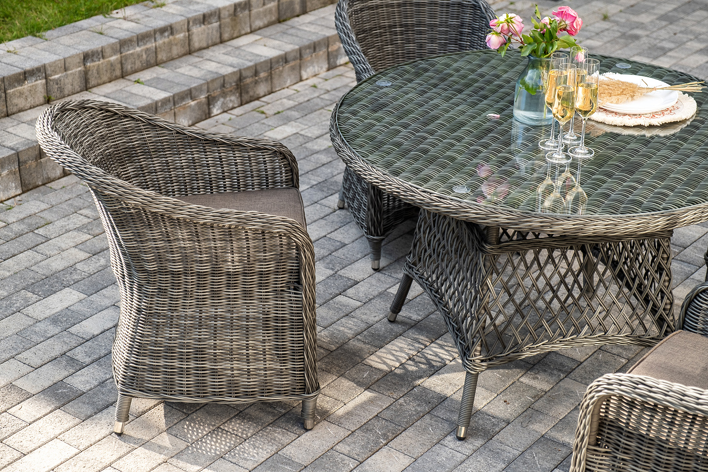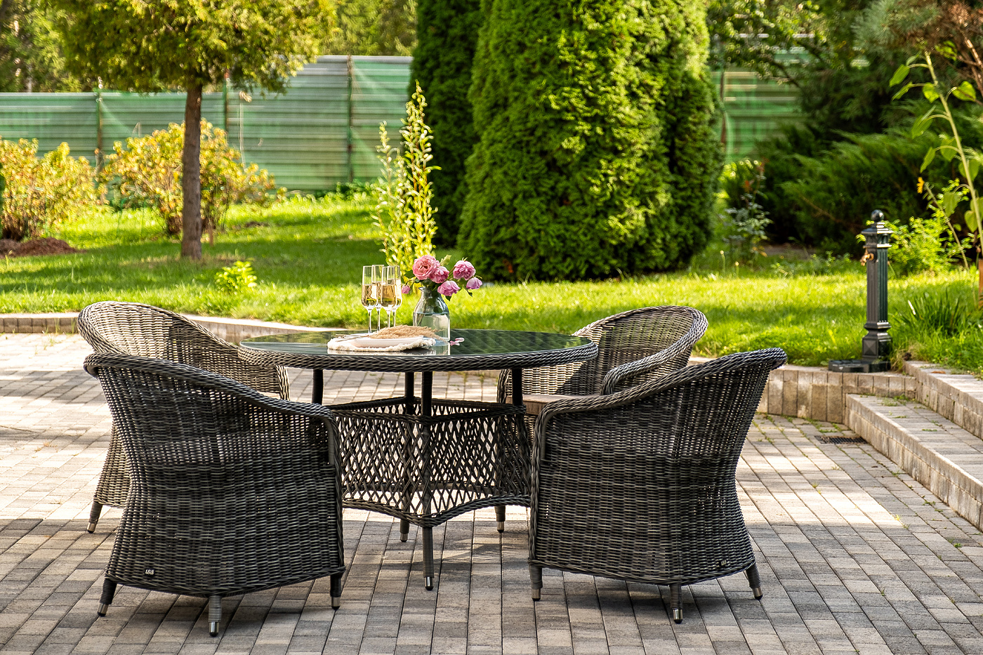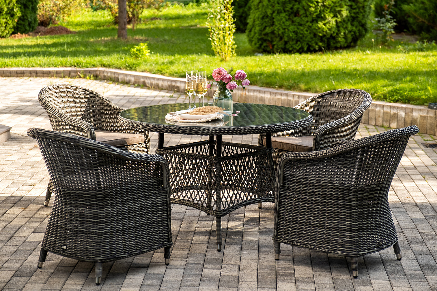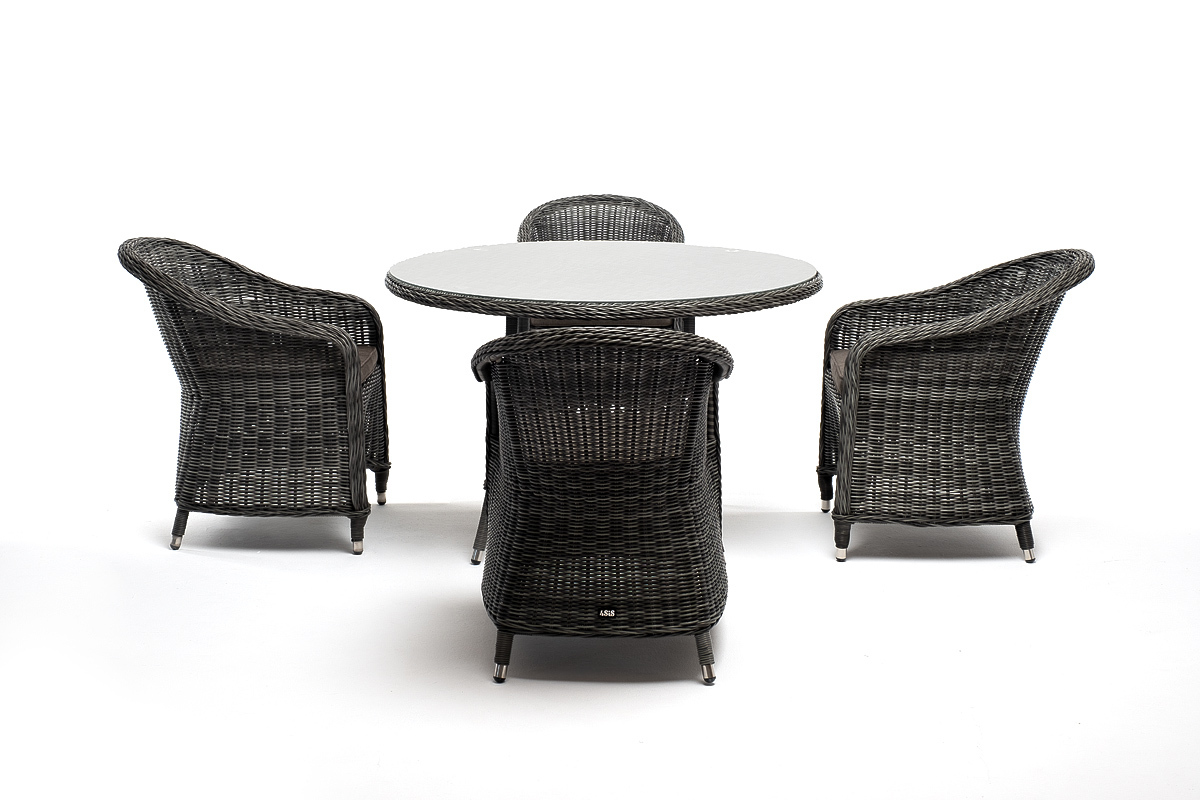 Уличная обеденная группа «Эспрессо» для обустройства зоны отдыха. В комплект входит: - круглый обеденный стол «Эспрессо» (1180×1180×750 мм) с ударопрочной стеклянной столешницей; - 4 кресел коллекции «Равенна» (570×680×810 мм). Вся мебель изготовлена из алюминия, поэтому ее очень легко перемещать. Декоративное покрытие выполнено из долговечного искусственного ротанга, устойчивого к перепадам температур и переменам погоды. Столешница изготовлена из прочного закаленного стекла 5 мм, кресла укомплектованы подушками серого цвета со съёмными чехлами. "Эспрессо" плетеный круглый стол, диаметр 118 см, цвет графит 1шт. 1 180Х1 180Х750, "Равенна" плетеное кресло из искусственного ротанга, цвет графит 4шт. 570Х680Х810,Бренд | 4SIS |