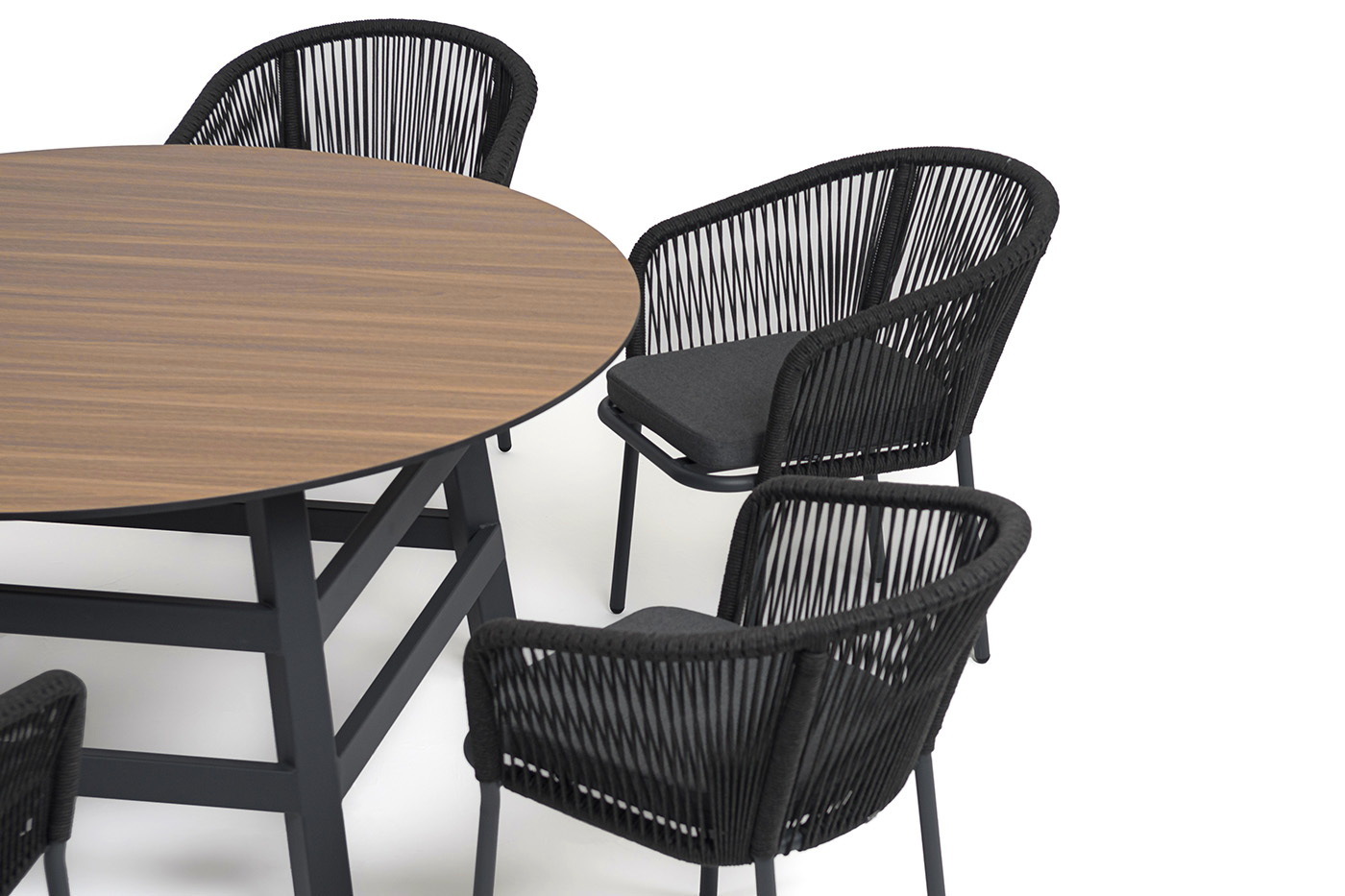 Обеденная группа «Рио» рассчитан на 6 персон. В состав комплекта входит: - Стол обеденный 160х160см, H75, цвет «дуб» - 6 плетеных стульев «Марсель» из роупа, размером - 570×620×775 мм, цвет роупа - темно-серый, каркас из алюминия, окрашен порошковой краской в темно-серый оттенок. "Рио" стол из HPL круглый Ø160см, H75, цвет столешницы "дуб" 1шт. 1 600Х1 600Х750, "Марсель" стул плетеный из роупа, каркас алюминий темно-серый (RAL7024) муар, роуп темно-серый круглый, ткань темно-серая 027 6шт. 570Х620Х775,Бренд | 4SIS |
