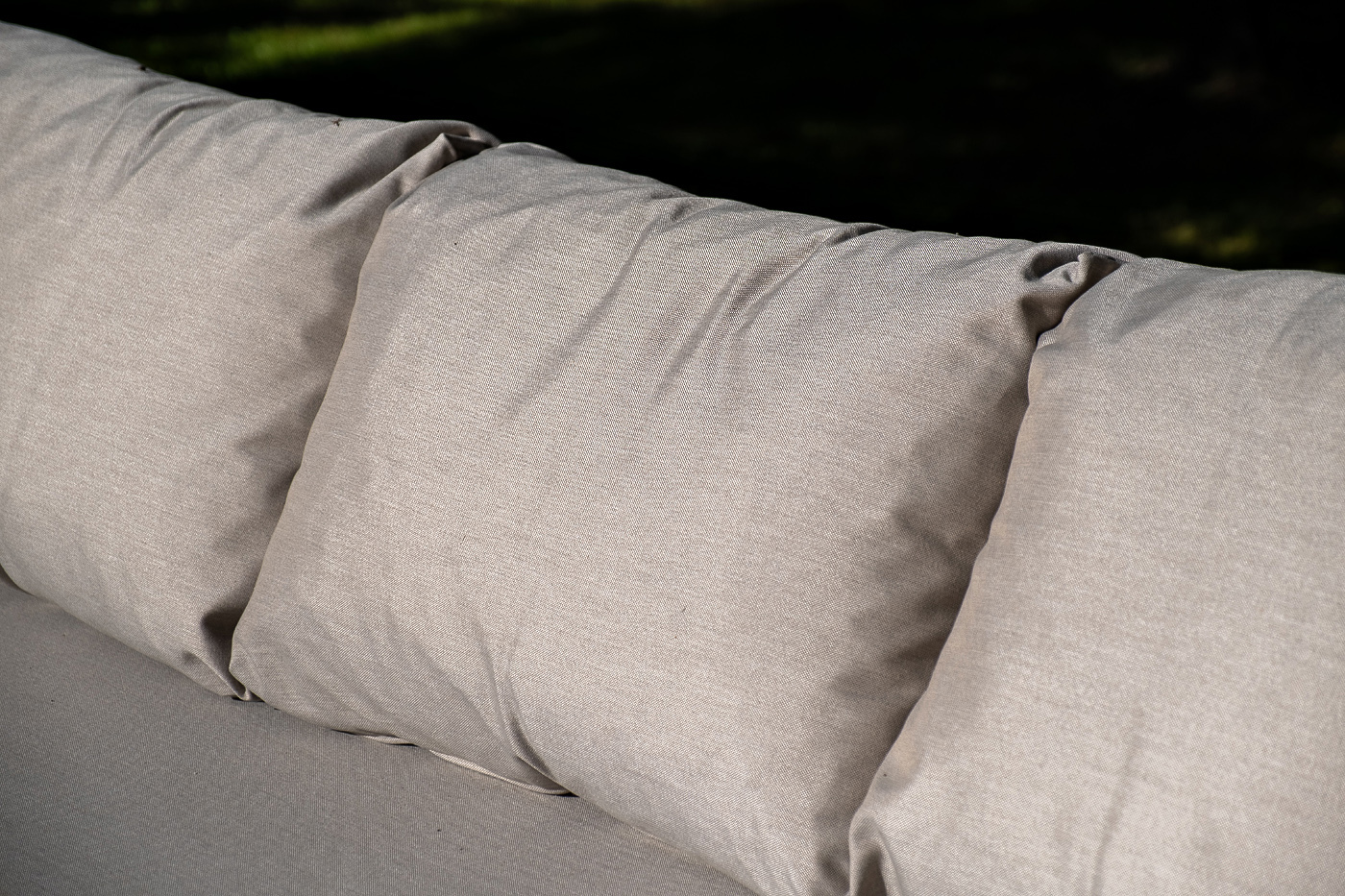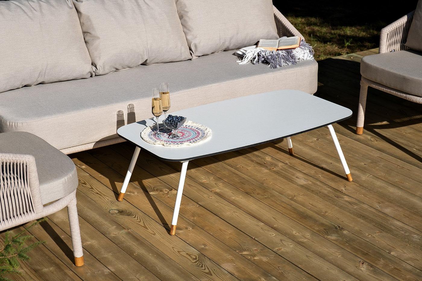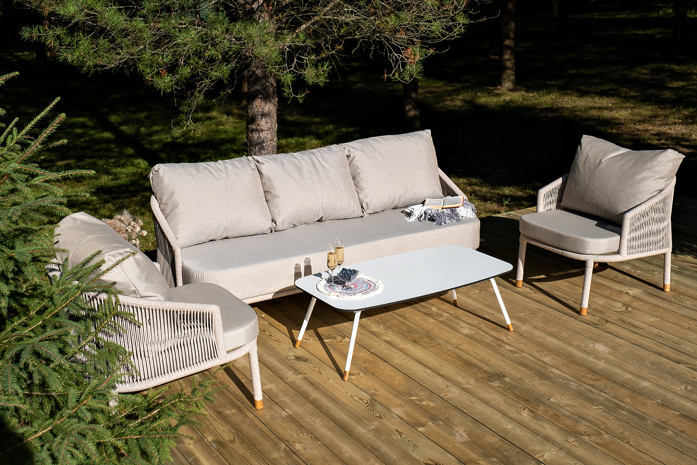 Лаунж-зона «Верона» предназначена для размещения пяти персон. Она включает в себя: - трехместный диван (размер - 2200×890×800 мм). - два плетеных кресла (размер - 760×840×730 мм). - журнальный столик (размер - 1200×650×400 мм). Каркас уличной мебели выполнен из износостойкого алюминия. Его дополняет бежевая ручная оплетка, изготовленная на основе эластичных синтетических лент из полиэфирных волокон высокой прочности (роупа). На ножках дивана, кресел и журнального столика идут дубовые наконечники (заглушки). Кресла и диван идут в комплекте с мягкими подушками в чехлах бежевого цвета. "Верона" журнальный стол из HPL 120х65, H40, каркас белый муар, цвет столешницы "молочный" 1шт. 1 200Х650Х400, "Верона" диван 3-местный плетеный из роупа, каркас алюминий белый муар, роуп бежевый круглый, ткань бежевая 15052 1шт. 2 140Х890Х800, "Верона" кресло плетеное из роупа, каркас алюминий белый муар, роуп бежевый круглый, ткань бежевая 15052 2шт. 760Х840Х730,Бренд | 4SIS |