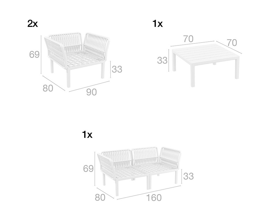 КомплектPortofino LoungeSet от турецкой фабрикиSiesta Contractпредставляет собой стильное и надежное решение для уличного использования в сферах HoReCa и Contract. Выполненная из высококачественного полипропилена, армированного стекловолокном, мебель комплекта отличается исключительной прочностью и устойчивостью к воздействию внешней среды. Благодаря новейшим технологиям формования пластмасс под давлением, материал устойчив к выцветанию и деформации, а нескользящие ножки обеспечивают безопасность и стабильность как внутри помещений, так и на улице. Особый акцент сделан на обволакивающей спинке, плавно переходящей в подлокотники, с 3D-эффектом плетения из плоского роупа, что придает мебели современный вид и визуально напоминает натуральное плетение, сохраняя при этом преимущества пластика. Пластиковый комплект Portofino с эффектом плетениястанет отличным выбором для обстановки фуд-кортов, кафе, ресторанов и баров. Благодаря использованию высококачественных материалов, ондолгое время не теряет своего привлекательного внешнего вида, даже несмотря на активную эксплуатацию. Подушки на сиденье (толщина 150 мм) и спинке (толщина 190 мм) покрытыполиэстеровой тканьюEtisilkи отделаны кантом. Обеспечивают дополнительное удобство и комфорт сидящему. Состав комплекта: Двухместный диван с подушками, размер: 1600х800х690 мм - 1 шт. Кресло с подушками, размер: 900х800х690 мм - 2 шт. Журнальный столик, размер: 700х700х330 мм - 1 шт. Особенности: изготовлениз высококачественного полипропилена, упрочненного стекловолокном; не имеет металлического каркаса - не ржавеет, не поддается коррозии; устойчивк ультрафиолету и атмосферным осадкам, выдерживает минусовую температуру до 20 градусов; подходит для использования на открытом воздухе и в помещении; подушки изготовлены из синтетической ткани, произведенной из полиэфирных волокон; ткань легкая, хорошо сохраняет форму; ткань устойчива к воздействию тепла и ультрафиолета; ткань мало мнется и легко стирается; спинка и подлокотники крепятся с любой стороны сиденья безвинтовым способом. Для уточнения всех возможных вариантов материала и цвета данного изделия обращайтесь к нашим менеджерам.Характеристики