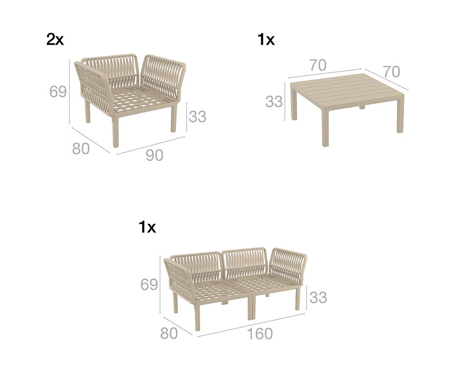 КомплектPortofino LoungeSet от турецкой фабрикиSiesta Contractпредставляет собой стильное и надежное решение для уличного использования в сферах HoReCa и Contract. Выполненная из высококачественного полипропилена, армированного стекловолокном, мебель комплекта отличается исключительной прочностью и устойчивостью к воздействию внешней среды. Благодаря новейшим технологиям формования пластмасс под давлением, материал устойчив к выцветанию и деформации, а нескользящие ножки обеспечивают безопасность и стабильность как внутри помещений, так и на улице. Особый акцент сделан на обволакивающей спинке, плавно переходящей в подлокотники, с 3D-эффектом плетения из плоского роупа, что придает мебели современный вид и визуально напоминает натуральное плетение, сохраняя при этом преимущества пластика. Пластиковый комплект Portofino с эффектом плетениястанет отличным выбором для обстановки фуд-кортов, кафе, ресторанов и баров. Благодаря использованию высококачественных материалов, ондолгое время не теряет своего привлекательного внешнего вида, даже несмотря на активную эксплуатацию. Подушки на сиденье (толщина 150 мм) и спинке (толщина 190 мм) покрытыполиэстеровой тканьюEtisilkи отделаны кантом. Обеспечивают дополнительное удобство и комфорт сидящему. Состав комплекта: Двухместный диван с подушками, размер: 1600х800х690 мм - 1 шт. Кресло с подушками, размер: 900х800х690 мм - 2 шт. Журнальный столик, размер: 700х700х330 мм - 1 шт. Особенности: изготовлениз высококачественного полипропилена, упрочненного стекловолокном; не имеет металлического каркаса - не ржавеет, не поддается коррозии; устойчивк ультрафиолету и атмосферным осадкам, выдерживает минусовую температуру до 20 градусов; подходит для использования на открытом воздухе и в помещении; подушки изготовлены из синтетической ткани, произведенной из полиэфирных волокон; ткань легкая, хорошо сохраняет форму; ткань устойчива к воздействию тепла и ультрафиолета; ткань мало мнется и легко стирается; спинка и подлокотники крепятся с любой стороны сиденья безвинтовым способом. Для уточнения всех возможных вариантов материала и цвета данного изделия обращайтесь к нашим менеджерам.Характеристики