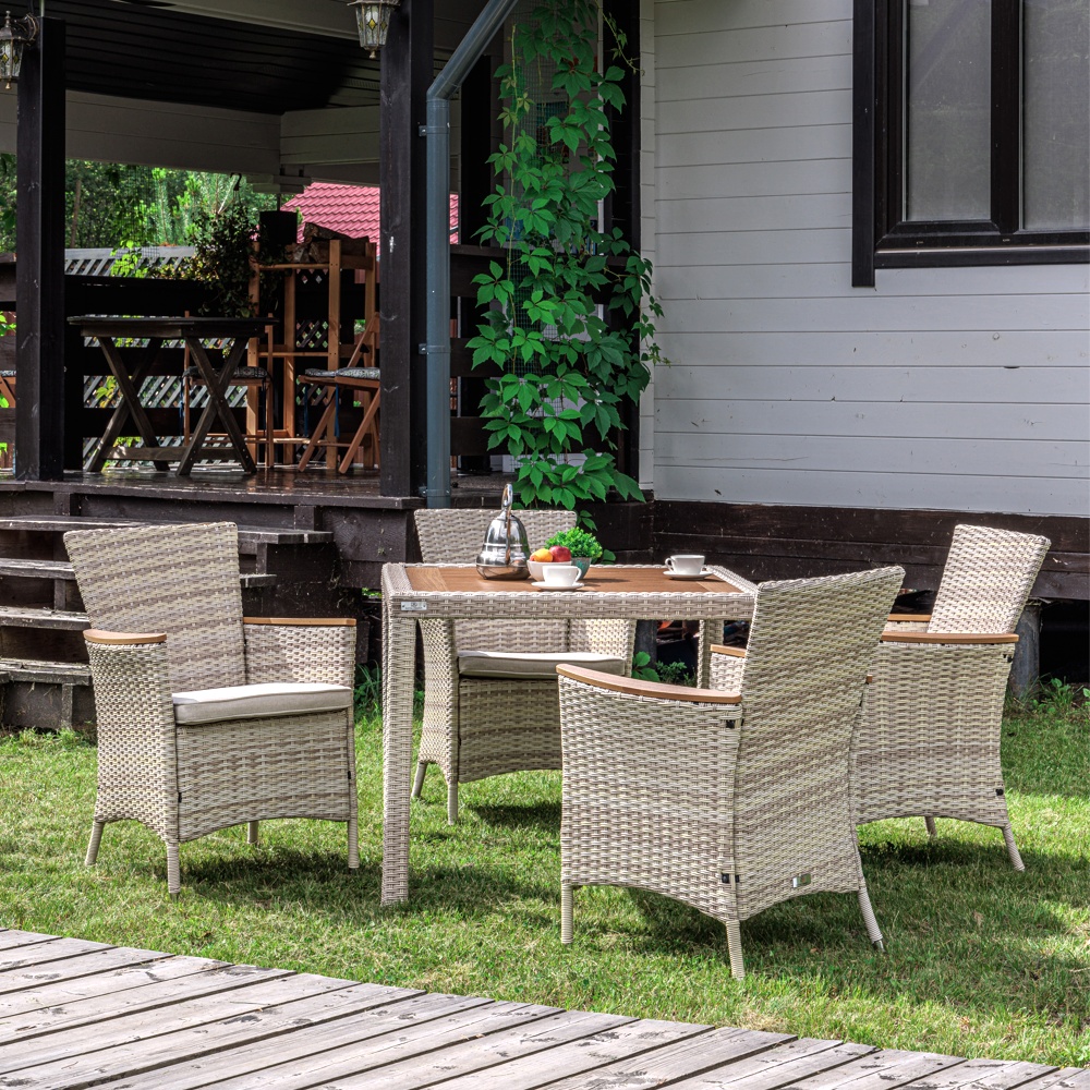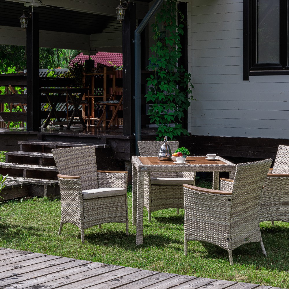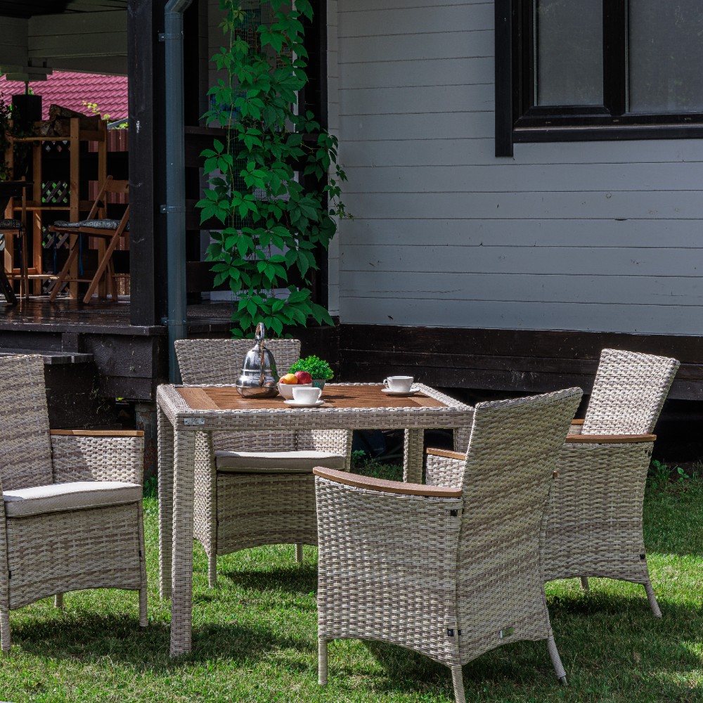 Комплектация и габариты: Кресла (4 шт) - 60х60х88 см Обеденный стол - 90х90х75 см Материалы: Материал комплекта - искусственный ротанг (ручного плетения) Материал каркаса – сталь, окрашенная порошковым методом Материал столешницы - поливуд (искусственное дерево) Материал чехла на подушки - олефин (водоотталкивающая ткань) Материал наполнителя подушек для сидения - поролон Цвет комплекта - бежевый Цвет подушек - бежевый Дополнительная информация: Количество посадочных мест – 4 человек Максимальная нагрузка на посадочное место - 150 кг Чехлы съемные - да Температурный режим - от -50?C до +50?C Сочетается с комплектами бренда ROYAL FAMILY из искусственного ротанга в бежевом цвете Накладки на ножки - да (пластиковые) Категория ротанга - первичная Держатели и крепления подушек зависят от поставки и не являются неотъемлемой частью комплекта Гарантия и эксплуатация: Гарантийный срок - 1 год Эксплуатационный срок - 10 лет Страна производитель - КитайХарактеристики