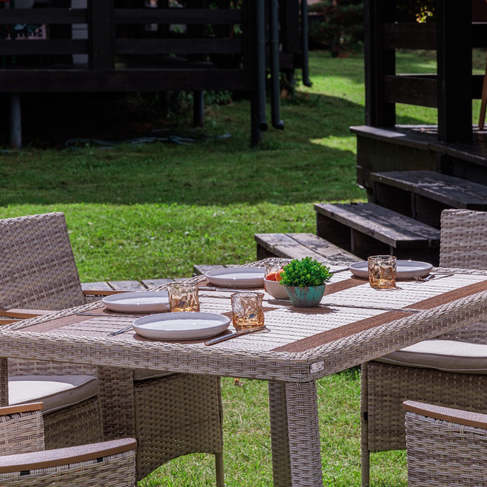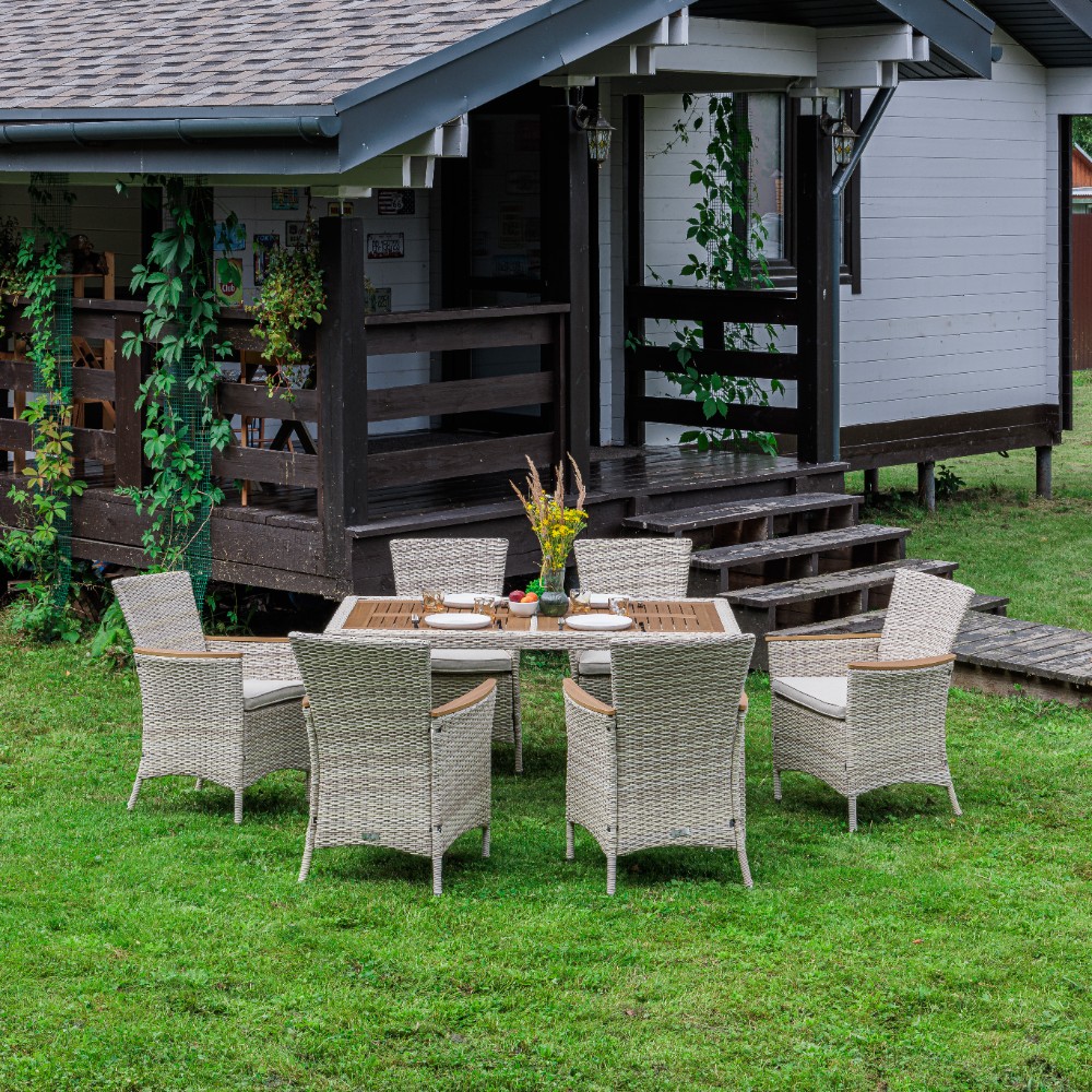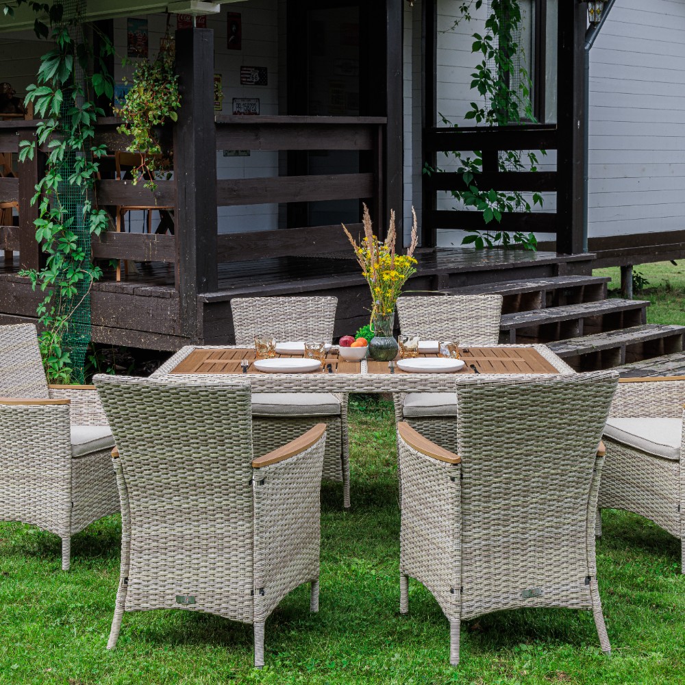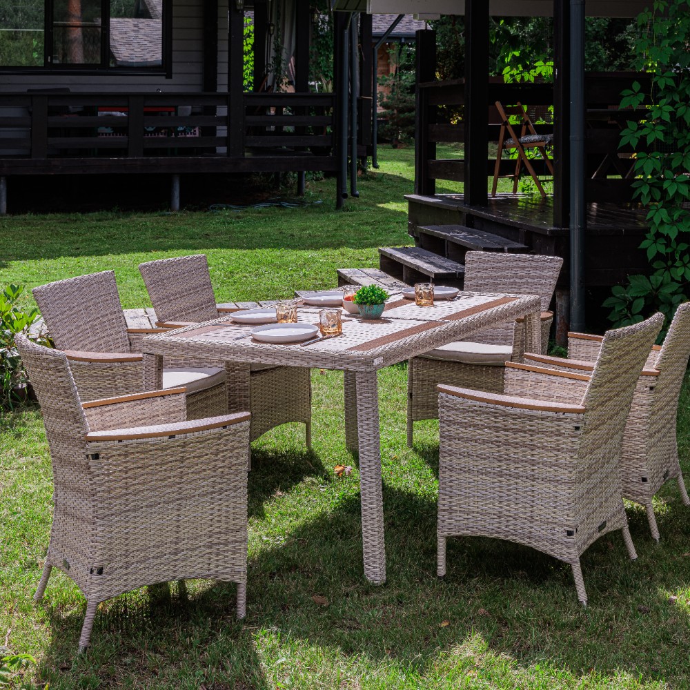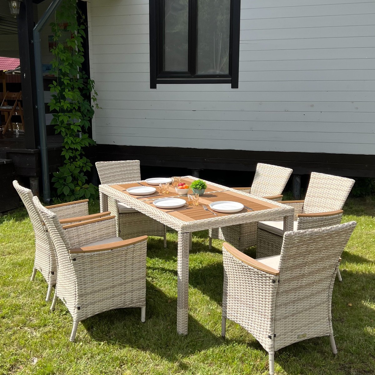 Комплектация и габариты: Кресла (6 шт) - 60х60х88 см Обеденный стол - 150х90х75 см Материалы: Материал комплекта - искусственный ротанг (ручного плетения) Материал каркаса – сталь, окрашенная порошковым методом Материал столешницы - поливуд (искусственное дерево) Материал чехла на подушки - олефин (водоотталкивающая ткань) Материал наполнителя подушек для сидения - поролон Цвет комплекта - бежевый Цвет подушек - бежевый Дополнительная информация: Количество посадочных мест – 6 человек Максимальная нагрузка на посадочное место - 150 кг Чехлы съемные - да Температурный режим - от -50?C до +50?C Сочетается с комплектами бренда ROYAL FAMILY из искусственного ротанга в бежевом цвете Накладки на ножки - да (пластиковые) Категория ротанга - первичная Держатели и крепления подушек зависят от поставки и не являются неотъемлемой частью комплекта Гарантия и эксплуатация: Гарантийный срок - 1 год Эксплуатационный срок - 10 лет Страна производитель - КитайХарактеристики