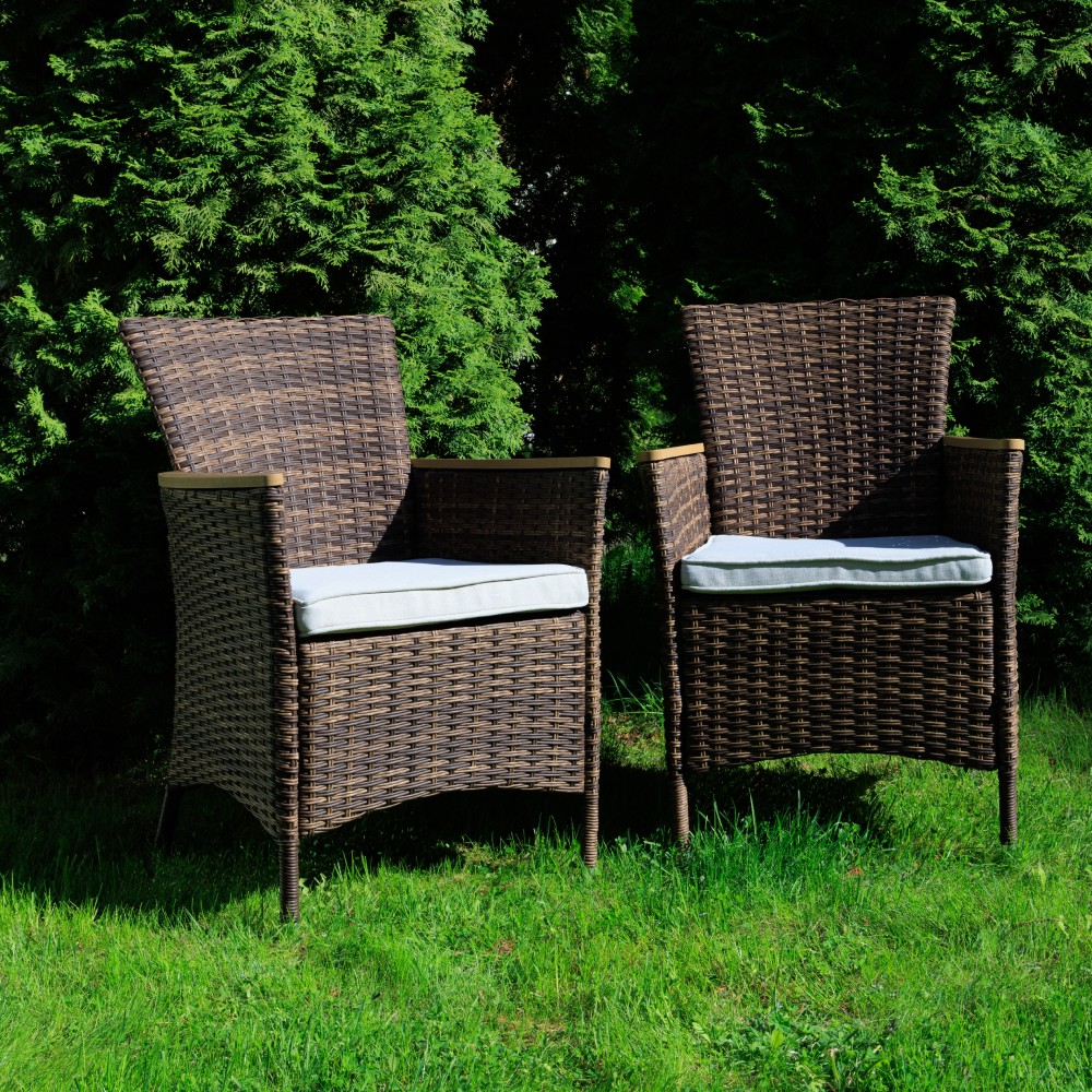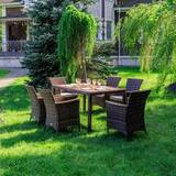 Комплектация и габариты: Кресла (6 шт) - 60х60х88 см Обеденный стол - 150х90х75 см Материалы: Материал комплекта - искусственный ротанг (ручного плетения) Материал каркаса – сталь, окрашенная порошковым методом Материал столешницы - поливуд (искусственное дерево) Материал чехла на подушки - олефин (водоотталкивающая ткань) Материал наполнителя подушек для сидения - поролон Цвет комплекта - коричневый Цвет подушек - бежевый Дополнительная информация: Количество посадочных мест – 6 человек Максимальная нагрузка на посадочное место - 150 кг Чехлы съемные - да Температурный режим - от -50?C до +50?C Сочетается с комплектами бренда ROYAL FAMILY из искусственного ротанга в коричневом цвете Накладки на ножки - да (пластиковые) Категория ротанга - первичная Держатели и крепления подушек зависят от поставки и не являются неотъемлемой частью комплекта Гарантия и эксплуатация: Гарантийный срок - 1 год Эксплуатационный срок - 10 лет Страна производитель - КитайХарактеристики