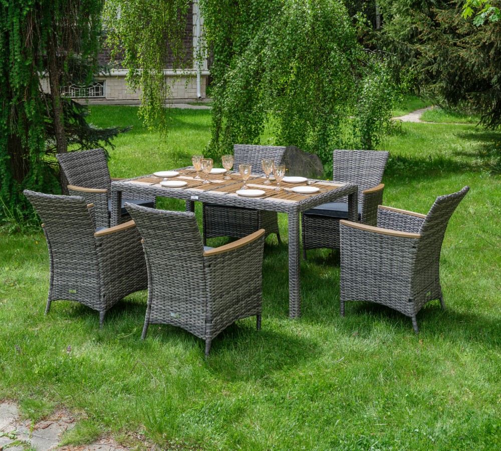 Комплектация и габариты: Кресла ( 6 шт) - 60х60х88 см Обеденный стол - 150х90х75 см Материалы: Материал комплекта - искусственный ротанг (ручного плетения) Материал каркаса – сталь, окрашенная порошковым методом Материал столешницы - поливуд (искусственное дерево) Материал чехла на подушки - олефин (водоотталкивающая ткань) Материал наполнителя подушек для сидения - поролон Цвет комплекта - серый Цвет подушек - серый Дополнительная информация: Количество посадочных мест – 6 человек Максимальная нагрузка на посадочное место - 150 кг Чехлы съемные - да Температурный режим - от -50?C до +50?C Сочетается с комплектами бренда ROYAL FAMILY из искусственного ротанга в сером цвете Накладки на ножки - да (пластиковые) Категория ротанга - первичная Держатели и крепления подушек зависят от поставки и не являются неотъемлемой частью комплекта Гарантия и эксплуатация: Гарантийный срок - 1 год Эксплуатационный срок - 10 лет Страна производитель - КитайХарактеристики