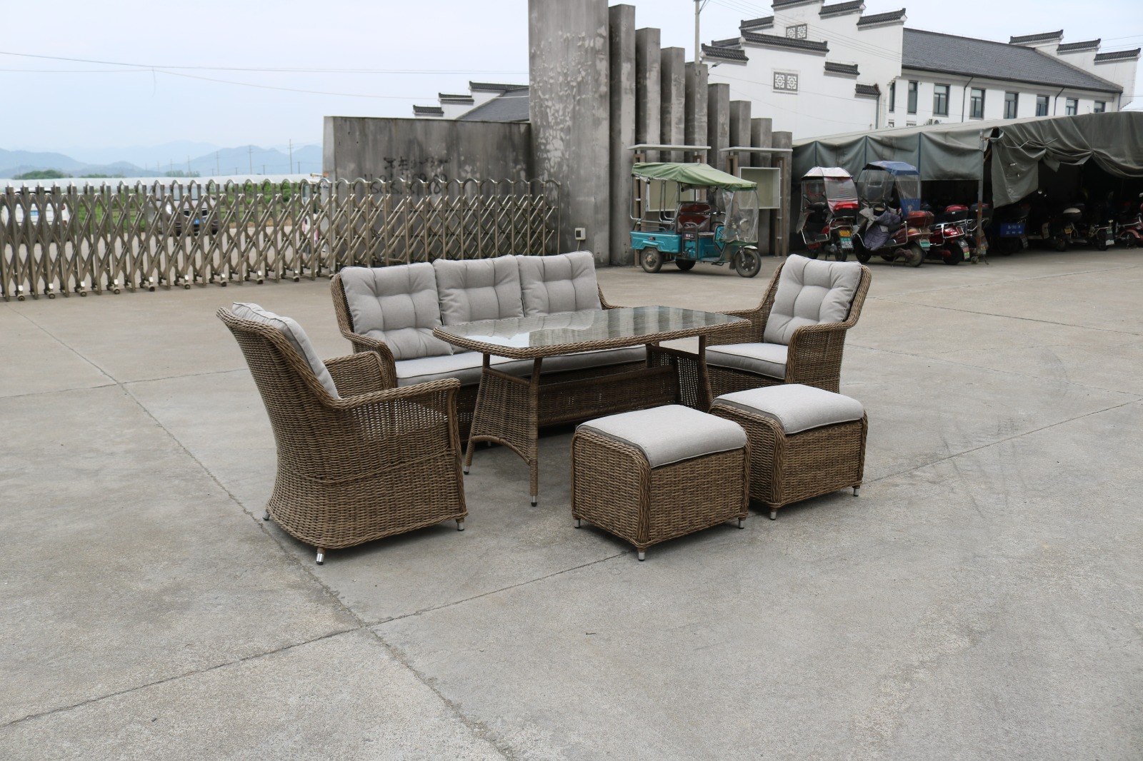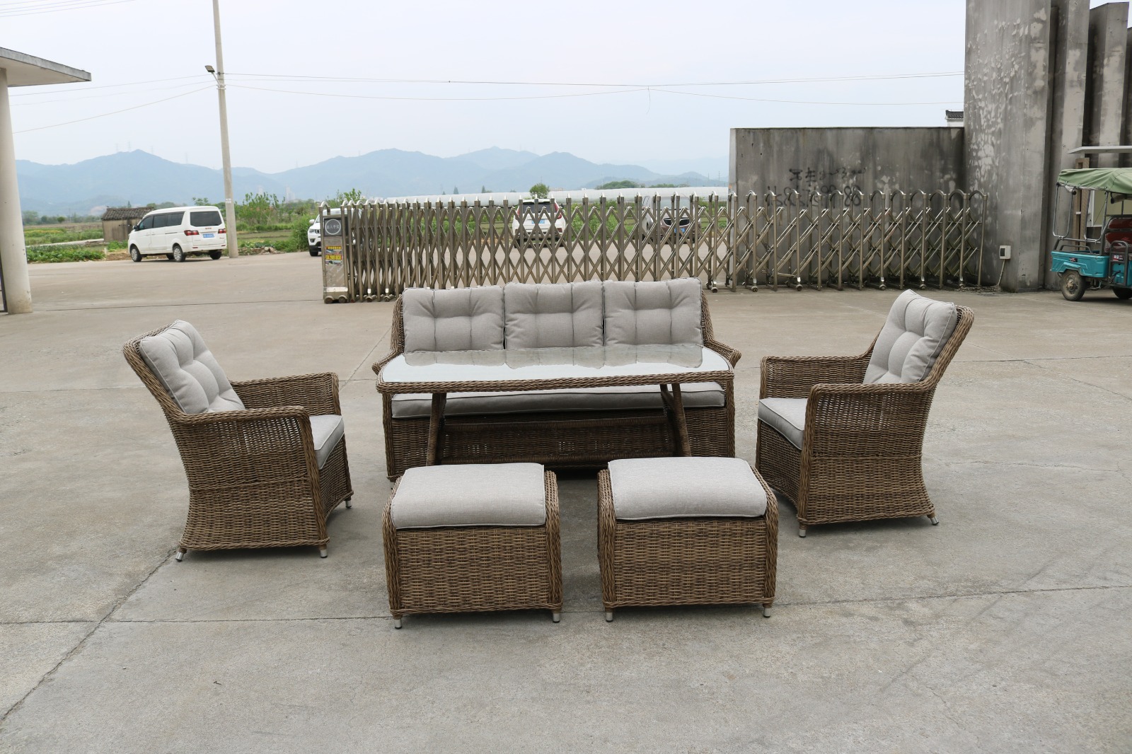 Материалы: Материал комплекта - искусственный ротанг (ручного плетения) Материал каркаса - алюминий Материал столешницы - закаленное стекло Материал чехла на подушки - олефин (водоотталкивающая ткань) Материал наполнителя подушек под спину - синтетический пух Материал наполнителя подушек для сидения - пенополеуретан Цвет комплекта - коричневый Цвет подушек - Светло-серые Дополнительная информация: Количество посадочных мест - 7 человек Максимальная нагрузка на посадочное место - 150 кг Чехлы съемные - да Температурный режим - от -50?C до +50?C Категория ротанга - первичная Гарантия и эксплуатация: Гарантийный срок - 1 год Эксплуатационный срок - 5 лет Страна производитель - КитайХарактеристики