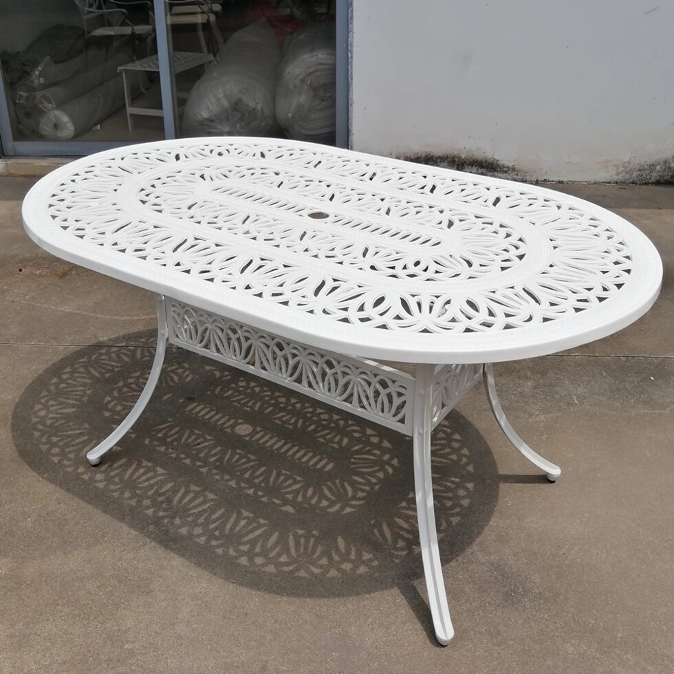 Белый металлический стол из литого алюминия рассчитана на 6 персон, Овальный стол великолепно смотрится в доме, где он займет свое достойное место. Такая металлическая садовая мебель из алюминиевого сплава легкая и неприхотлива к погодным сюрпризам, в отличии от мебели из чугуна или кованой мебели. У данной модели литого стола из алюминия отсутствуют острые углы, что предотвращает от случайных травм.