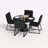 Каркас мебели выполнен из всесезонного алюминия с порошковым покрытием темно-серого цвета (карбон), подушки спинок и сидений стульев обшиты уличной тканью черного цвета с водоотталкивающей пропиткой, толщина подушек 5 см, чехол съемный на "молнии", столешница обеденного стола глянцевая, изготовлена из закаленного стекла толщиной 5 мм, с нанесением черного цвета с помощью шелкотрафаретной печати.